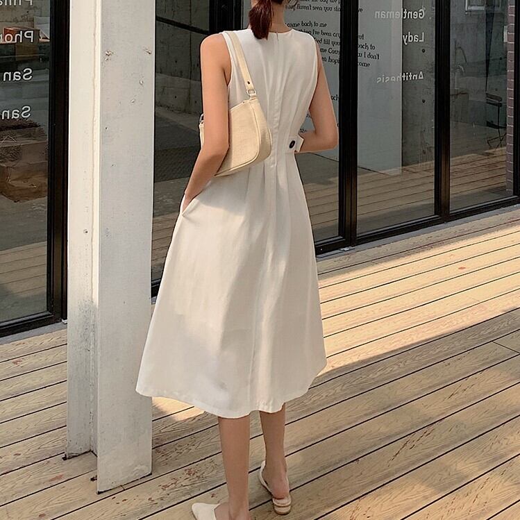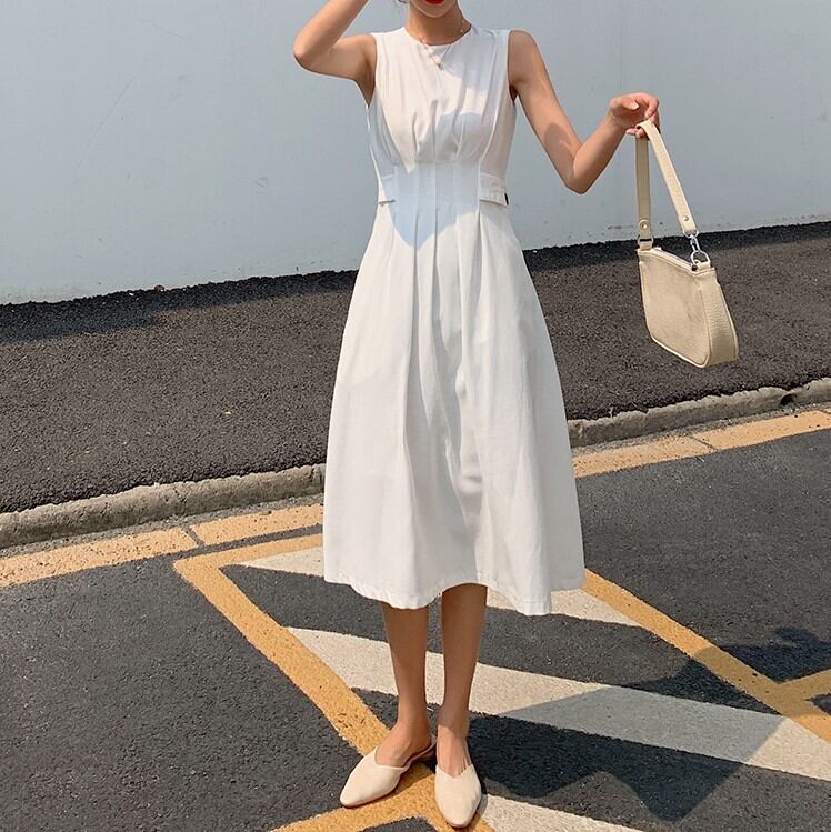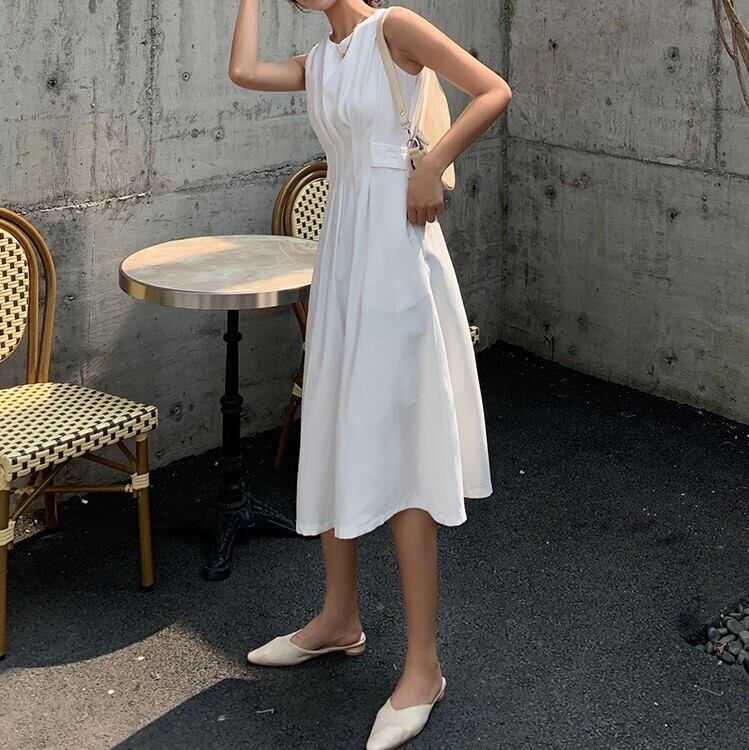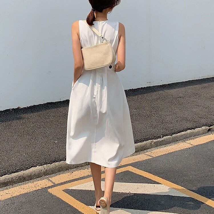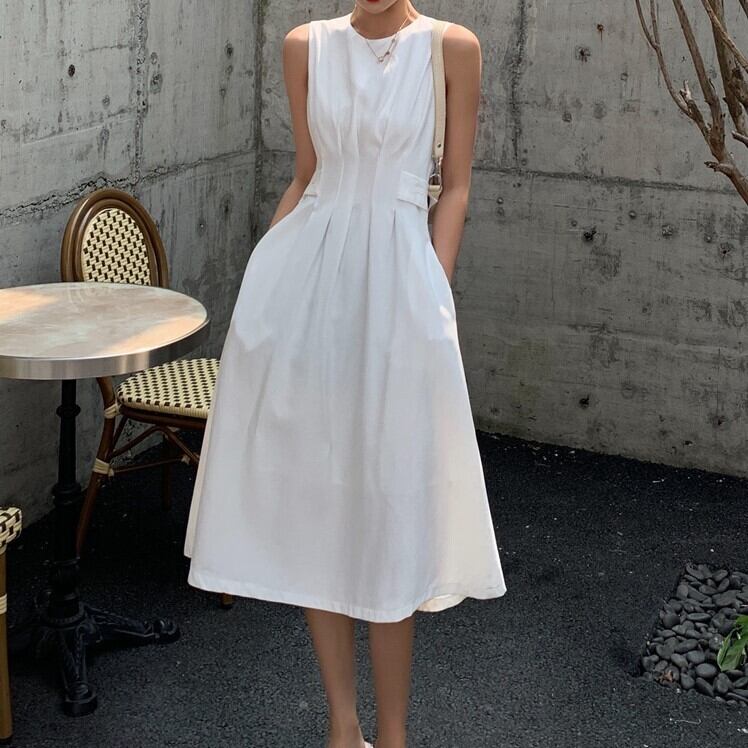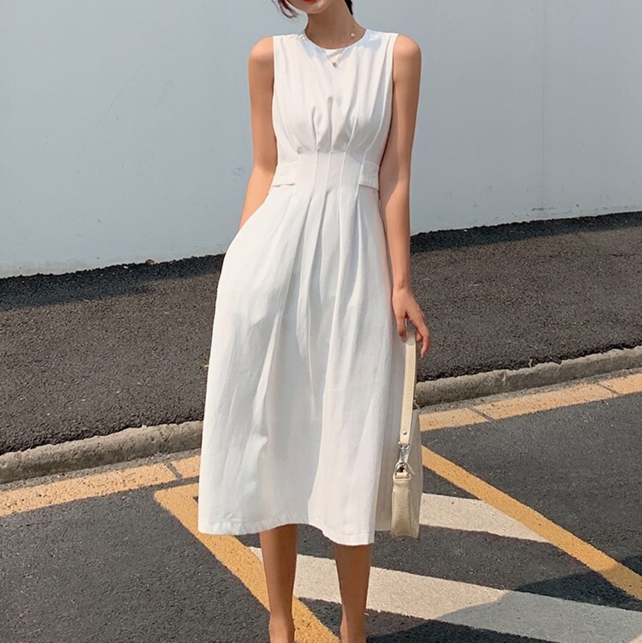 全2色 ノースリーブワンピース リゾートワンピース ドレス ひざ丈 ミディ丈 無地 着痩せ ラウンドネック ゆったり きれいめ フェミニン レトロ デート オフィス 夏 ホワイト ブラック