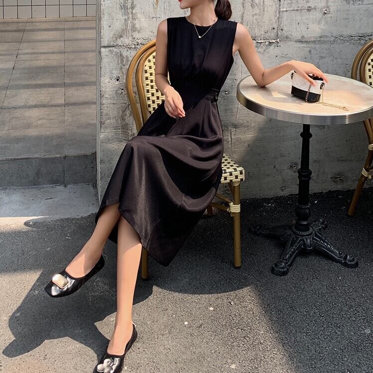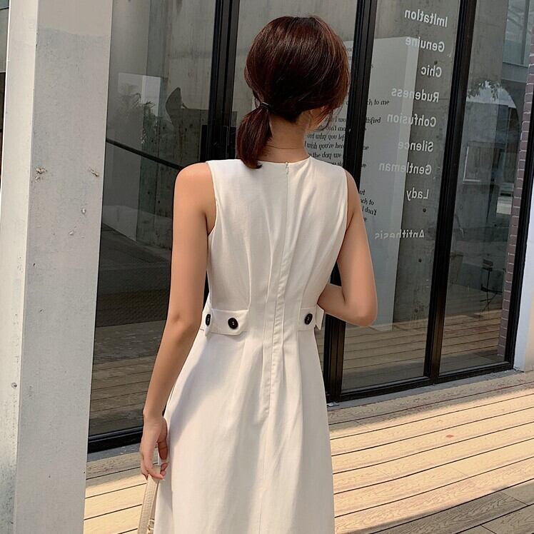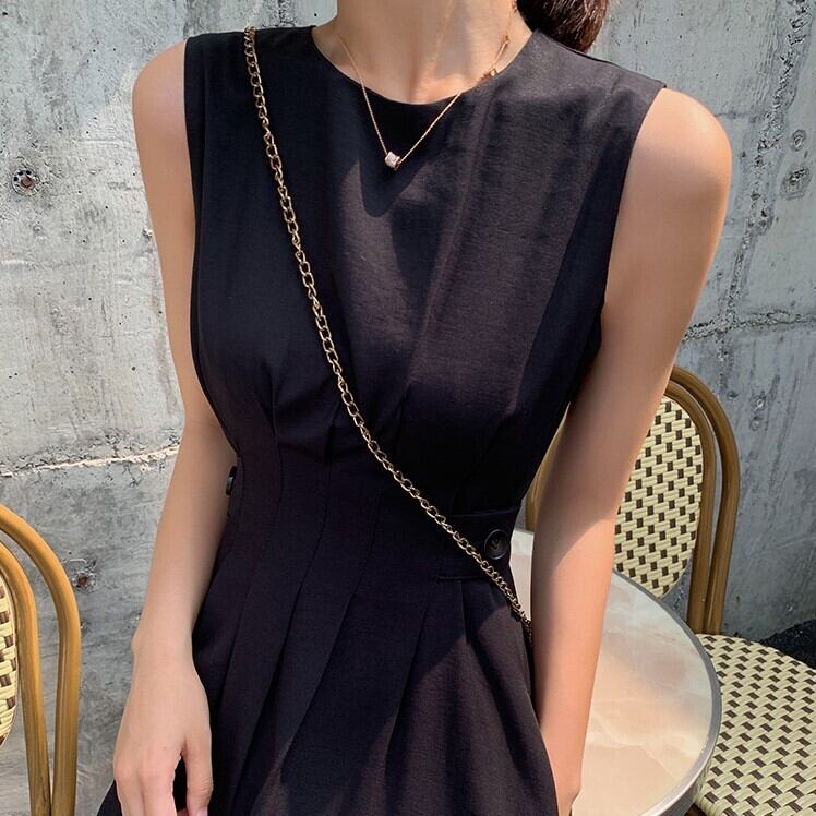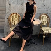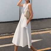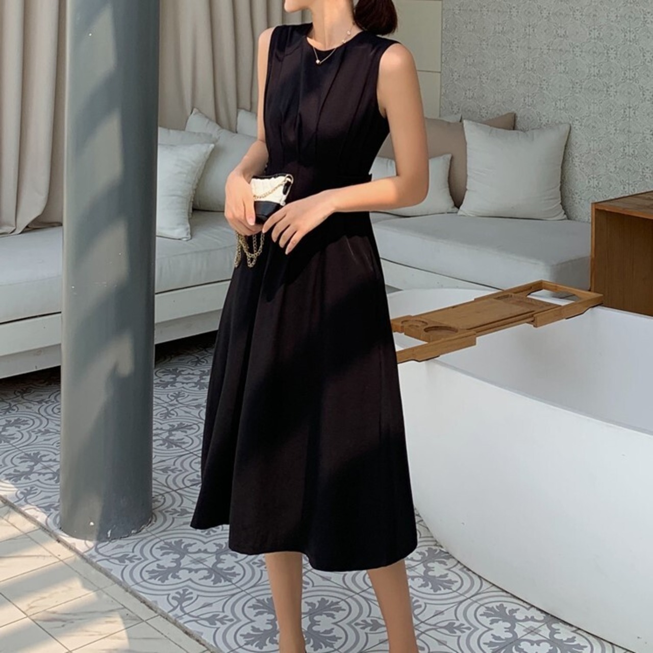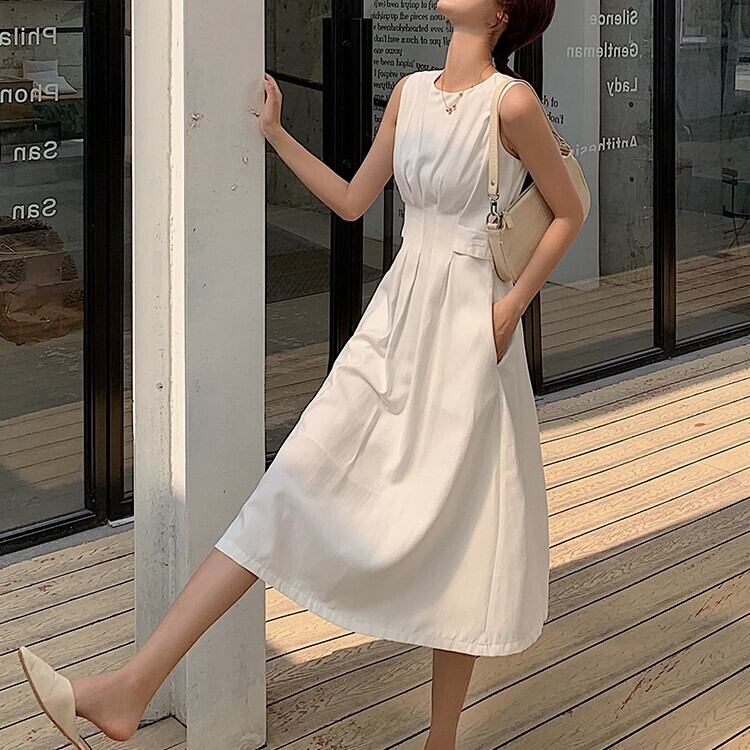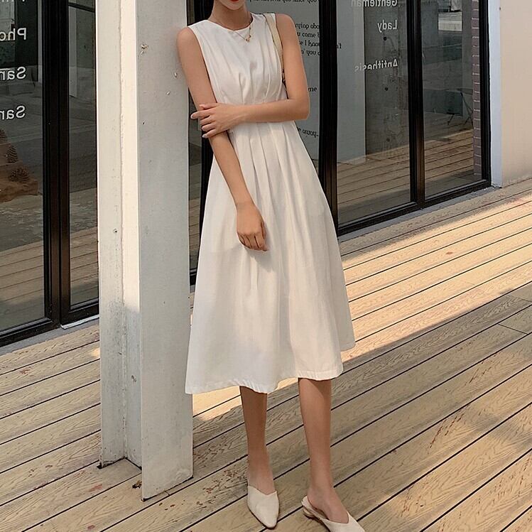 全2色 ノースリーブワンピース リゾートワンピース ドレス ひざ丈 ミディ丈 無地 着痩せ ラウンドネック ゆったり きれいめ フェミニン レトロ デート オフィス 夏 ホワイト ブラック
