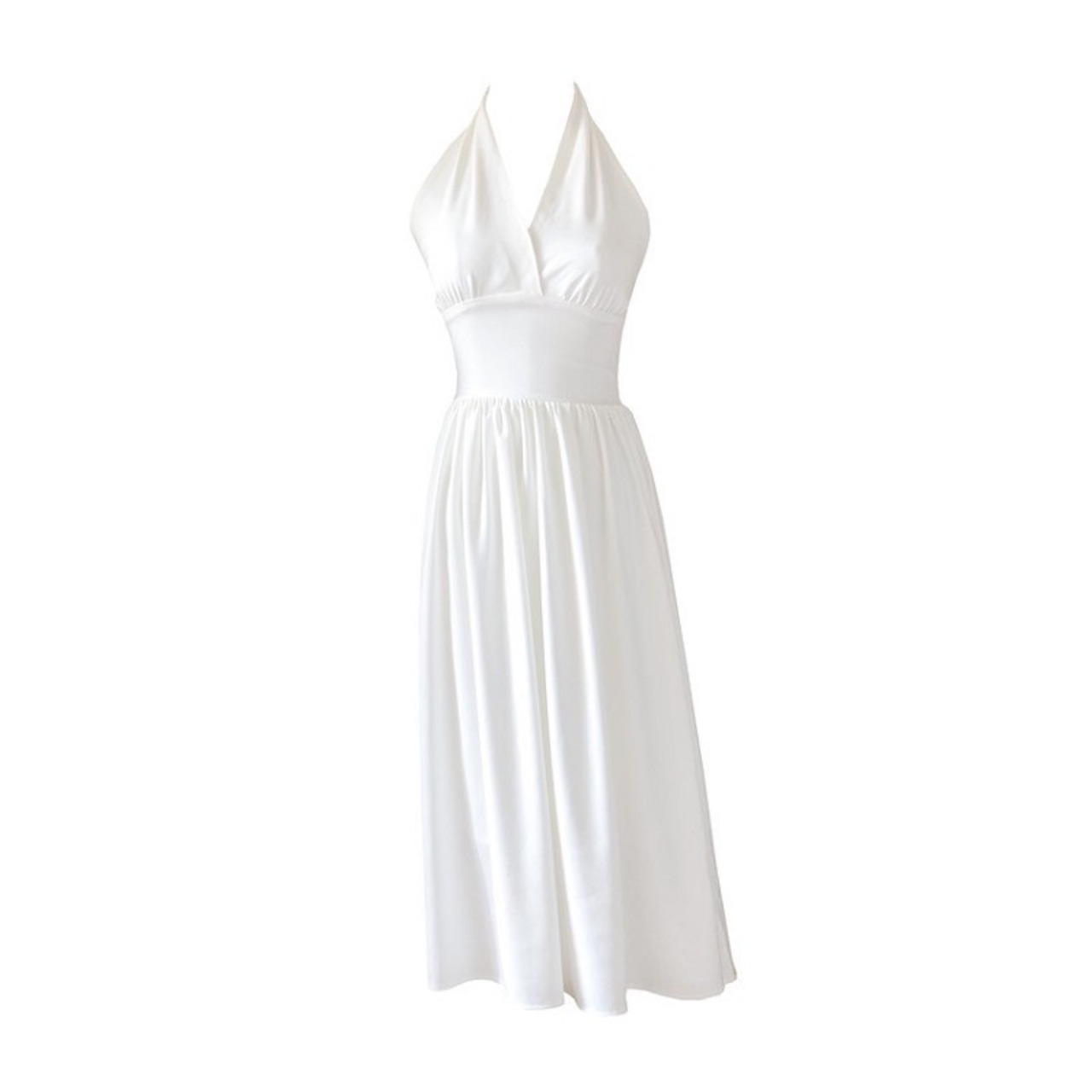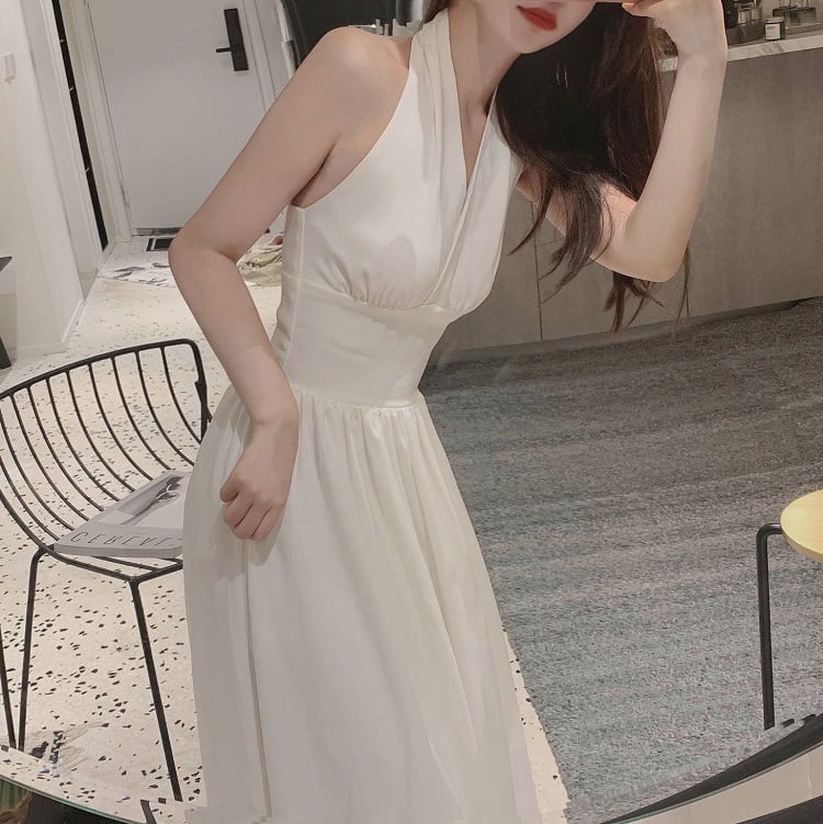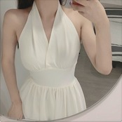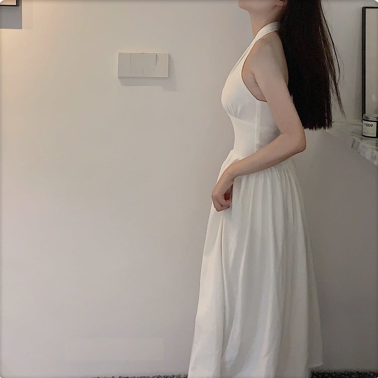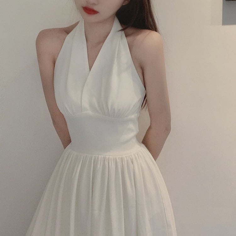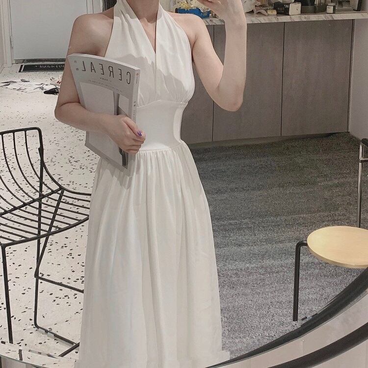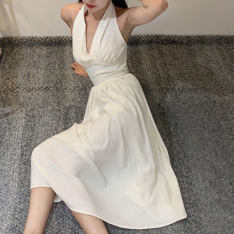 ホルターネックワンピース リゾートワンピース ドレス ロング丈 無地 着痩せ きれいめ フェミニン レトロ バックコンシャス マリリン モンロー デート リゾート 夏 ホワイト