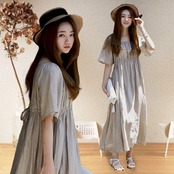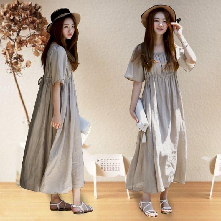 ワンピース リゾートワンピース ロング丈 マキシ丈 リネン 半袖 ラウンドネック ゆったり 体型カバー きれいめ リゾート フェミニン レトロ ナチュラル 夏 カーキ