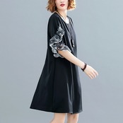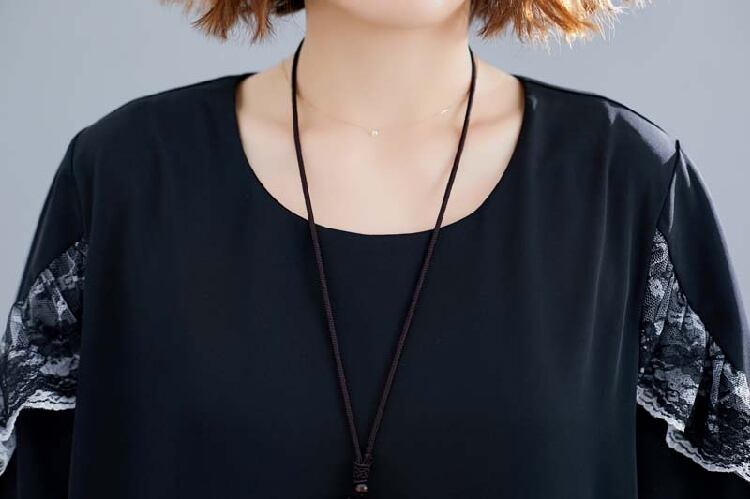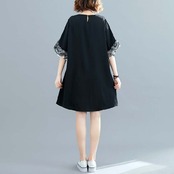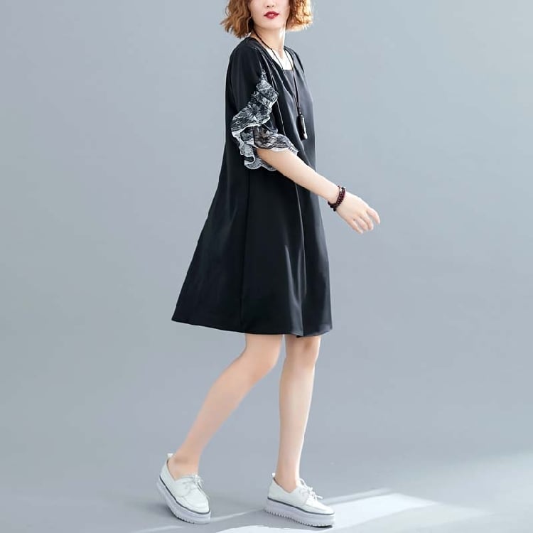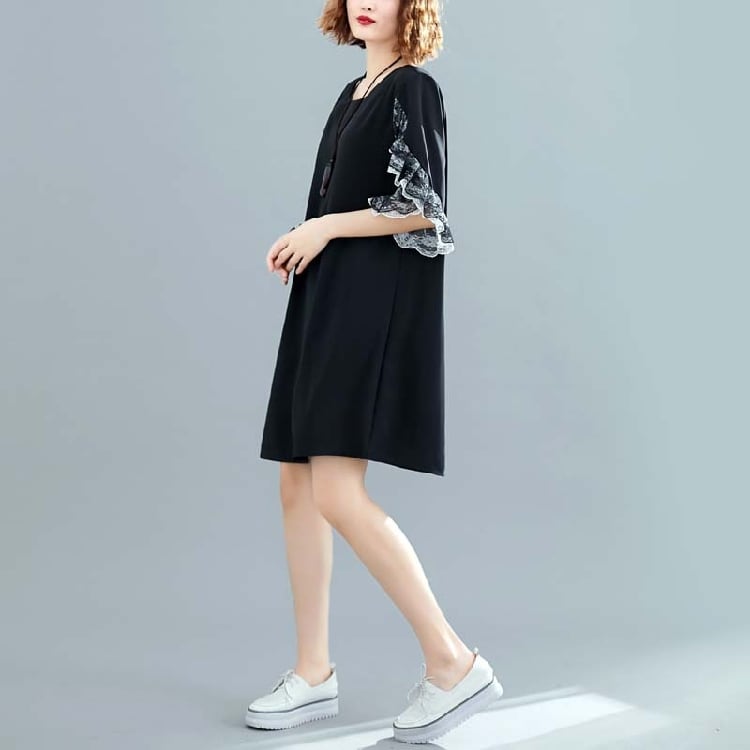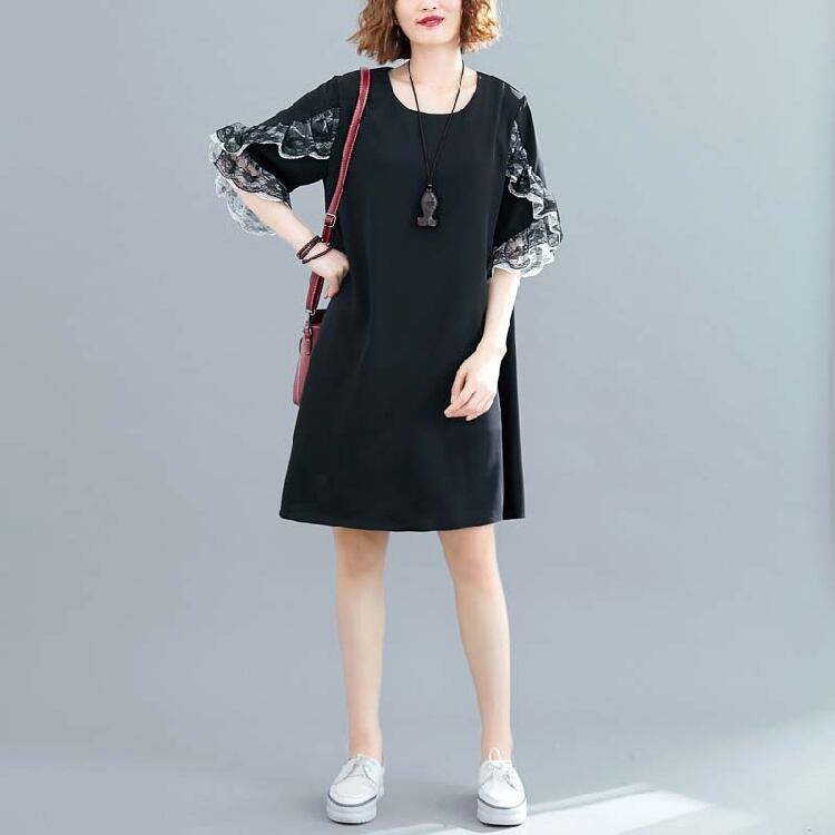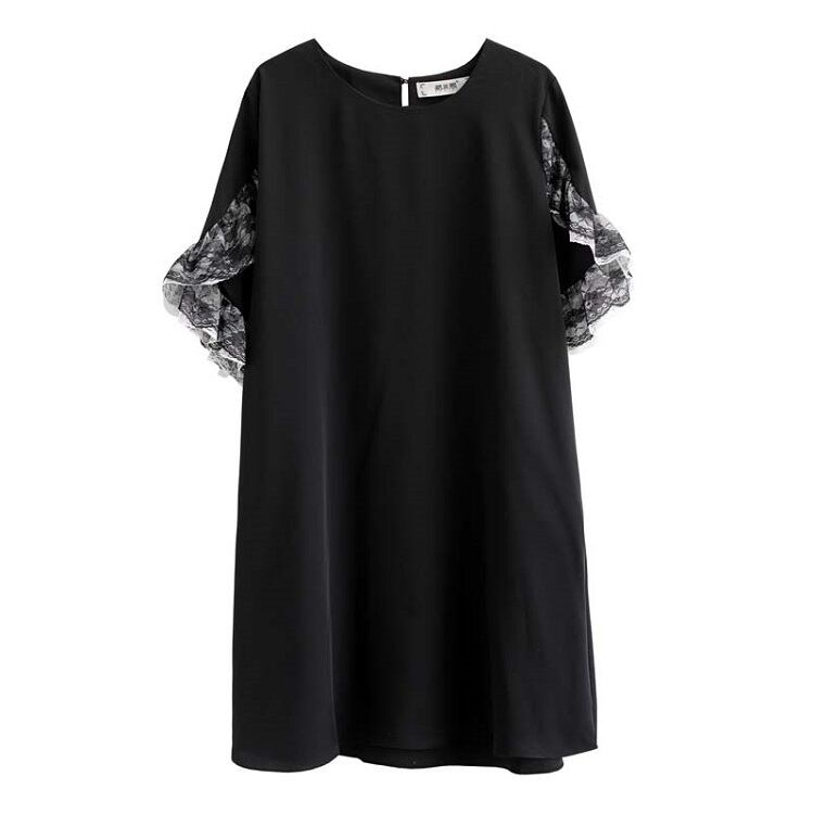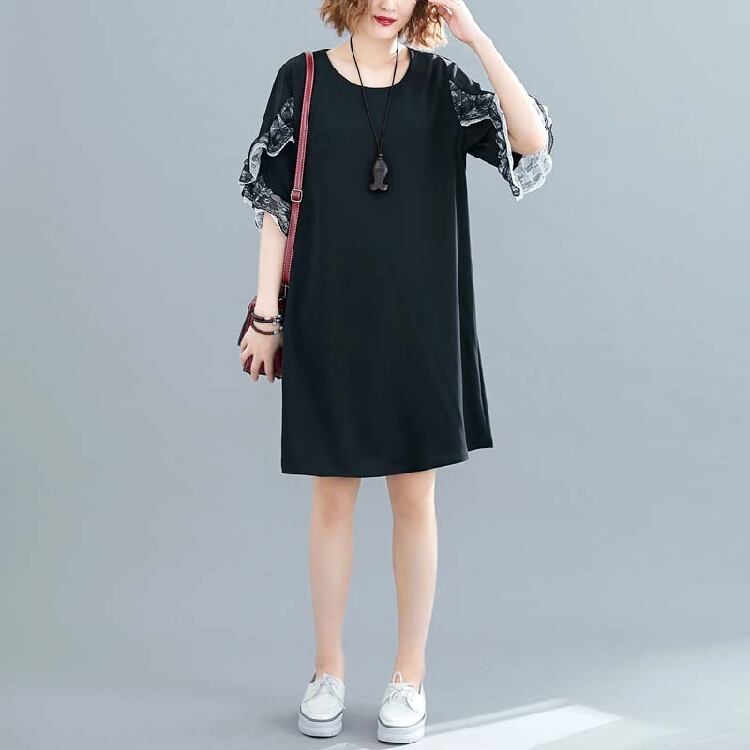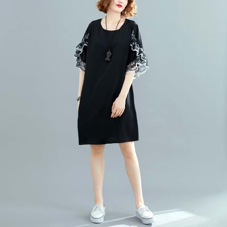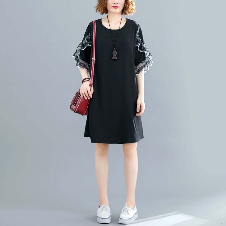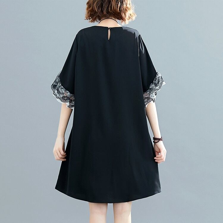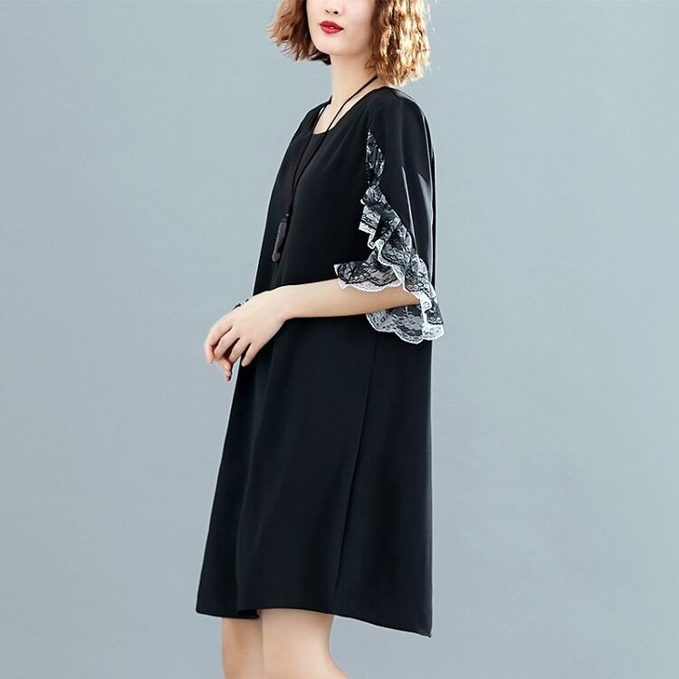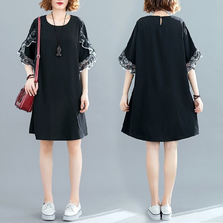 大きいサイズ ワンピース シフォン レース ひざ丈 ミニ丈 半袖 ラウンドネック フリル袖 ゆったり きれいめ リゾート フェミニン レトロ 上品 フォーマル お呼ばれ デート 夏 ブラック