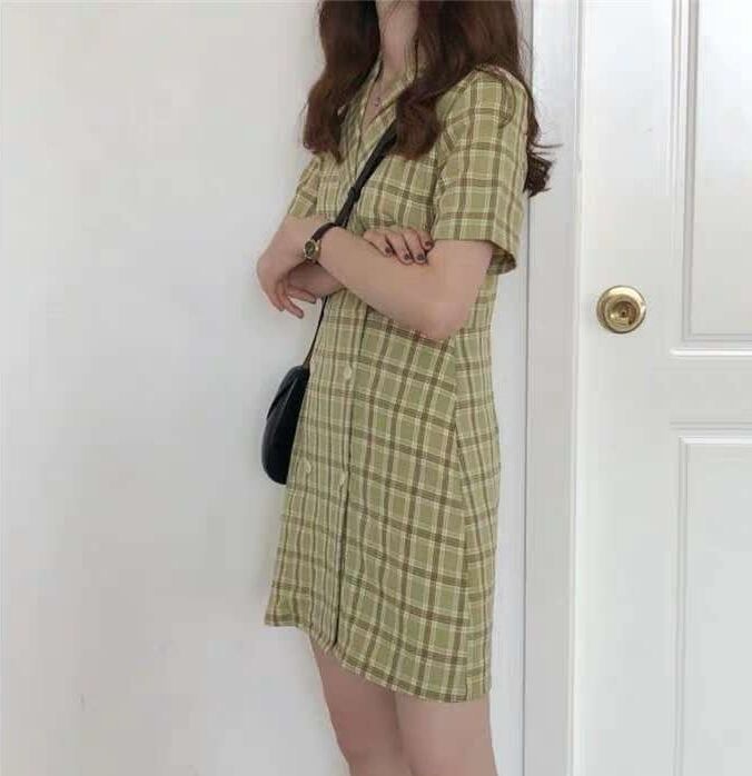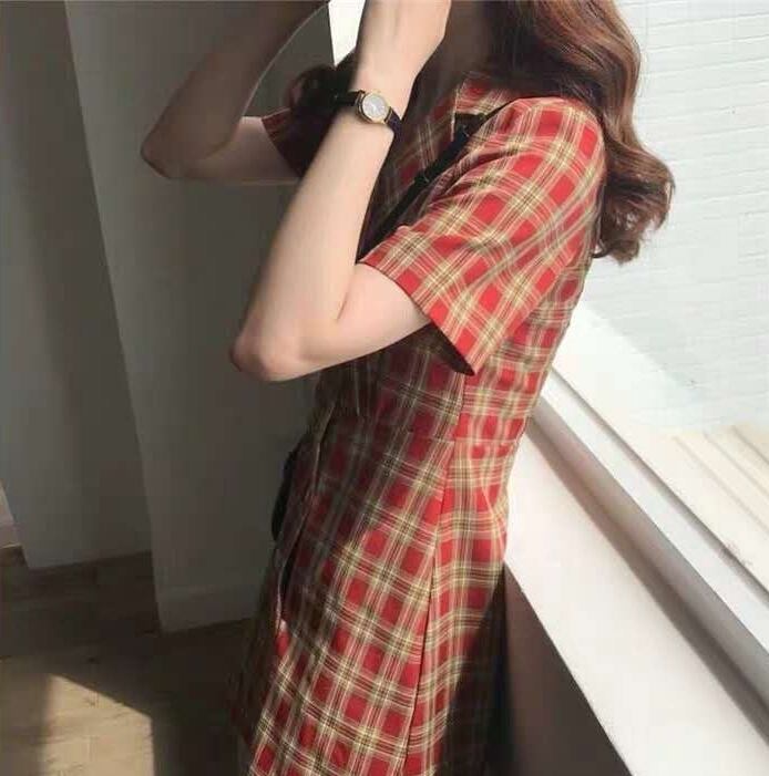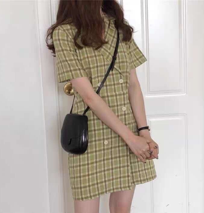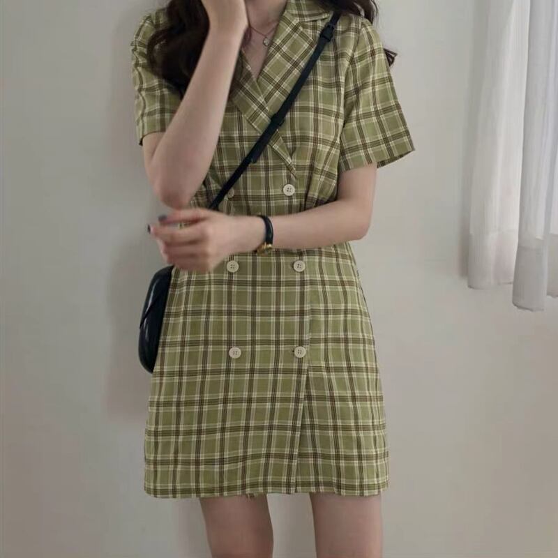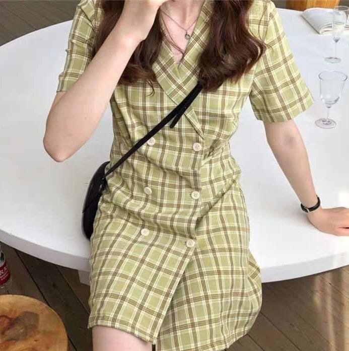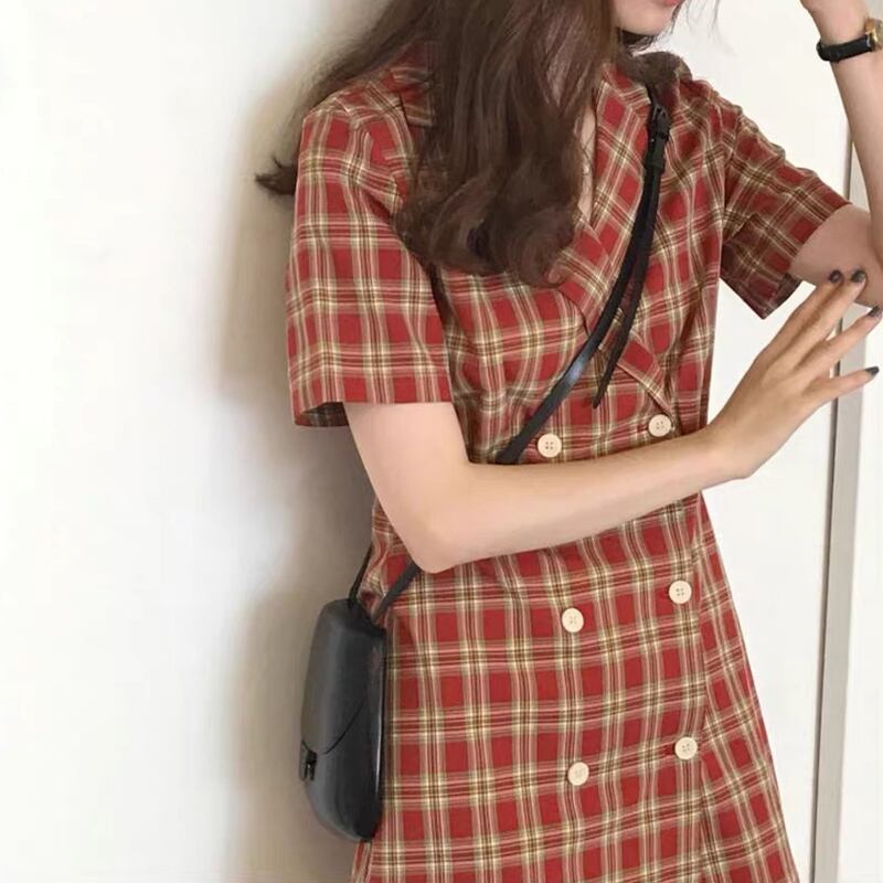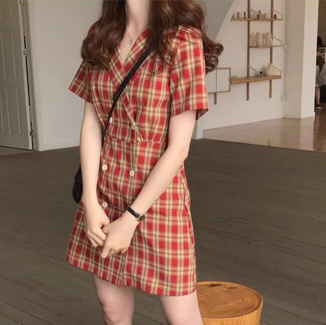 全2色 チェック柄 ワンピース フロントボタン トレンチ カシュクールネック ミニ丈 スリム 半袖 Vネック 上品 可愛い レトロ カジュアル きれいめ デート 春 夏