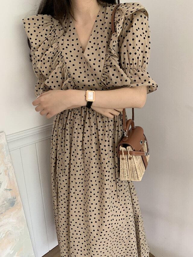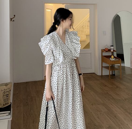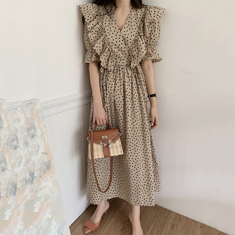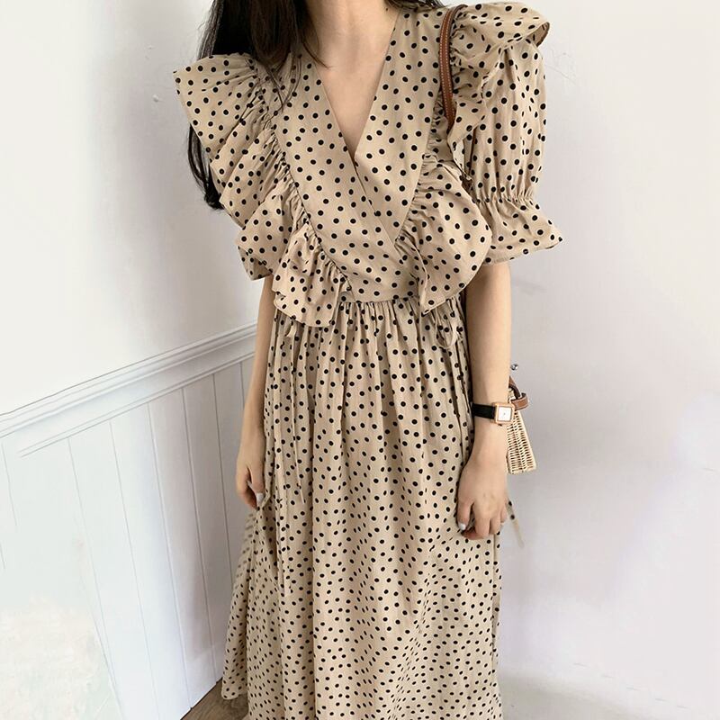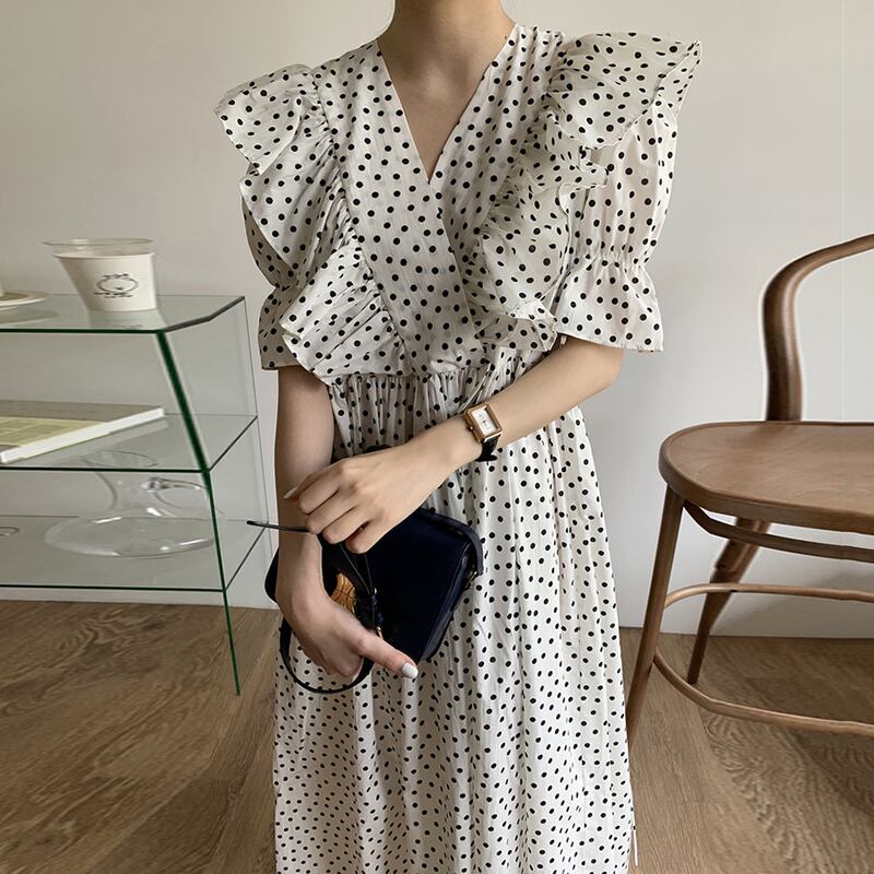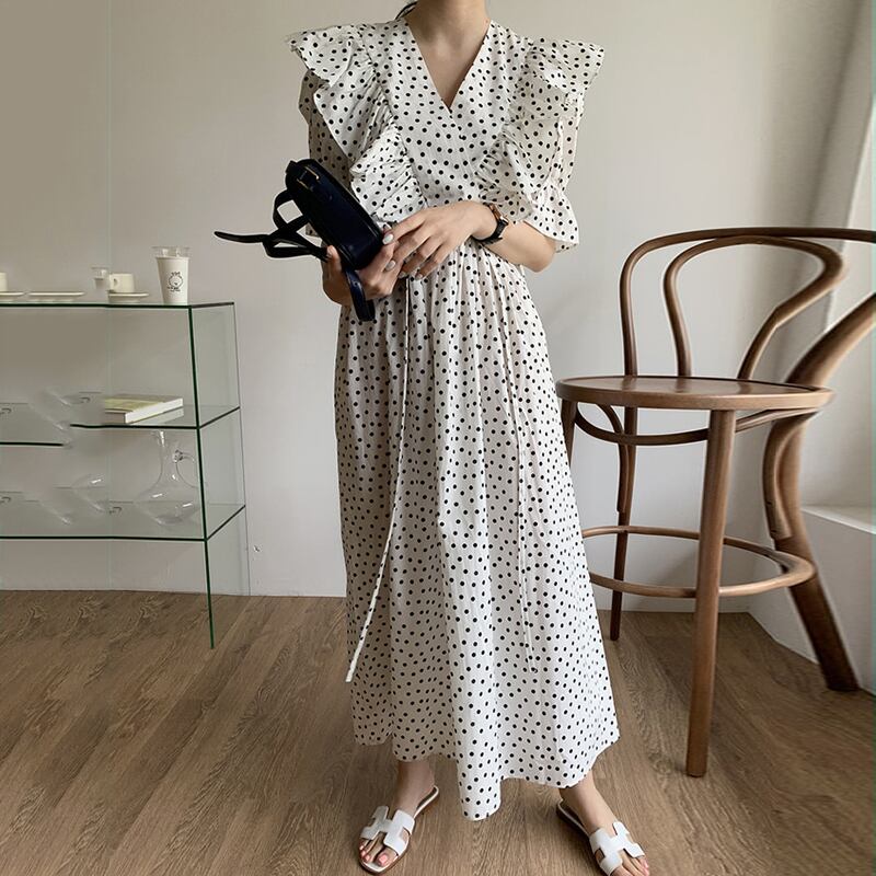 全2色 ドット柄 ワンピース サマードレス フリル カシュクールネック トランペットスリーブ 5分袖 ウエストリボン フレア ロング丈 上品 カジュアル きれいめ デート レトロ 韓国ファッション 春 夏