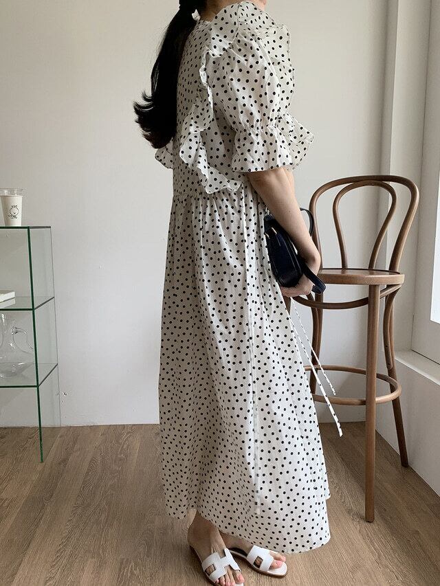 ドット柄が上品でフェミニンなロング丈ワンピース。