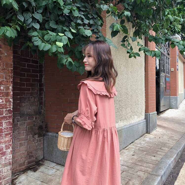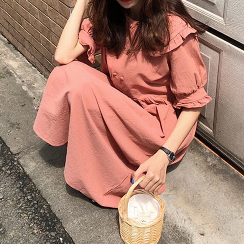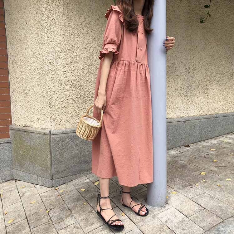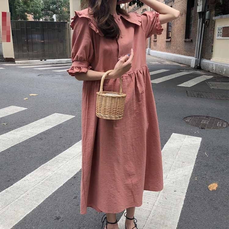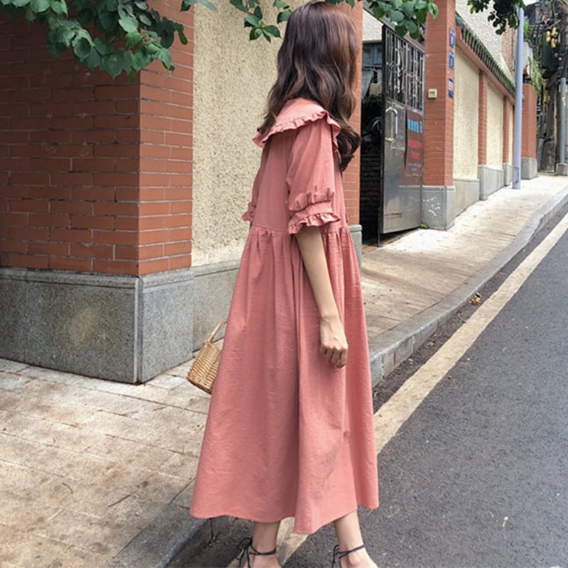 全2色 ワンピース フリル ロング丈 フロントボタン 5分袖 ゆったり オーバーサイズ ビッグシルエット 袖コンシャス 上品 大人可愛い カジュアル リゾート 体型カバー 春 夏