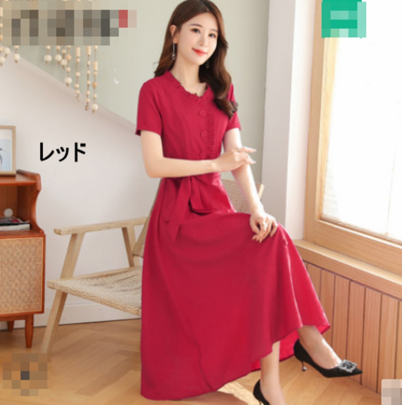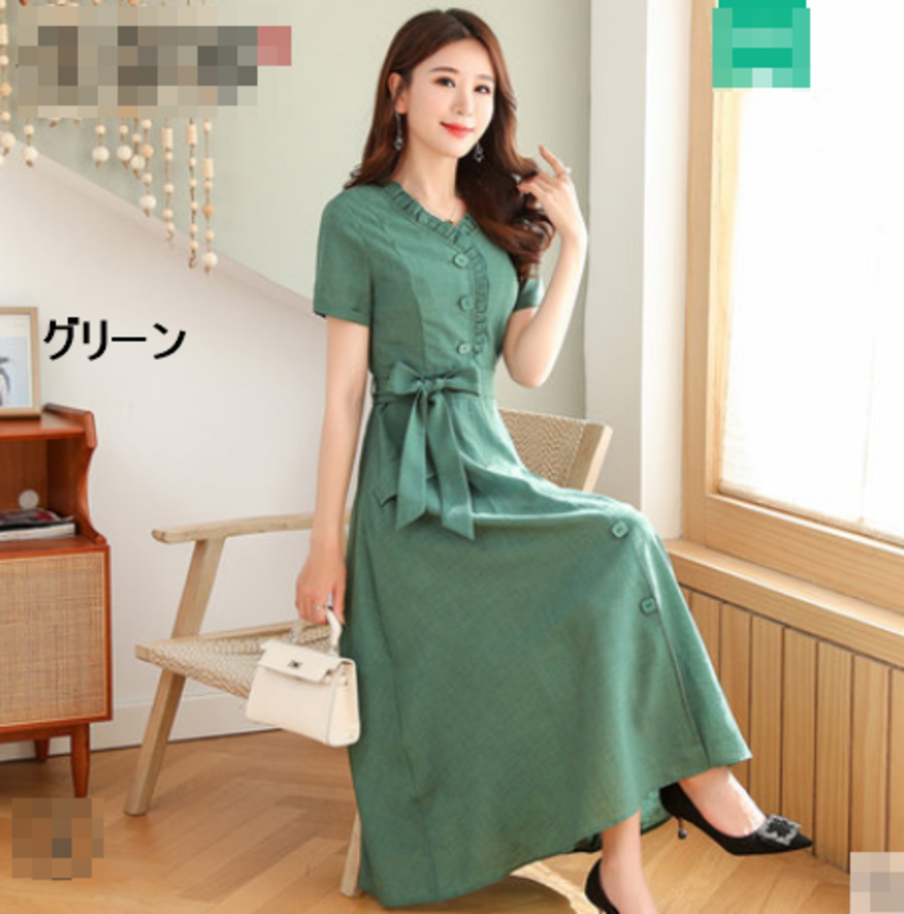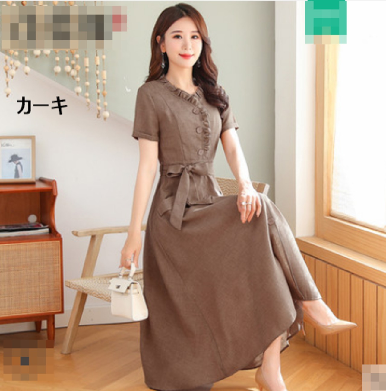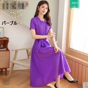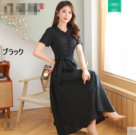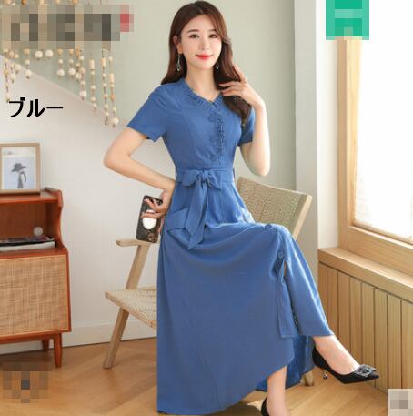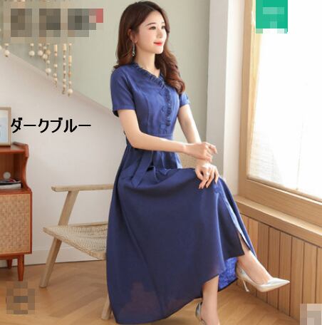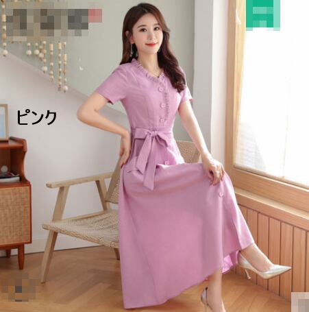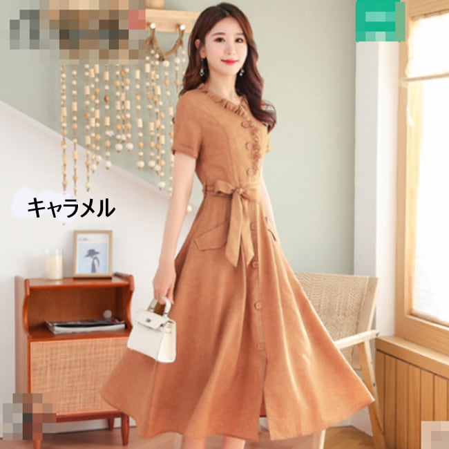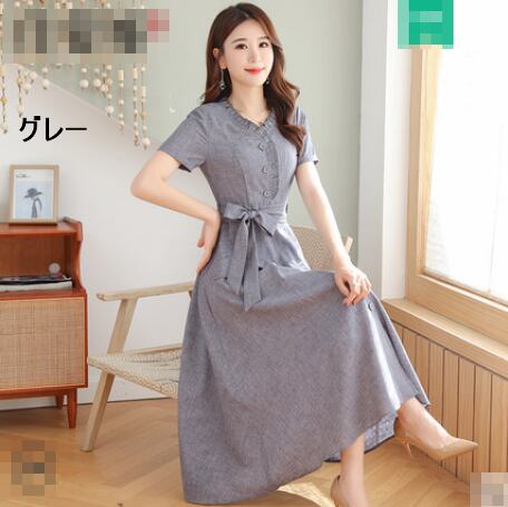 全10色 ワンピース リネン 麻 サマードレス ロング丈 フロントボタン フリル Vネック 半袖 ウエストリボン ハイウエスト 無地 大人 上品 カジュアル 女子会 きれいめ 春 夏