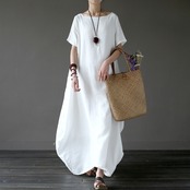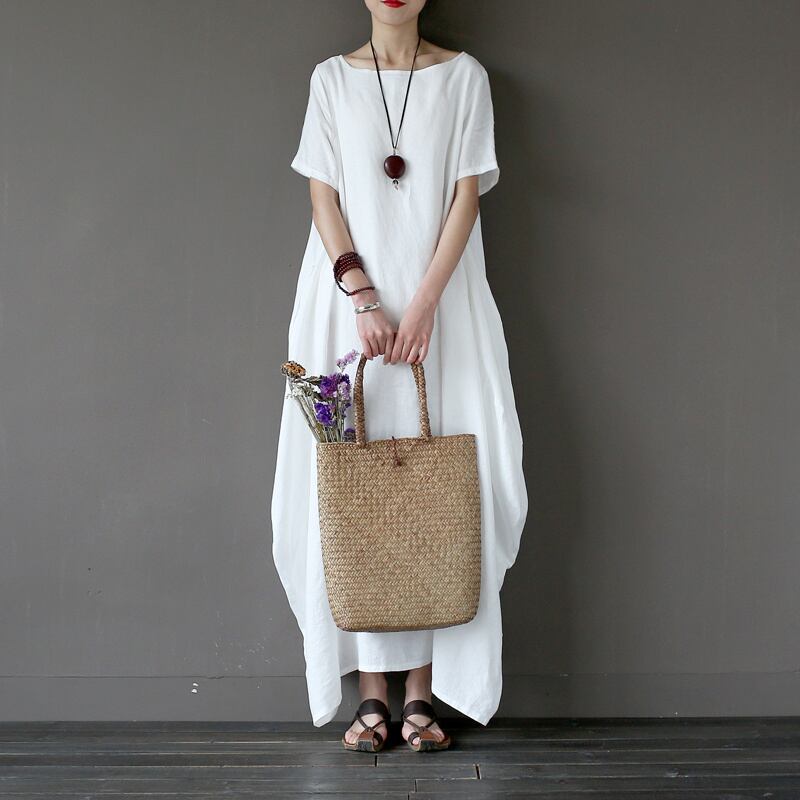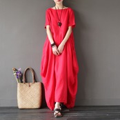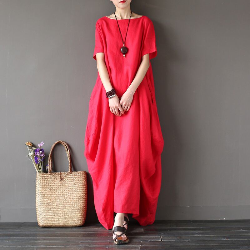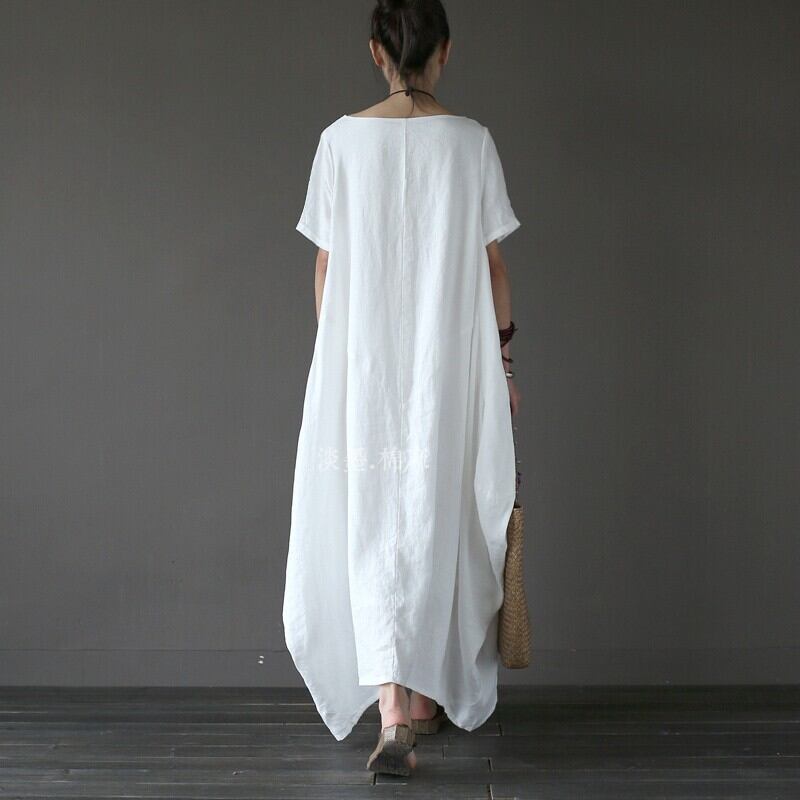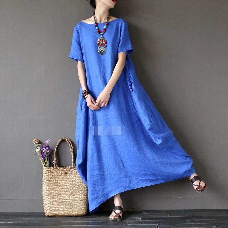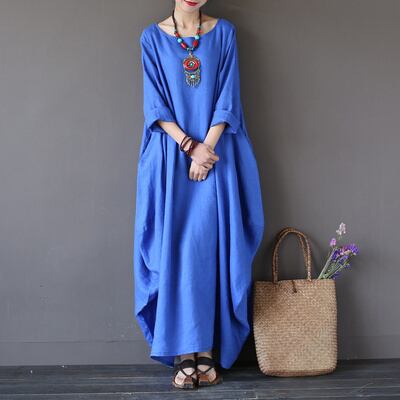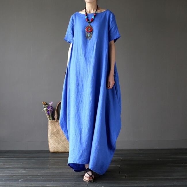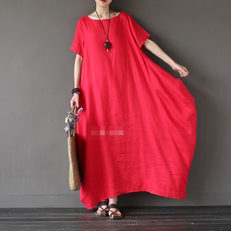 全3色2種 ワンピース リネン 麻 ロング丈 ビッグシルエット ゆったり オーバーサイズ ドレープ 半袖 長袖 エスニック 無地 ユニーク ラウンドネック 大人 カジュアル お出かけ 春 夏