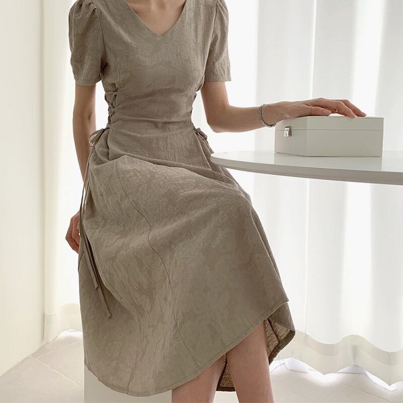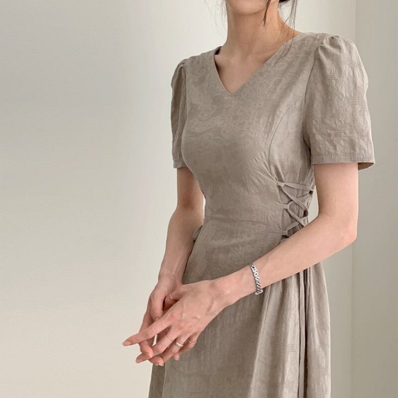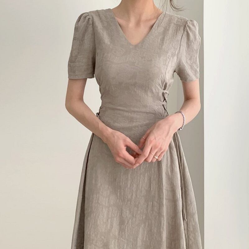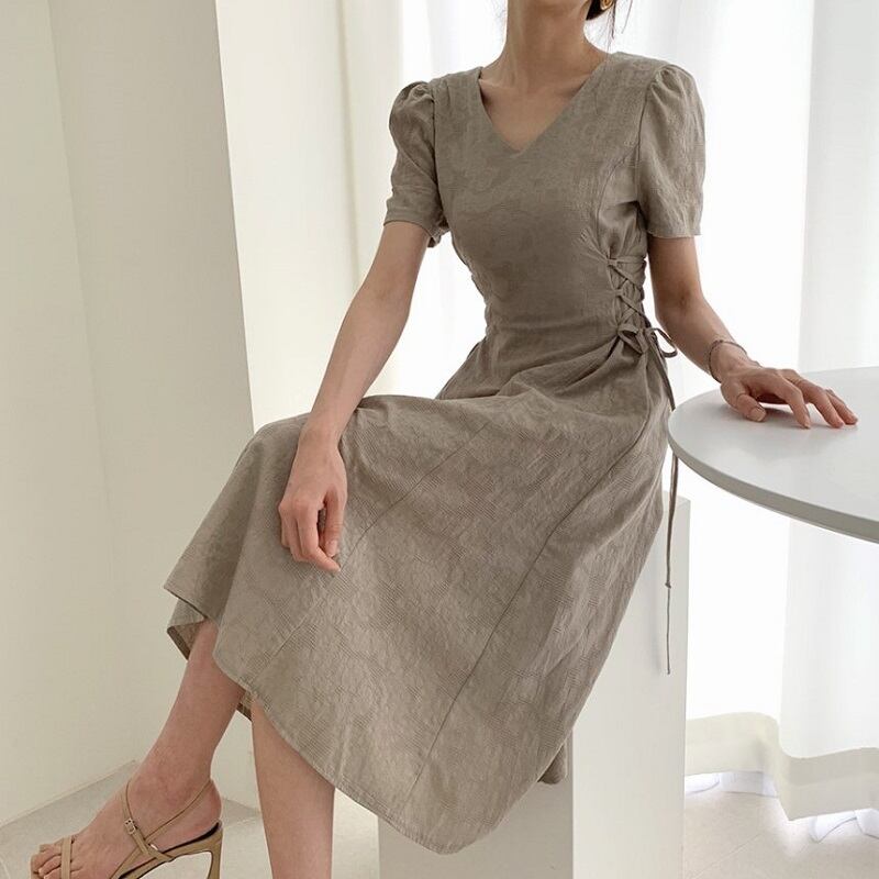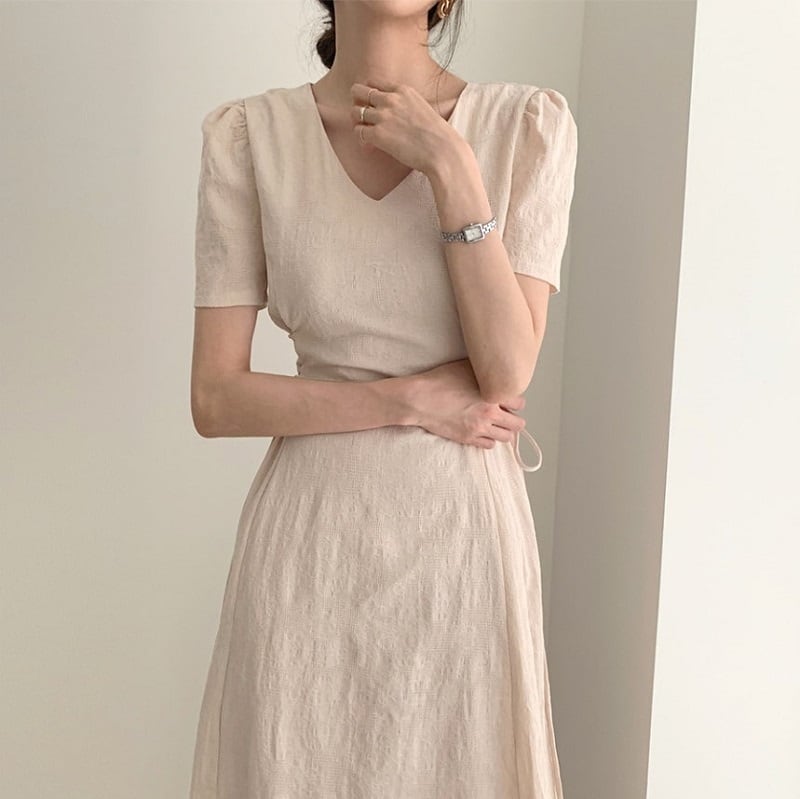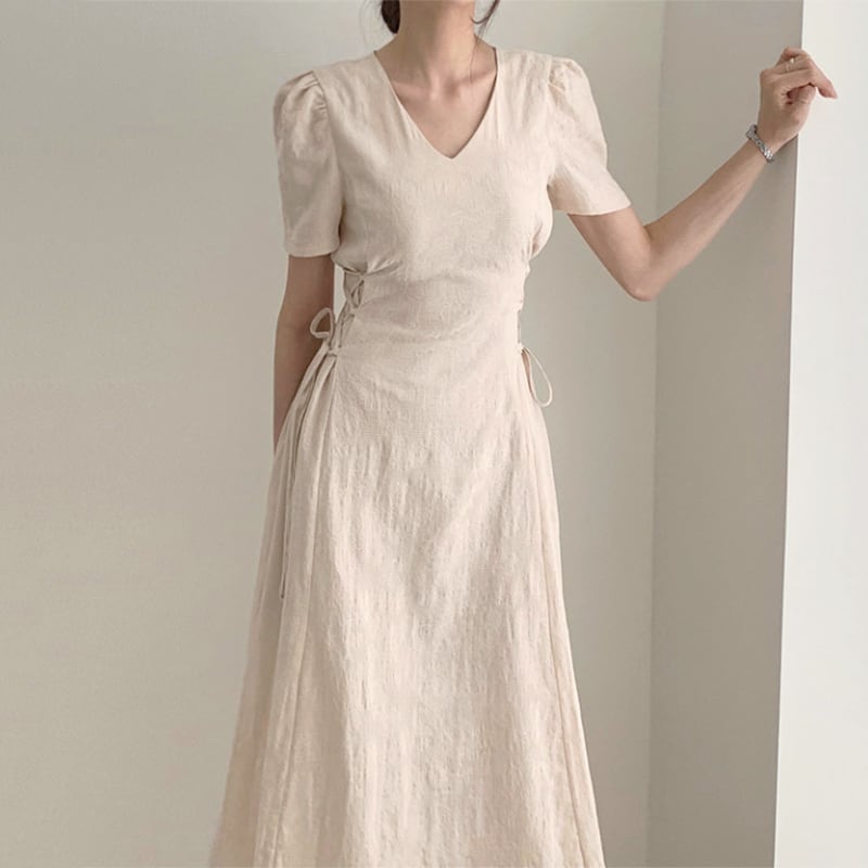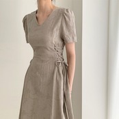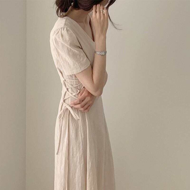 ロングワンピース 半袖 Vネック フレアスカート リネン ナチュラル 無地 シンプル きれいめ カジュアル お呼ばれ デート グレー アプリコット