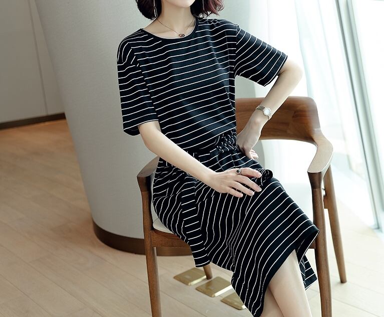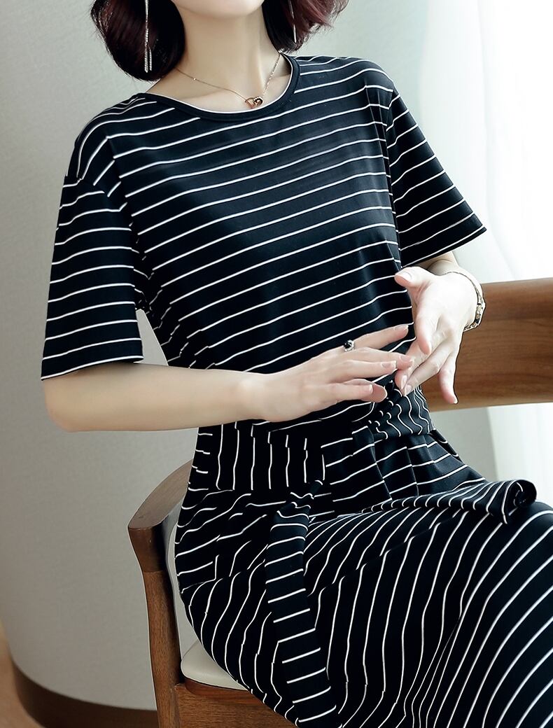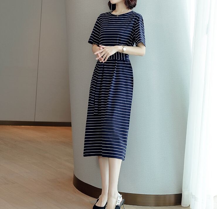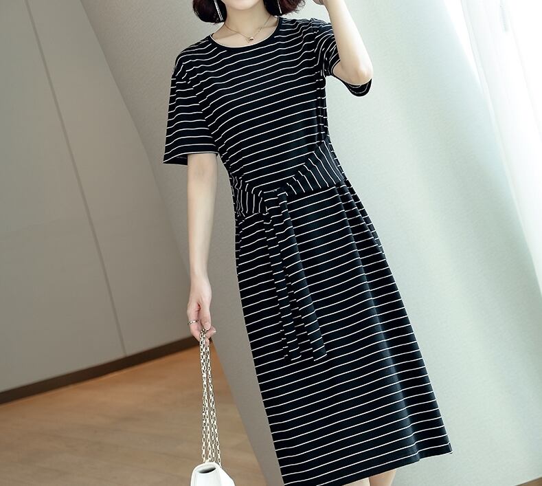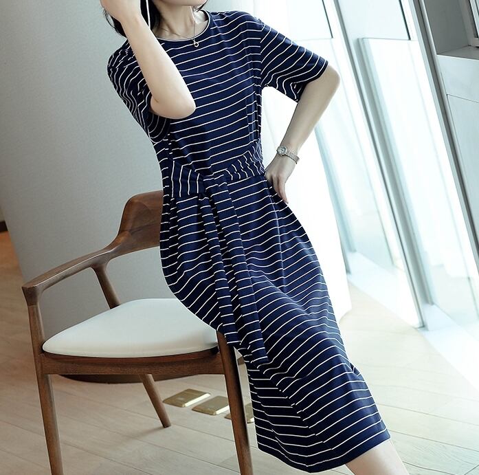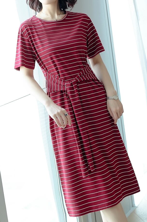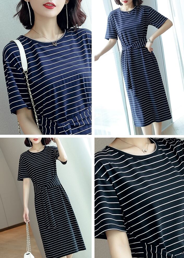 全3色 コットン100% ワンピース ボーダー ミディ丈 ウエストリボン 半袖 大人 カジュアル お出かけ シンプル ラウンドネック スリム 春 夏
