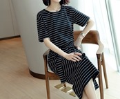ボーダー柄で大人カジュアルに着こなせるミディ丈ワンピース。