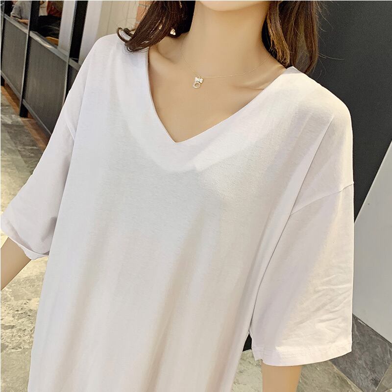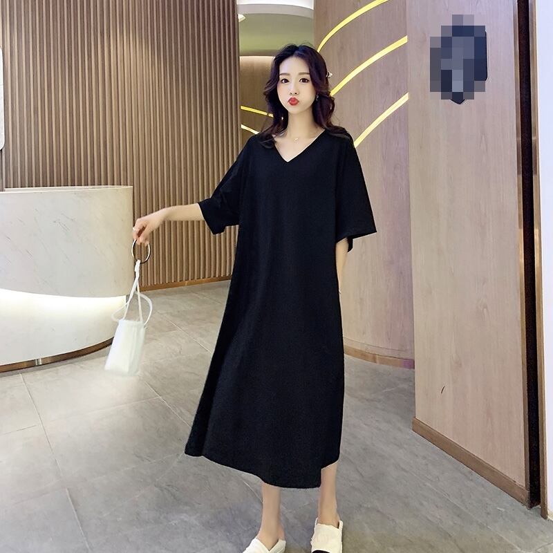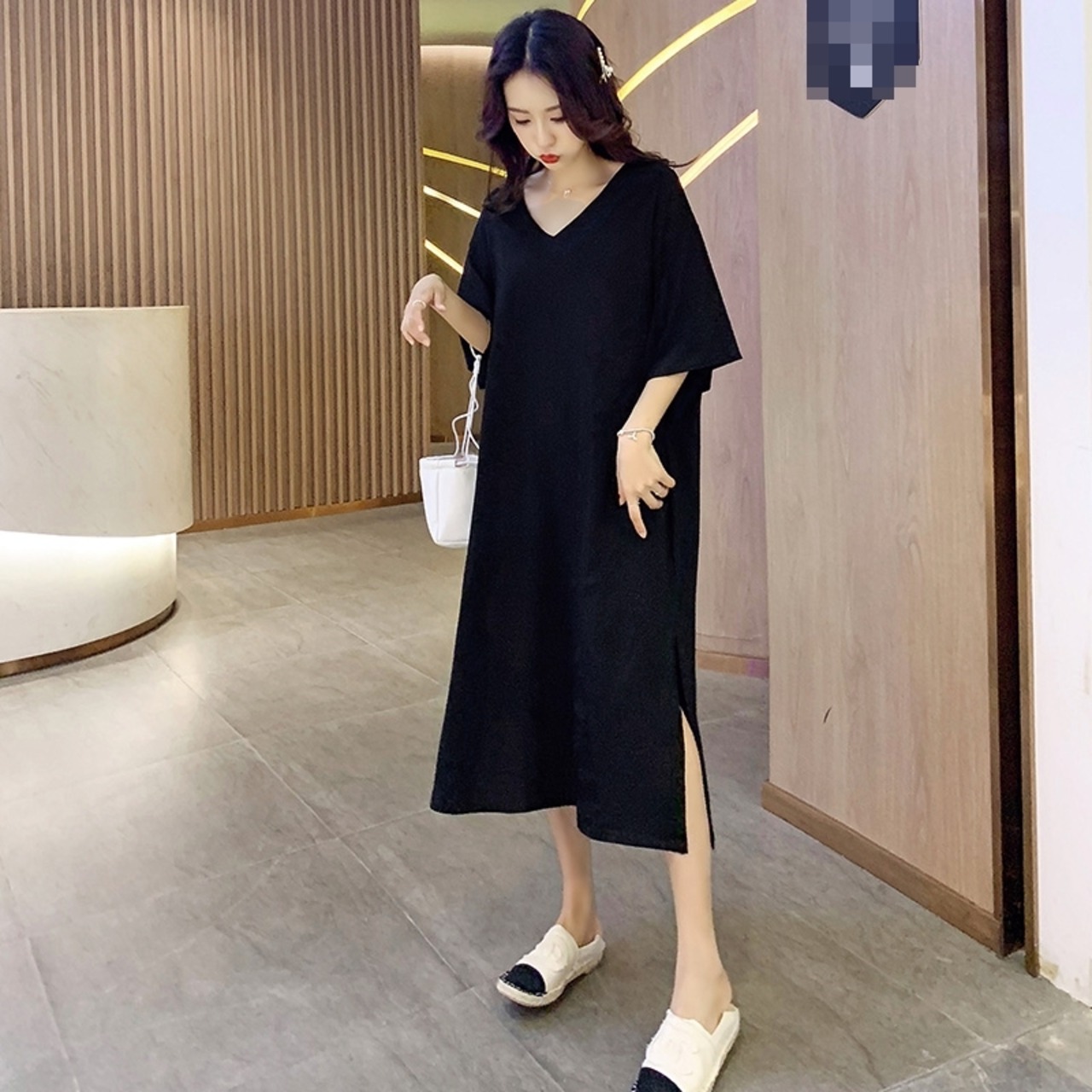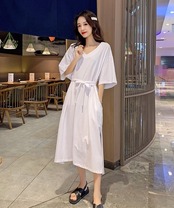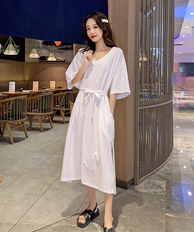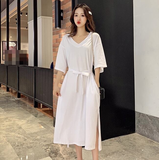 全2色 コットン100% ワンピース ロングTシャツ ミモレ丈 Vネック ウエストリボン サイドスリット 7分袖 ゆったり オーバーサイズ Tシャツワンピース カジュアル デイリー シンプル 春 夏