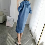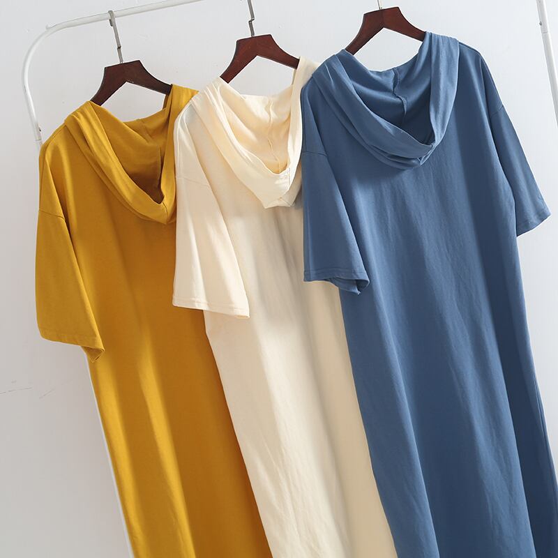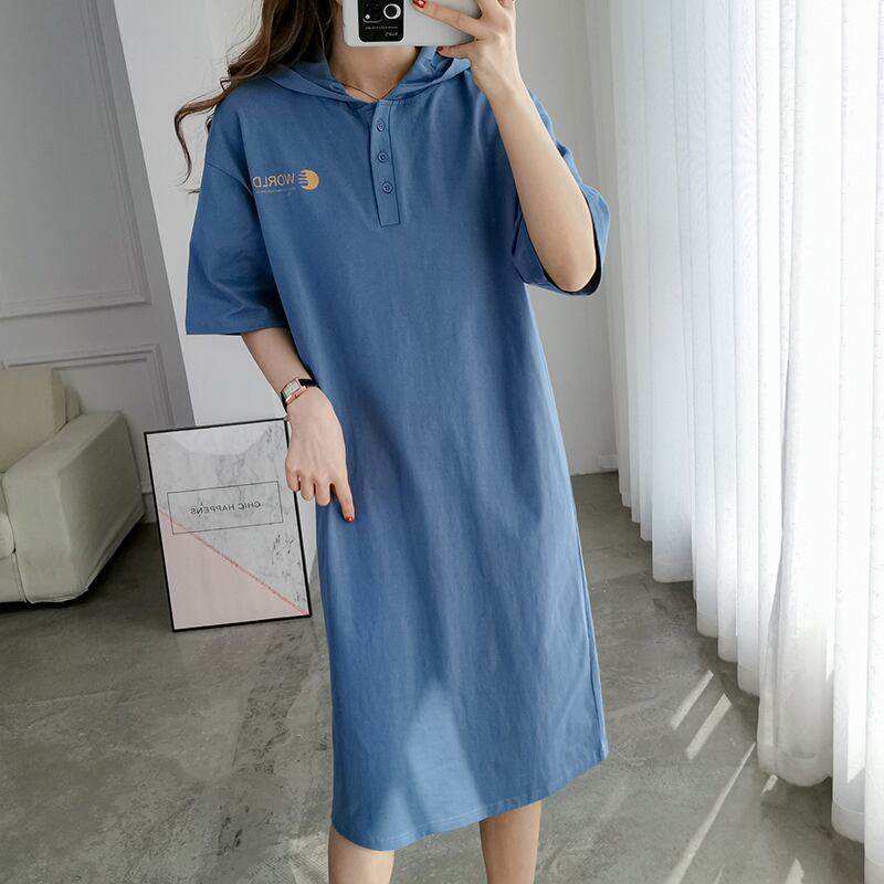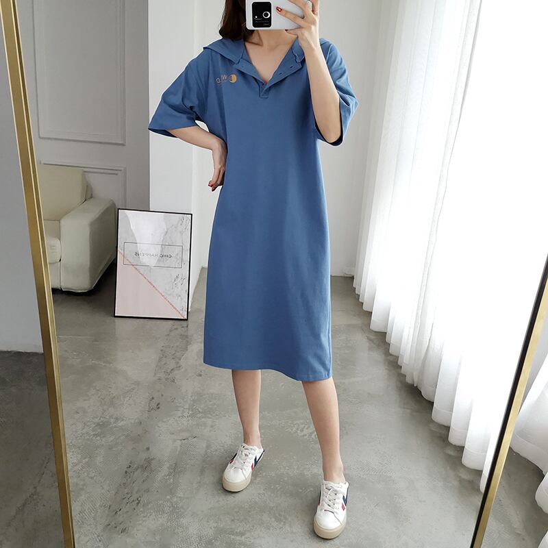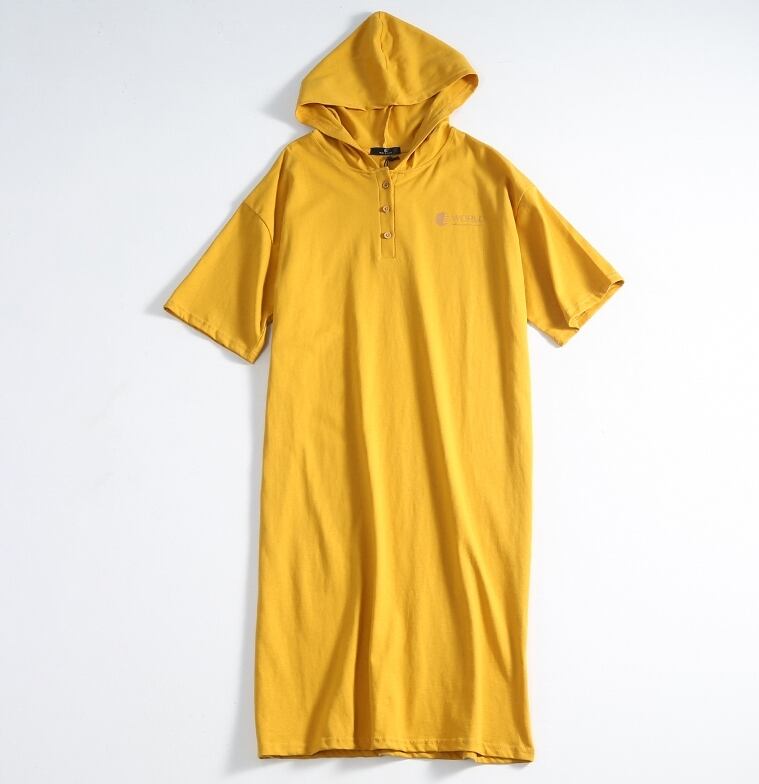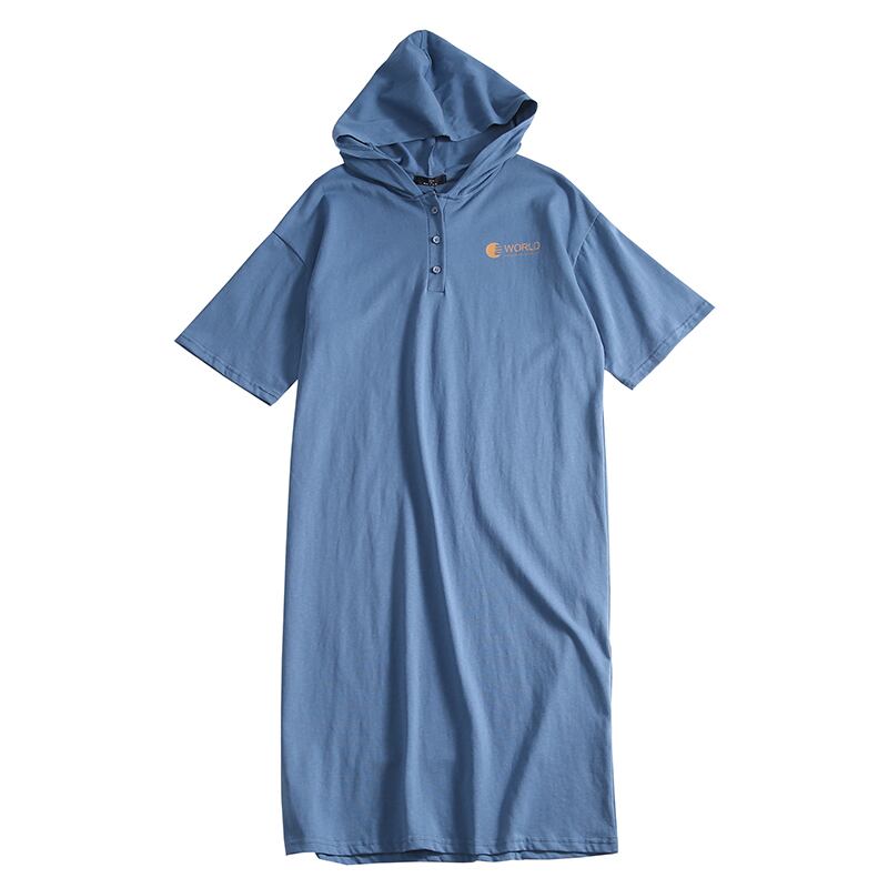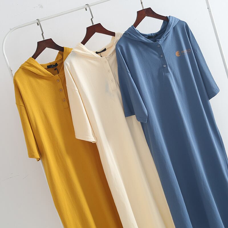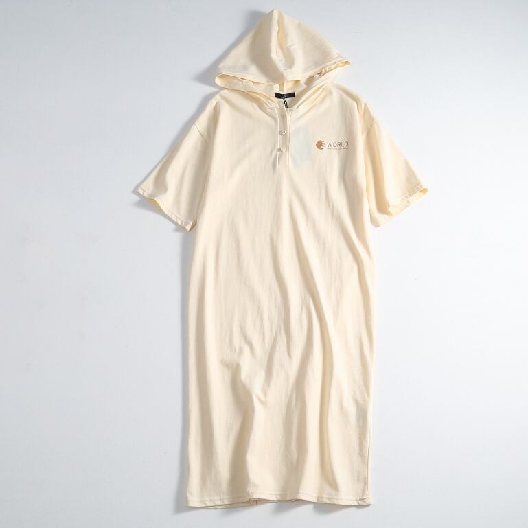 全3色 ワンピース ミモレ丈 ネックボタン ロングTシャツ 5分袖 ロゴ入り Vネック フード付き シンプル カジュアル デイリー お出かけ 大人 春 夏