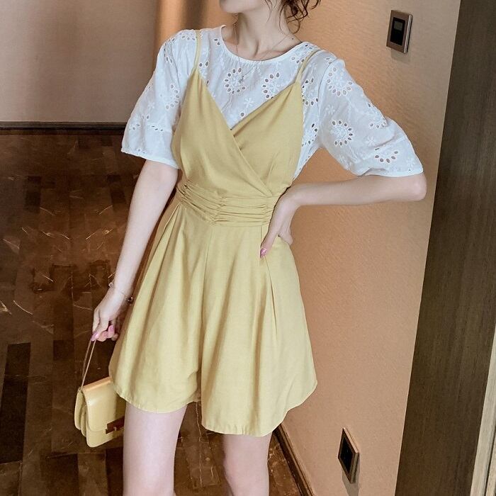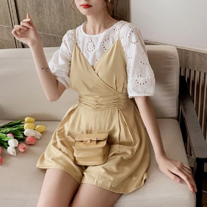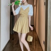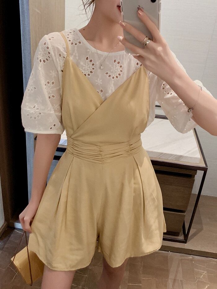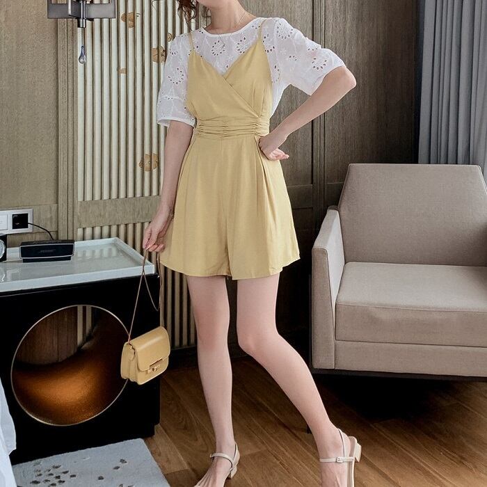 全2色 セットアップ ショートパンツ フレアパンツ オールインワン サロペット ショート丈 ビスチェ風 カシュクール ブラウス トップス レース ラウンドネック 半袖 パフスリーブ シンプル きれいめ カジュアル お呼ばれ デート リゾート 夏 イエロー ブラック