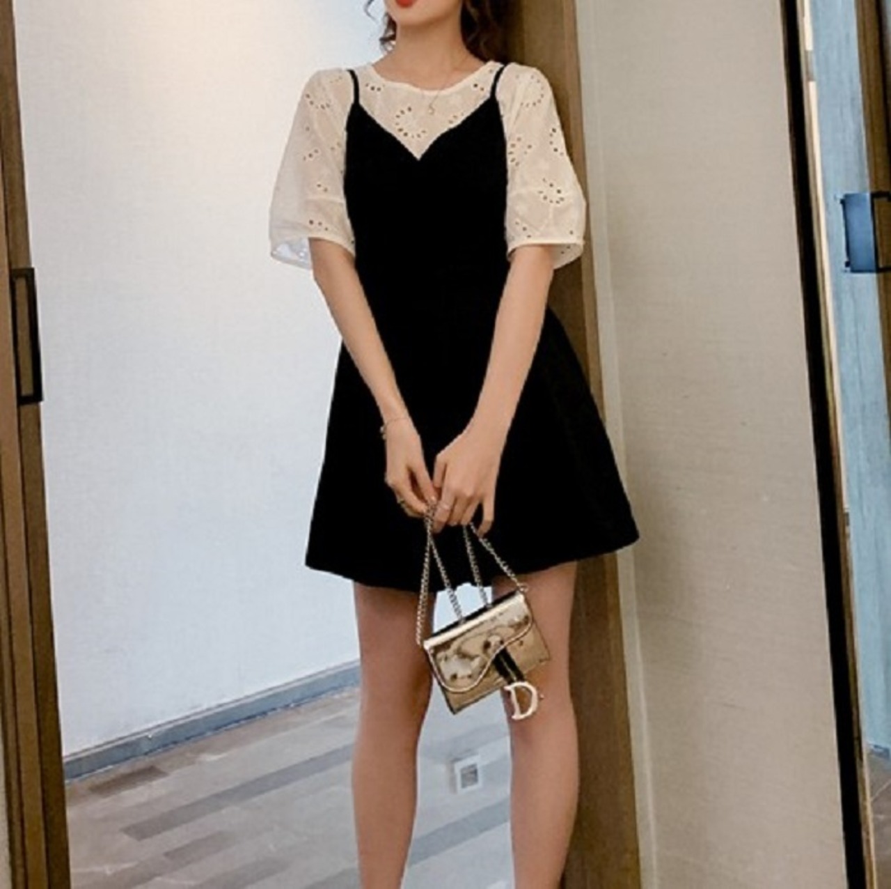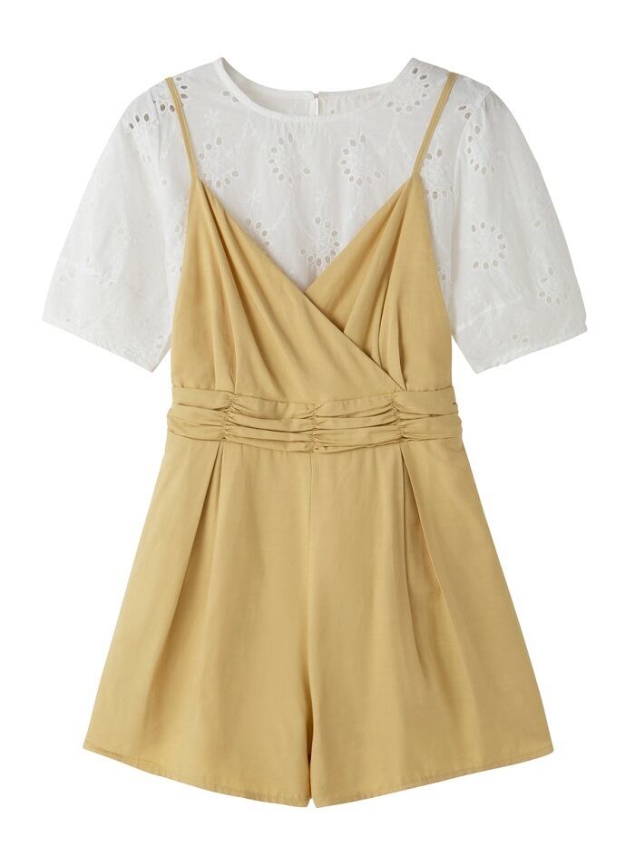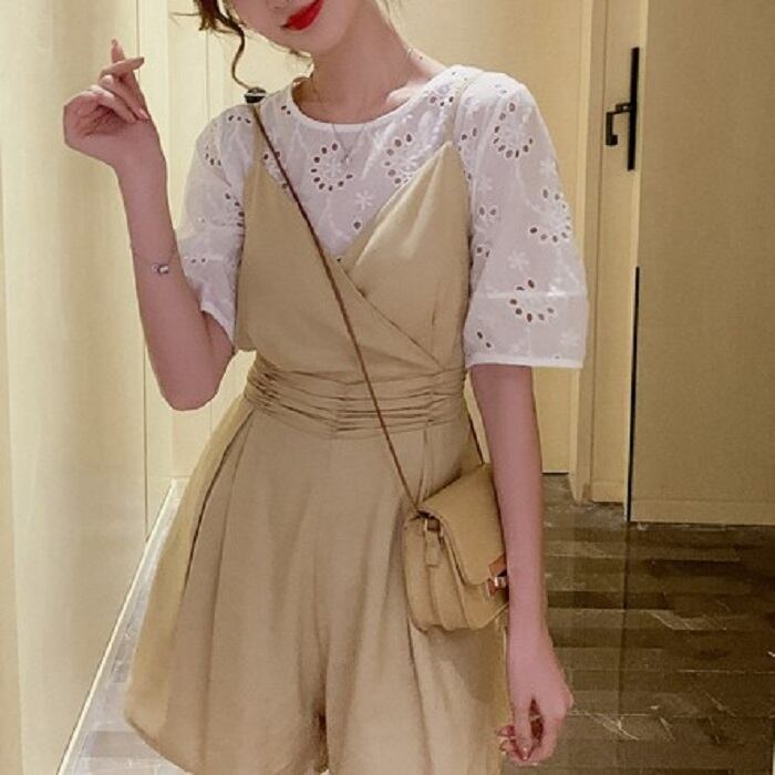 穴あきレースが涼しげで可愛らしいブラウスとカシュクールデザインのサロペット♪