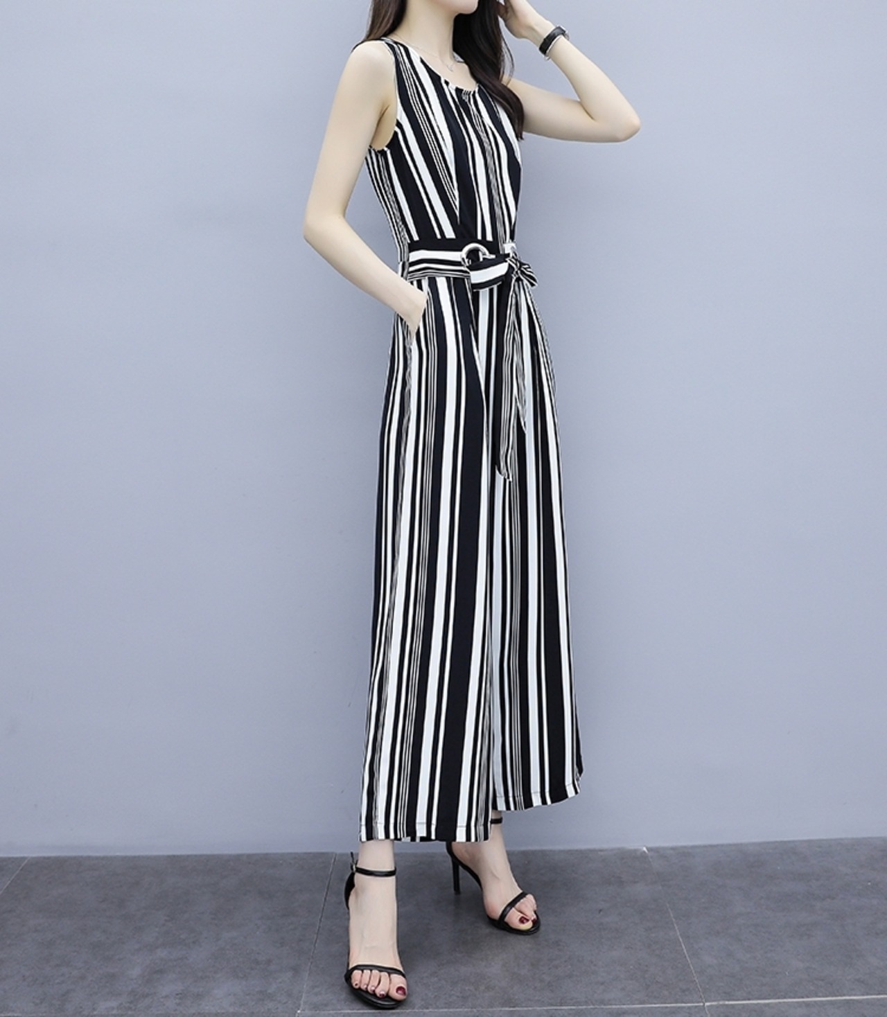 全2色 ジャンプスーツ サロペット オールインワン オーバーオール ストライプ ウエストリボン Uネック ノースリーブ ハイウエスト ワイドレッグ アンクル丈 9分丈 カジュアル キレイ目 デート 春 夏