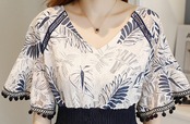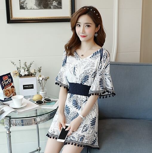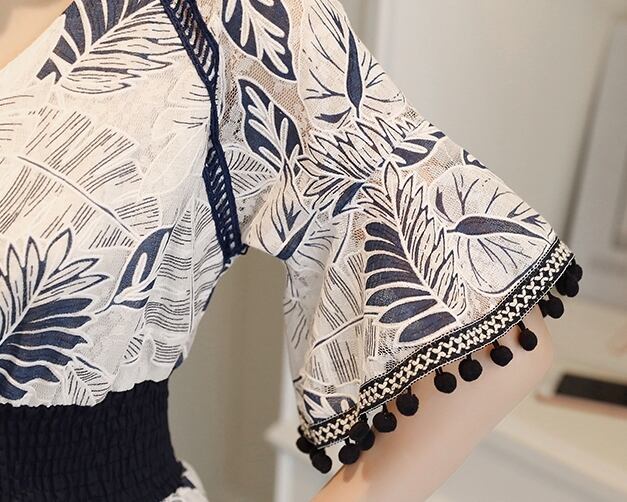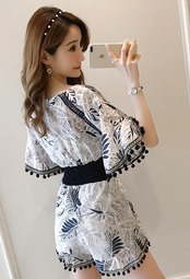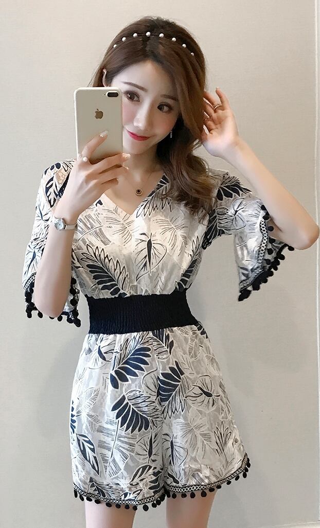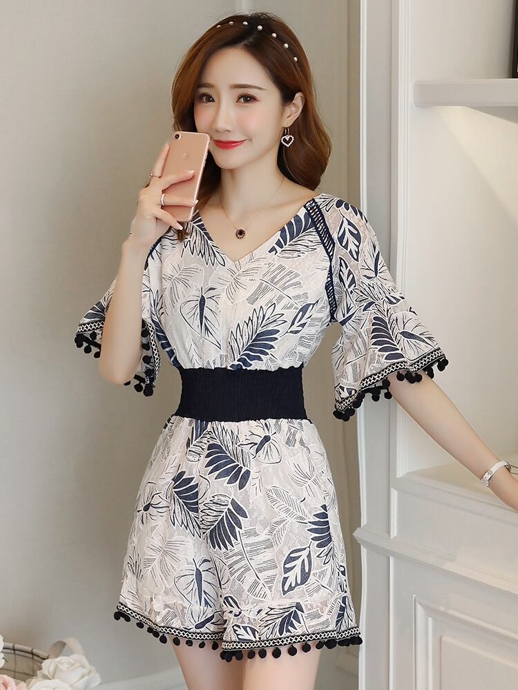 ジャンプスーツ ショートサロペット オールインワン オーバーオール ボタニカル フリンジ Vネック 5分袖 袖コンシャス ハイウエスト トランペットスリーブ カジュアル キレイ目 リゾート デート 春 夏