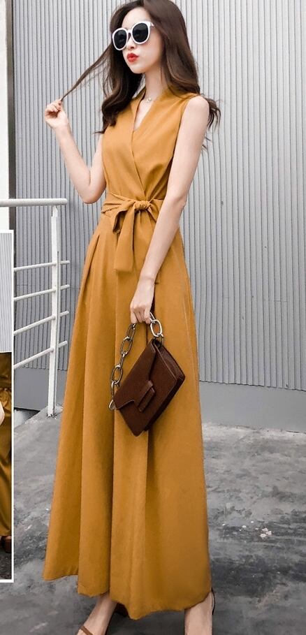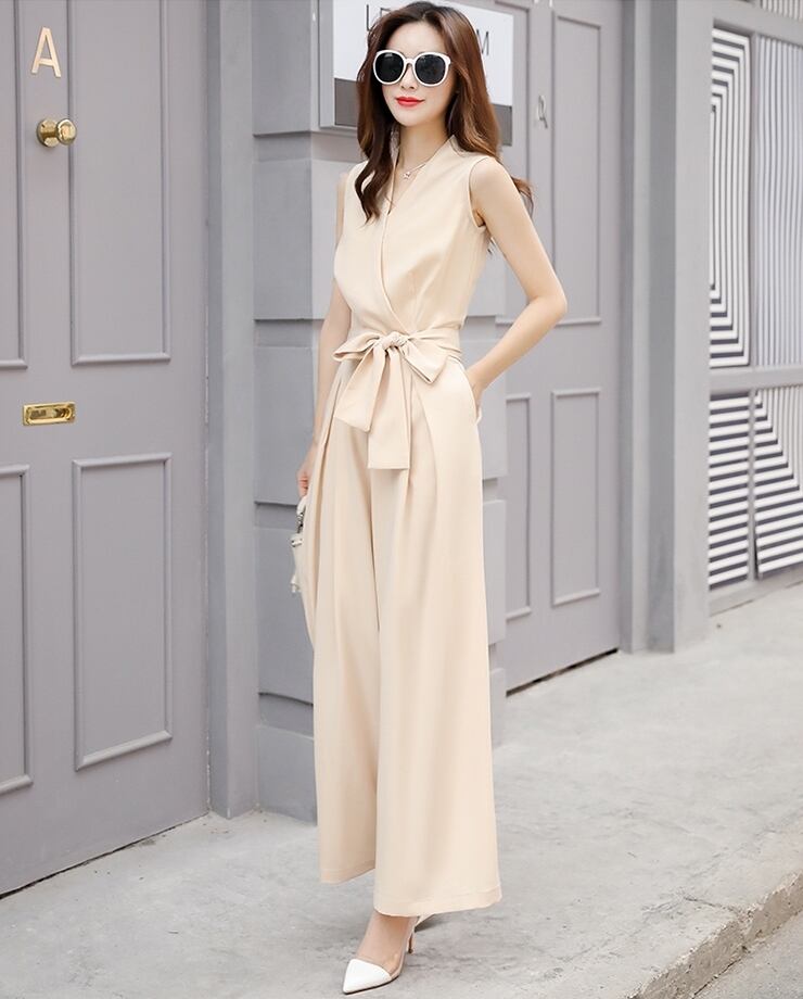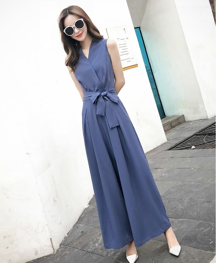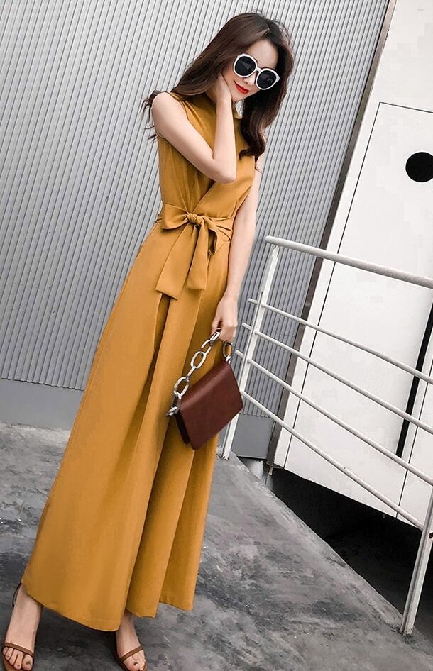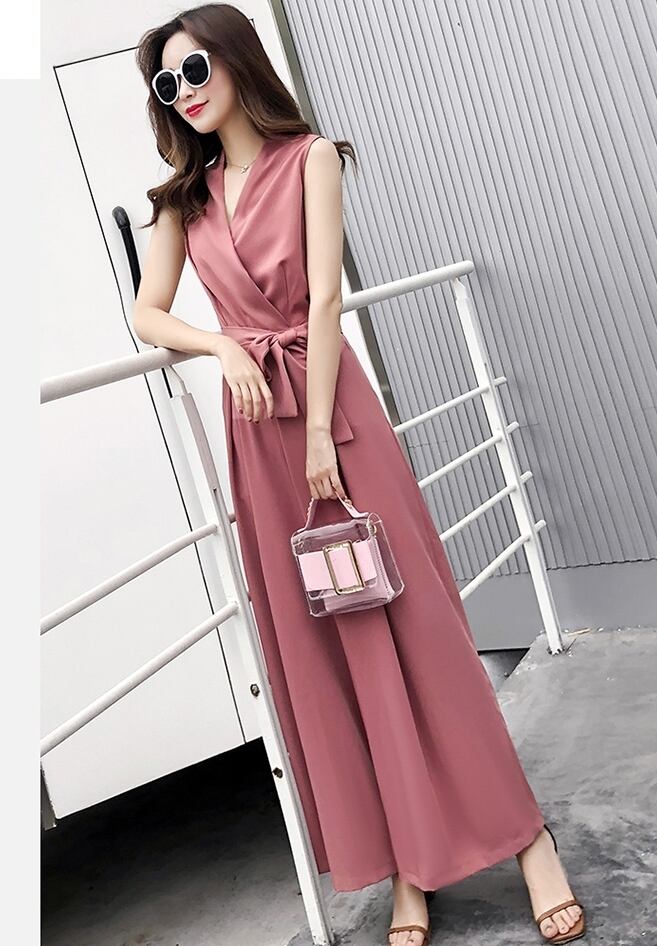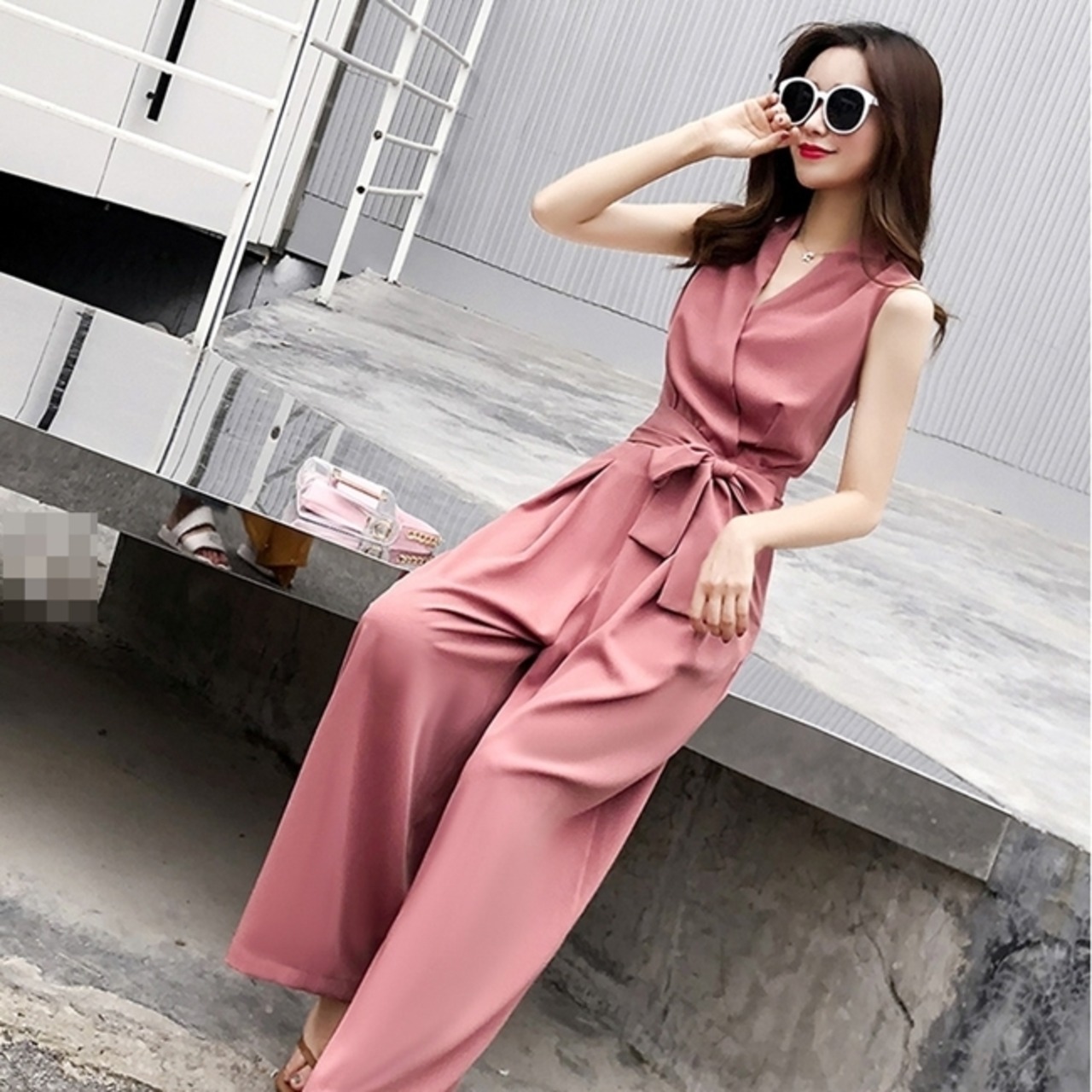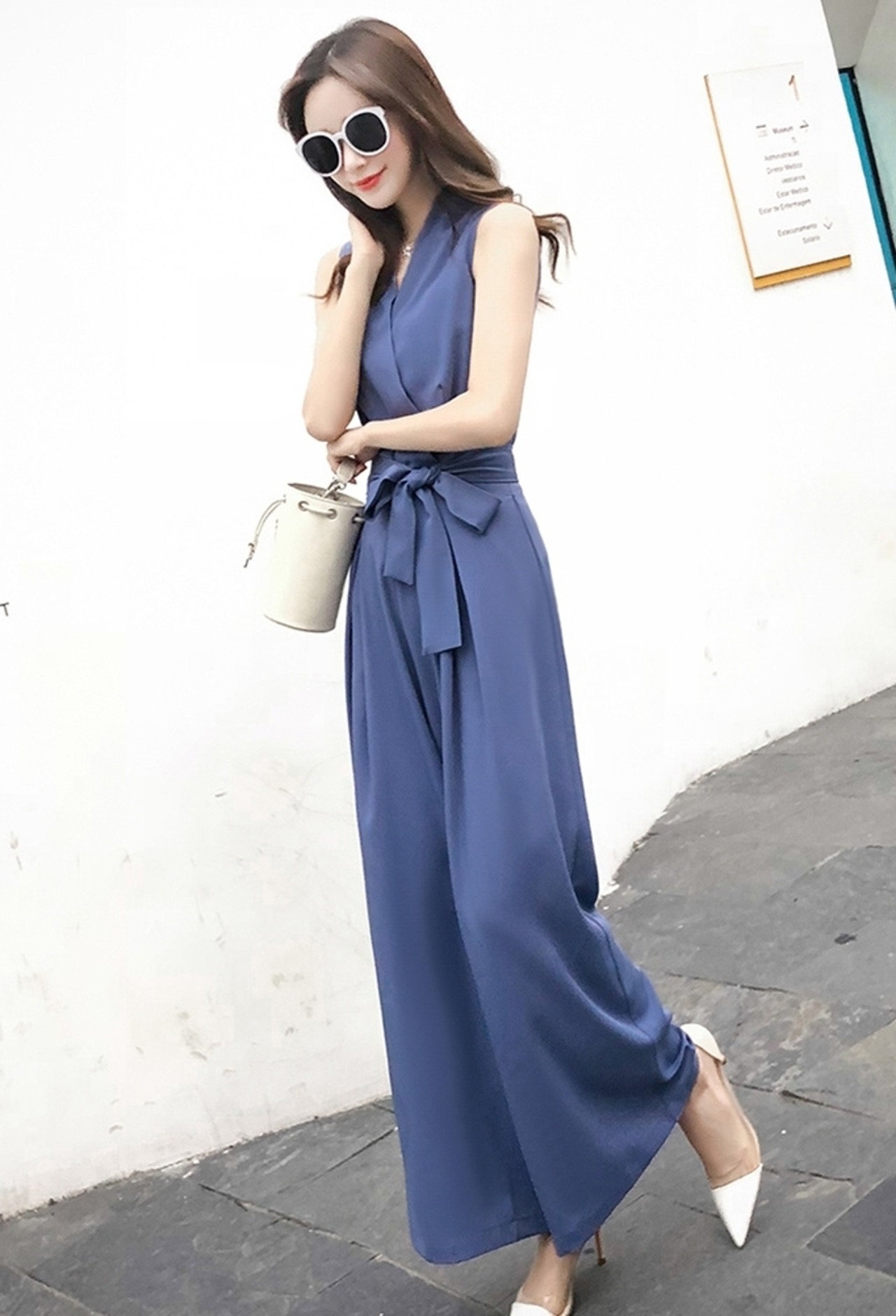 全4色 ジャンプスーツ サロペット オールインワン オーバーオール 無地 ウエストリボン カシュクールネック Vネック ノースリーブ ハイウエスト ワイドレッグ カジュアル きれいめ デート お呼ばれ 女子会 韓国ファッション 春 夏