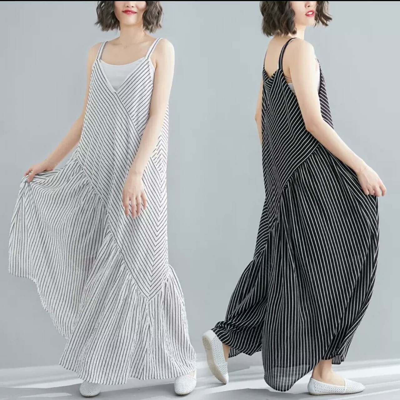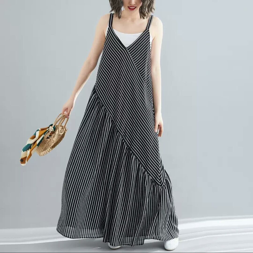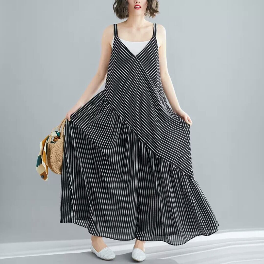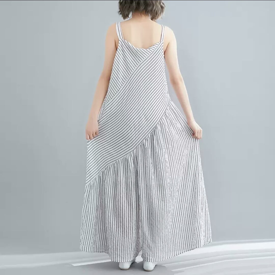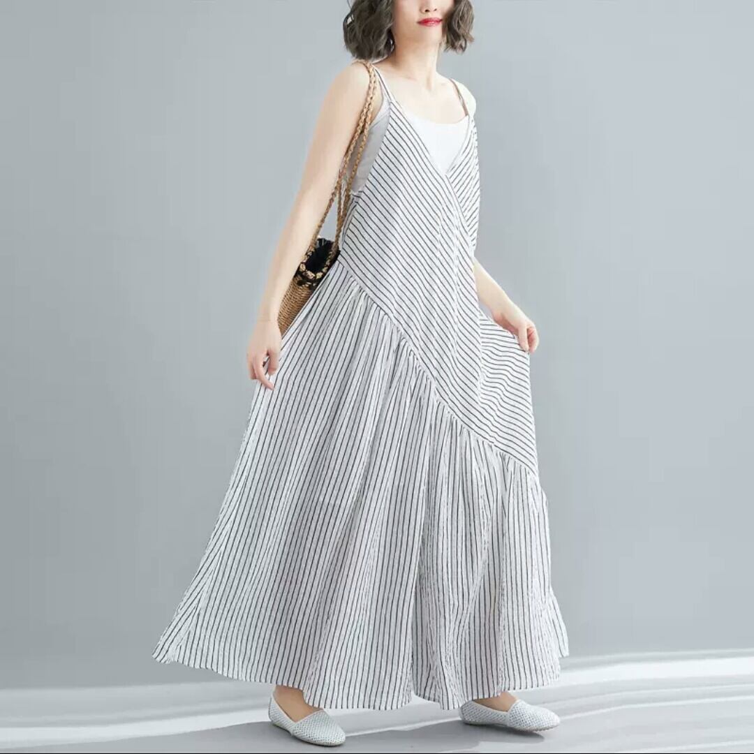 全2色 大きいサイズ ストライプ柄 ゆったり 楽チン オールインワン ジャンプスーツ ノースリーブ Vネック 大人 カジュアル 可愛い キレイめ お出かけ お買い物 デート 女子会 通勤 通学 学生 韓国ファッション 春 夏