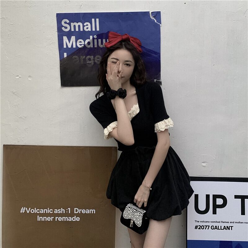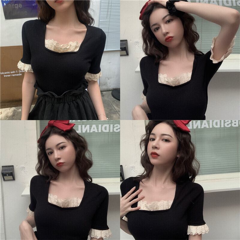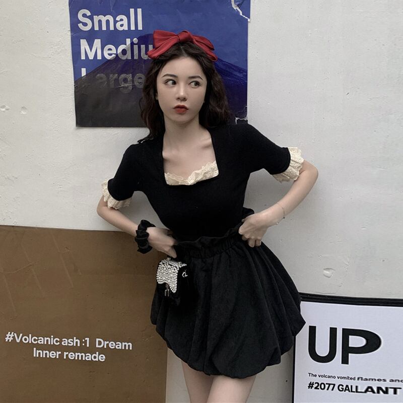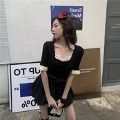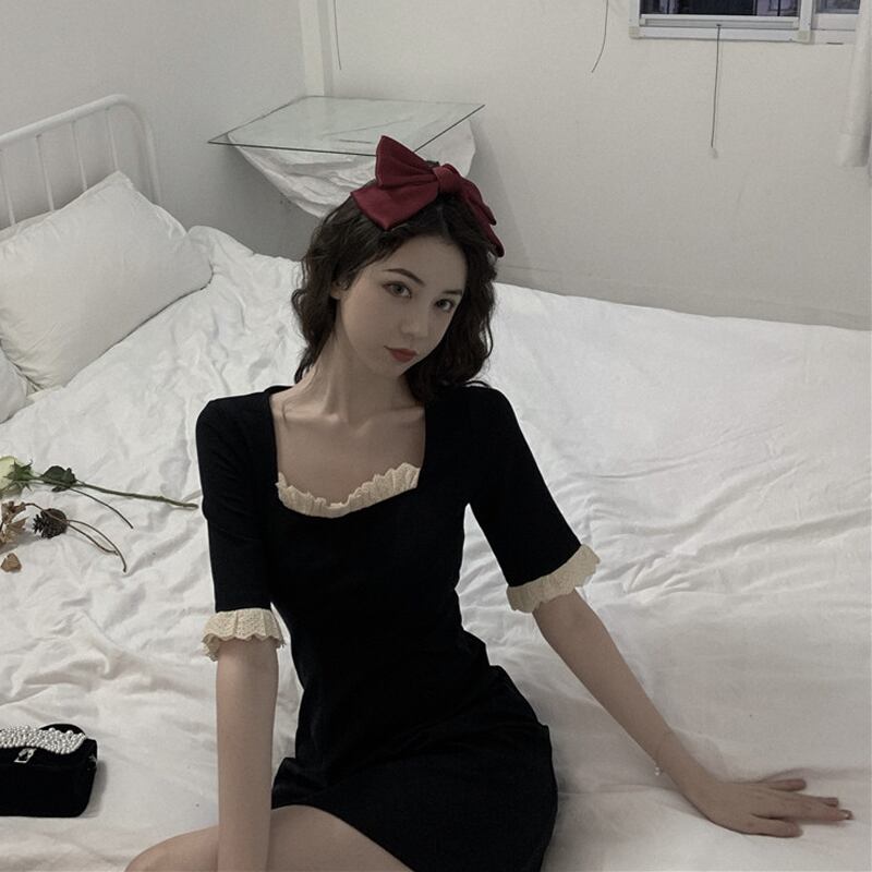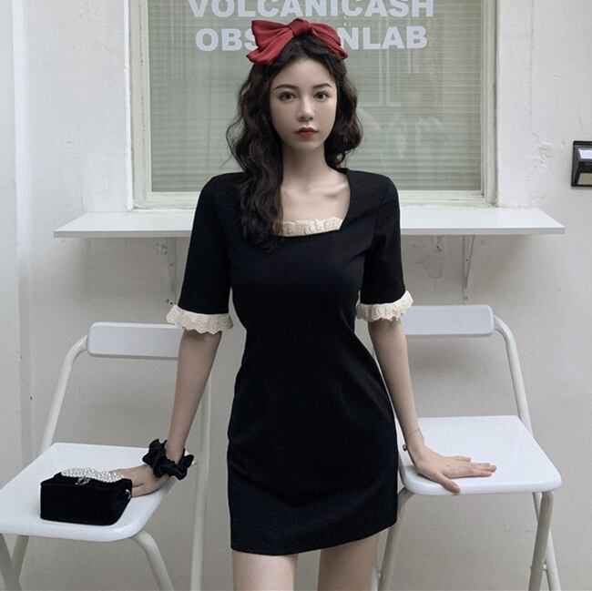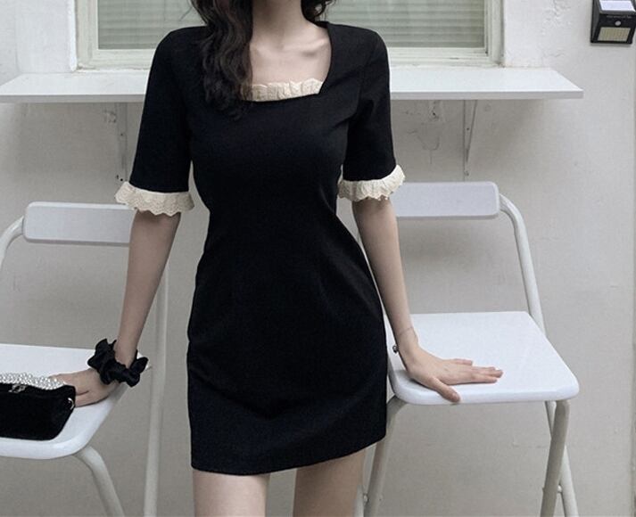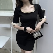 ワンピース フリル スクエアネック トランペットスリーブ ミニ丈 5分袖 スリム タイト デコルト付近のフリル バイカラー カジュアル 上品 きれいめ デート 春 夏