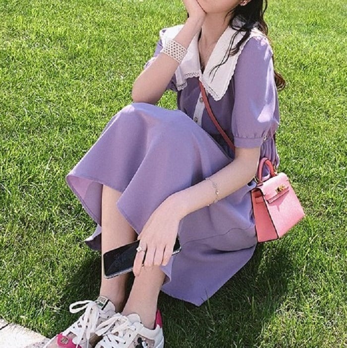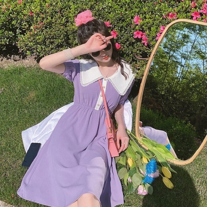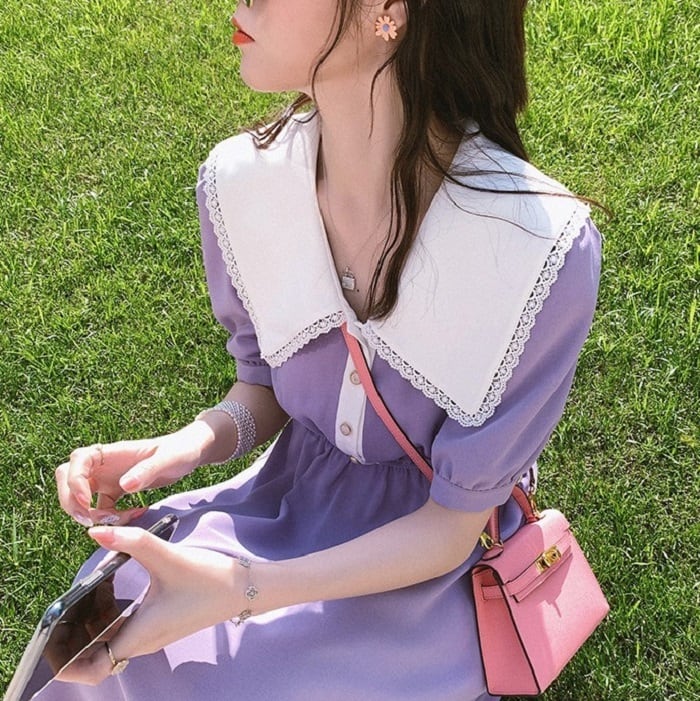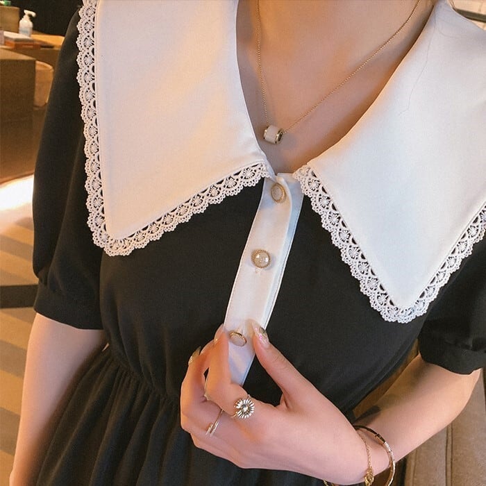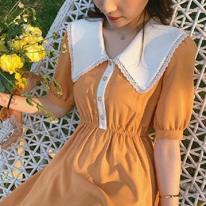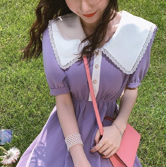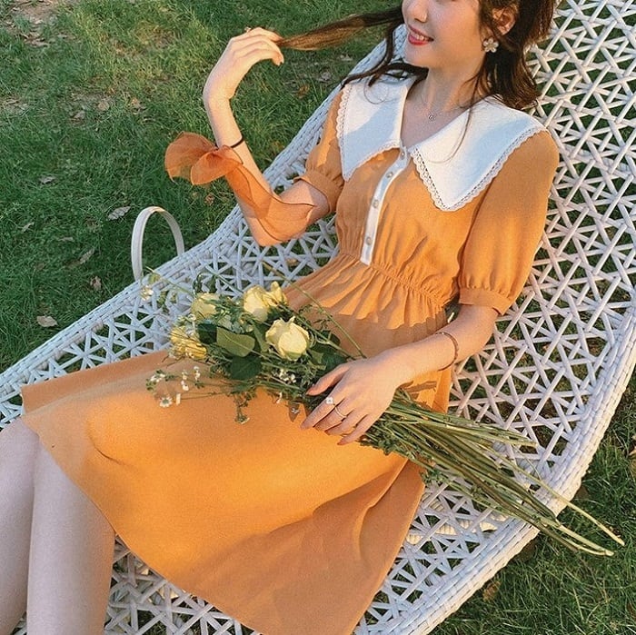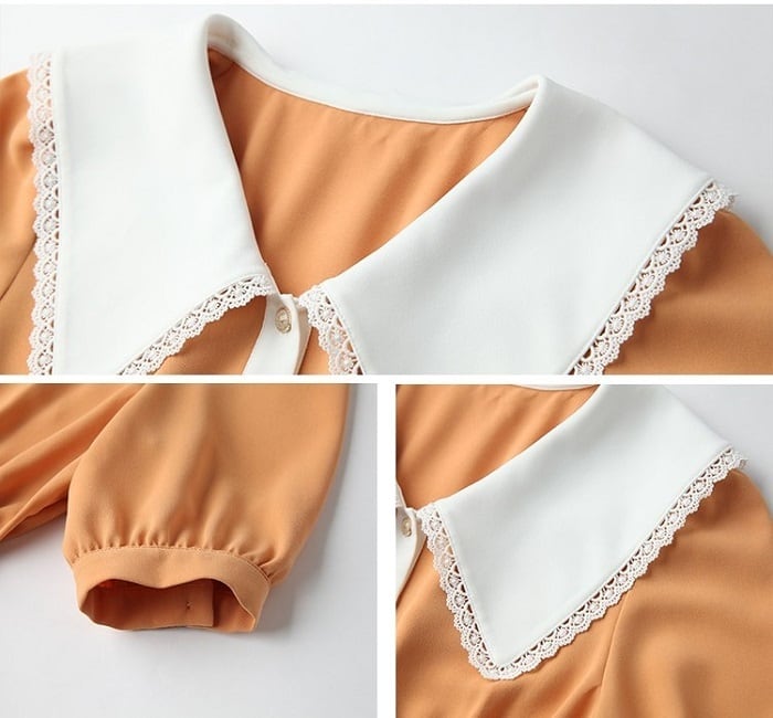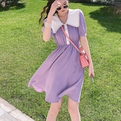 ガーリッシュな大きな襟が印象的なひざ丈ワンピースです。