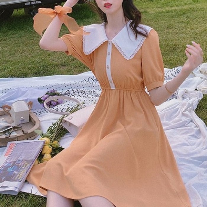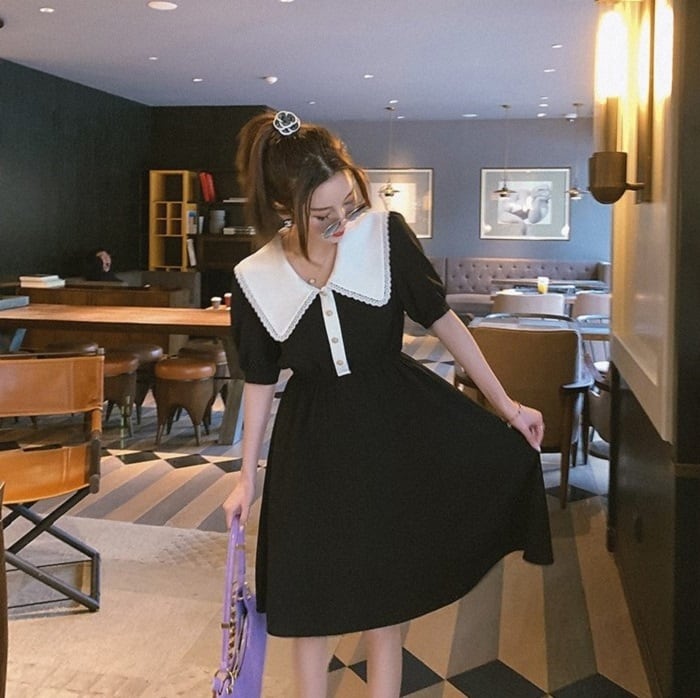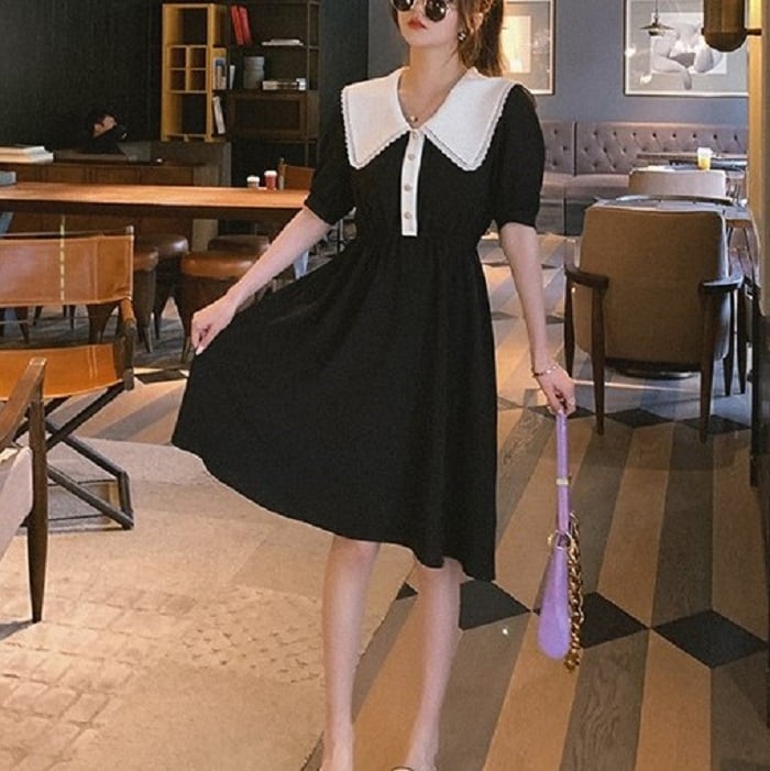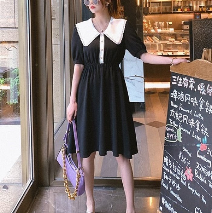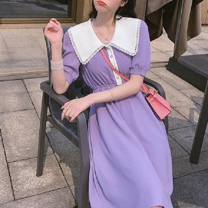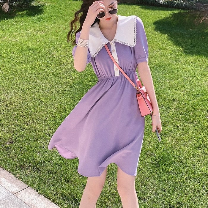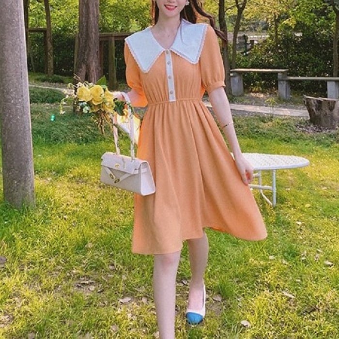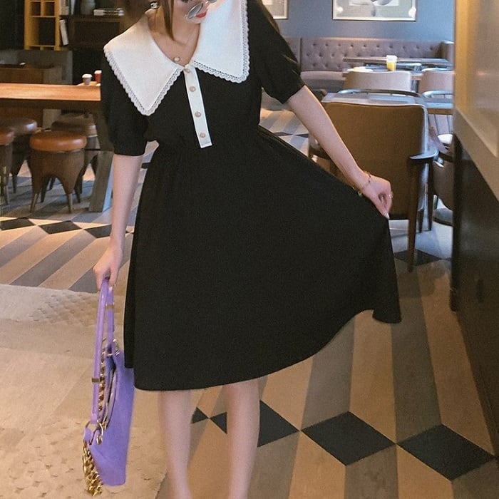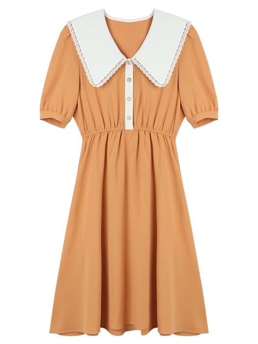 全3色 ワンピース ドレス ひざ丈 ミディ丈 大きい襟 半袖 パフスリーブ フレアスカート ウエストゴム きれいめ パーティ レトロ ガーリー ロマンチック お呼ばれ デート 夏 ブラック オレンジ パープル