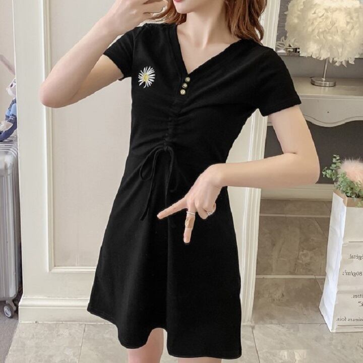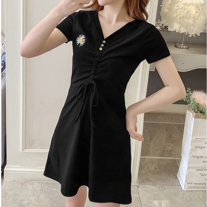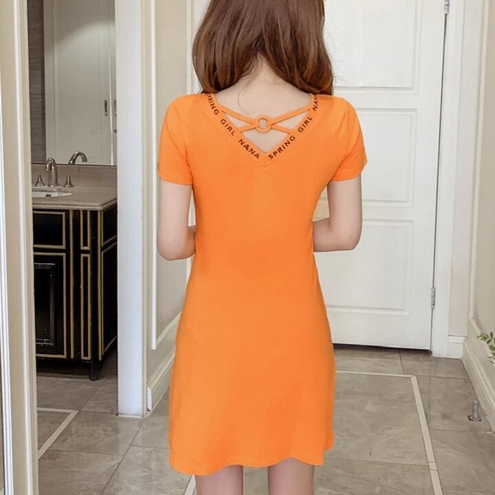 全2色 ワンピース ミニワンピース ミニ丈 Tシャツワンピース 半袖 スリム Vネック カジュアル セクシー デート デイリー 普段着 夏 ブラック オレンジ