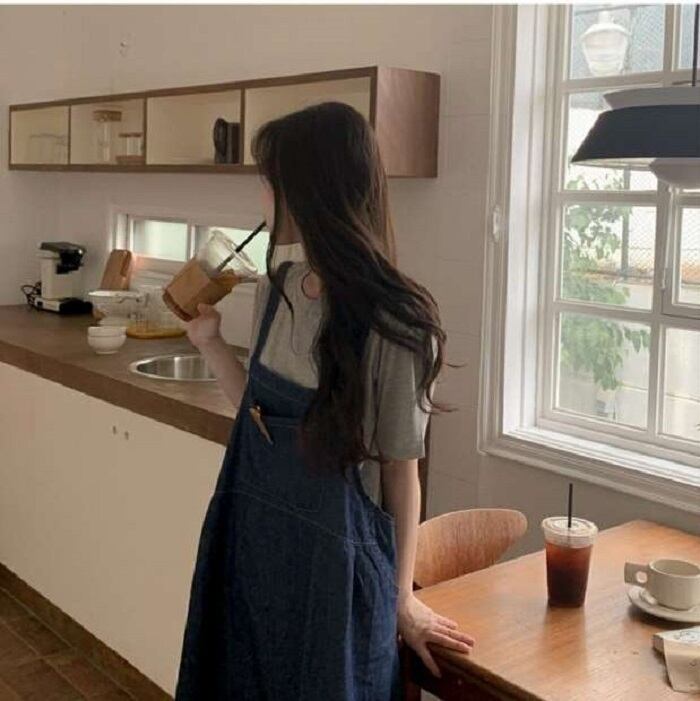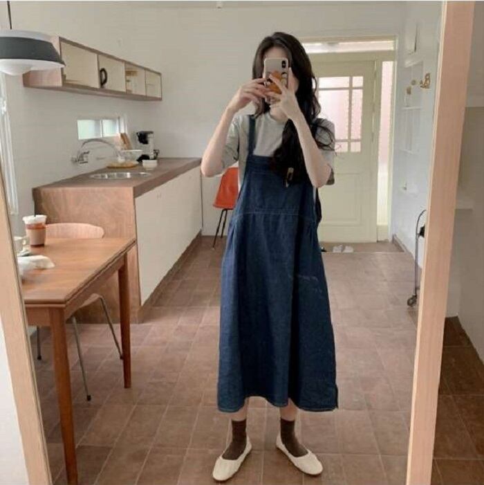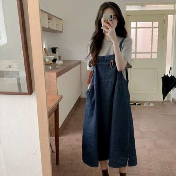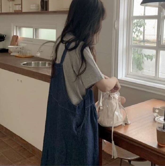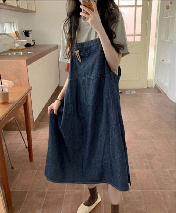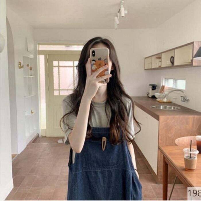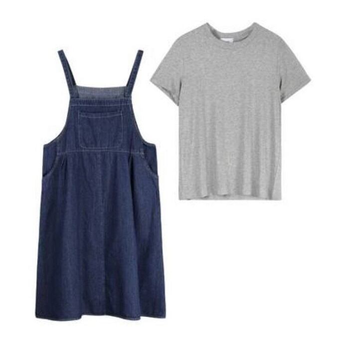 グレーの半袖Tシャツとデニムジャンパースカートのセットアップです。