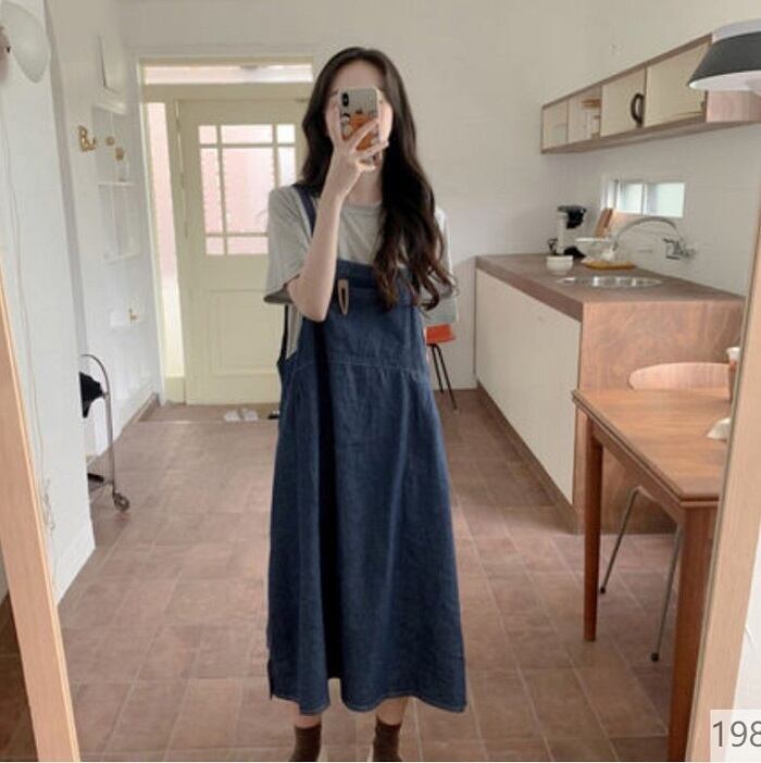 大きいサイズ セットアップ 上下セット Tシャツ ラウンドネック 半袖 ジャンパースカート サスペンダースカート デニム ロング丈 ひざ丈 無地 ゆったり 体型カバー カジュアル リゾート デイリー 普段着 2XL 3XL 4XL 夏