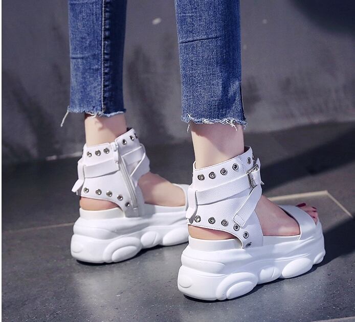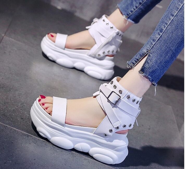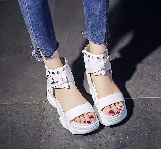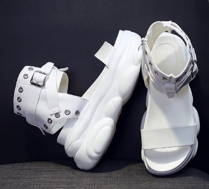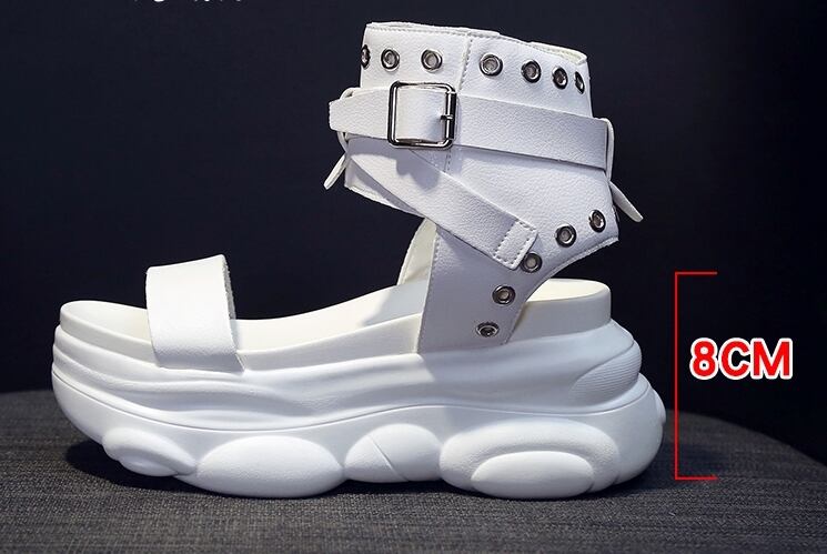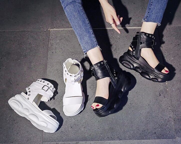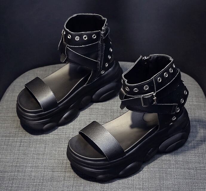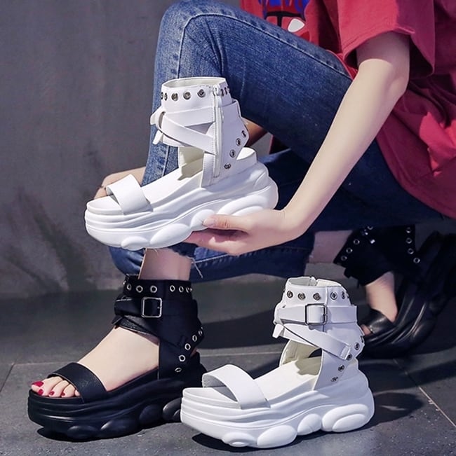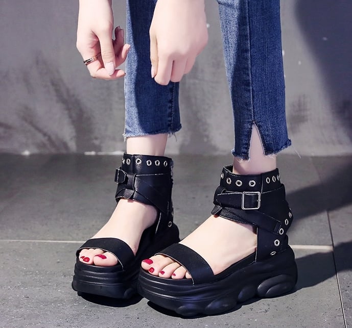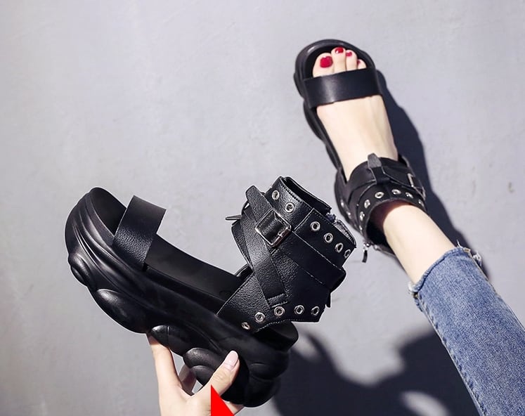 全2色 サンダル ブーツサンダル オープントゥ 厚底 プラットフォームサンダル ウェッジソールサンダル ストラップ アンクルベルト ハイヒール 大人 カジュアル ロック クール シック お出かけ デート 学生 春 夏