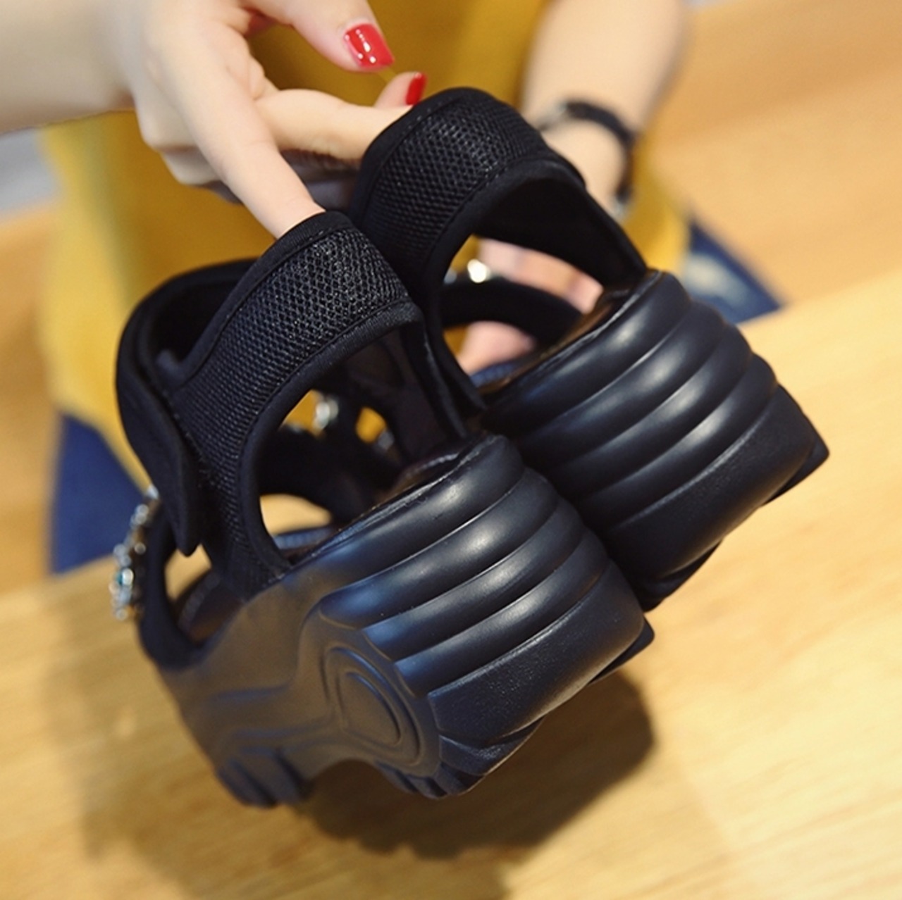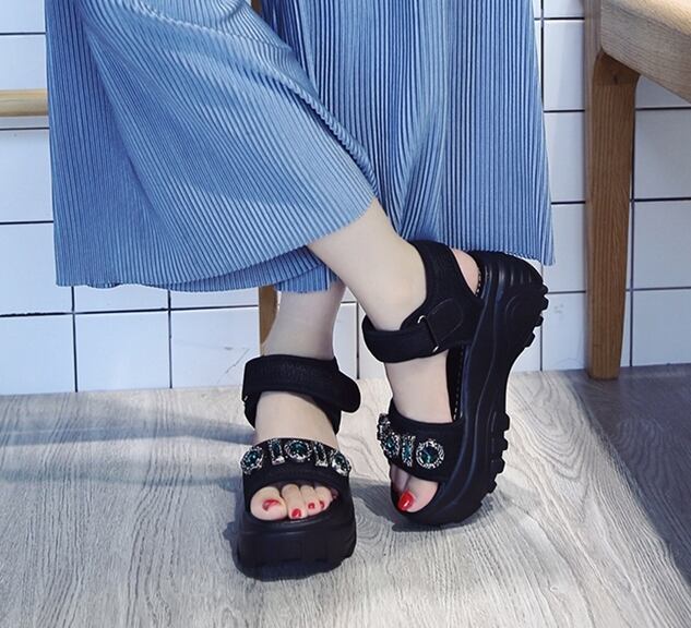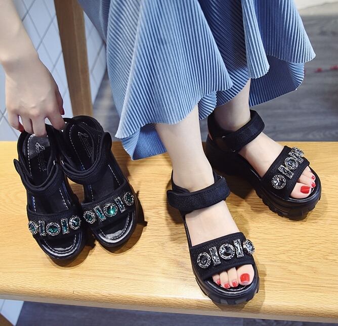 キラキラ輝くビジューが上品な厚底サンダル。