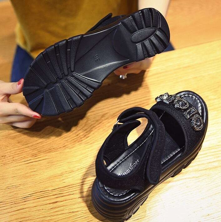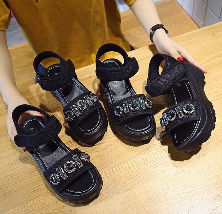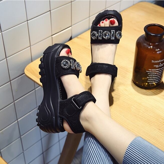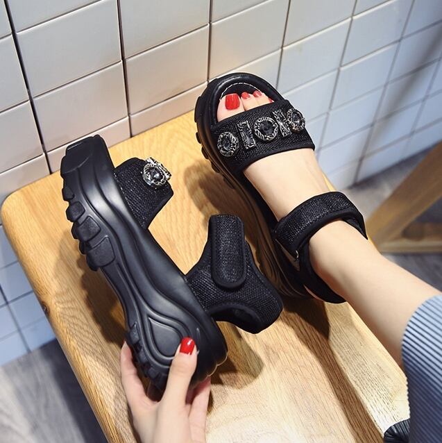 全2色 厚底サンダル オープントゥ アンクルベルト ビジュー ストーン 光沢 プラットフォームサンダル ハイヒール シック ウェッジソールサンダル カジュアル きれいめ お出かけ デート 韓国ファッション 春 夏