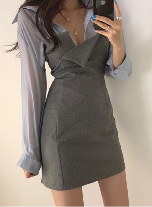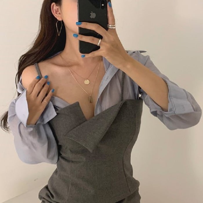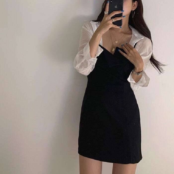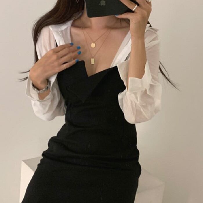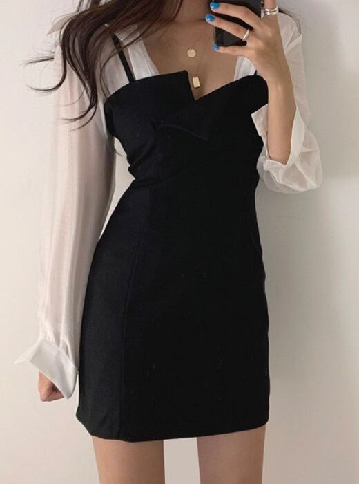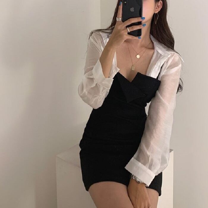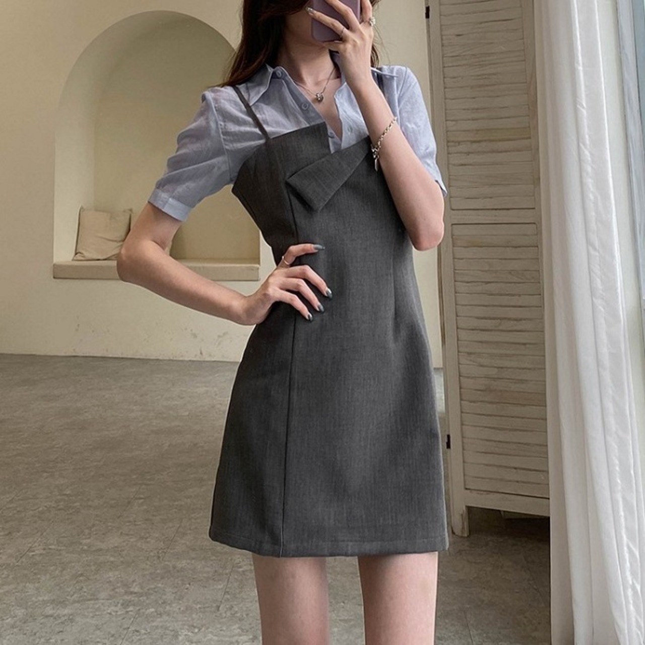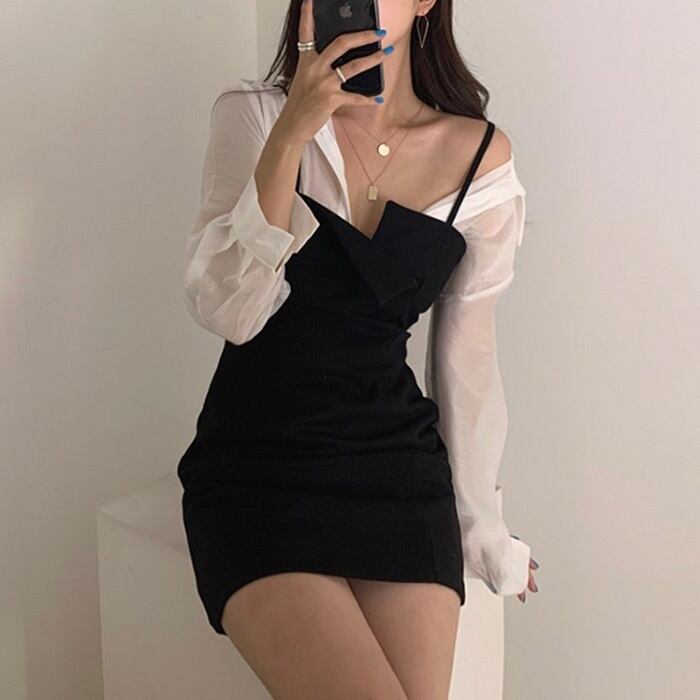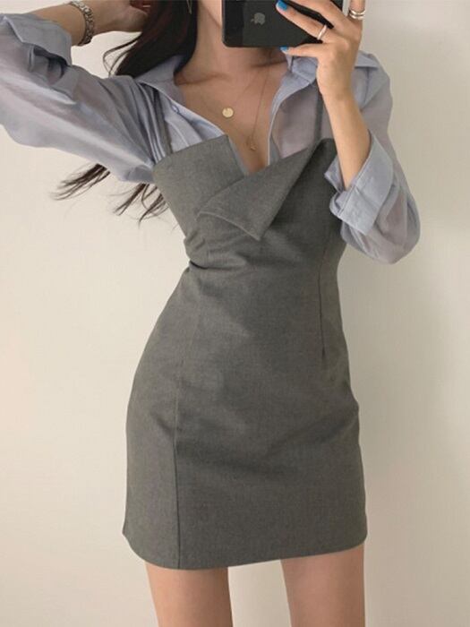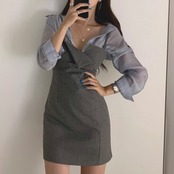 全2色 セットアップ 2点セット シャツ ブラウス 長袖 ジャンパースカート キャミワンピ ミニ丈 ハイウエスト カジュアル セクシー お出かけ デート デイリー 普段着 グレー ブラック