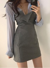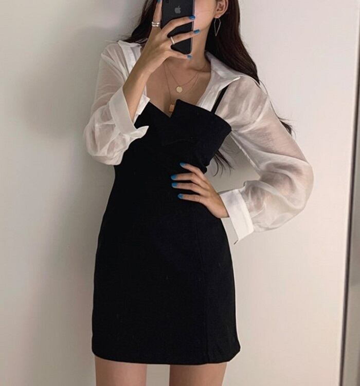 透け感のある長袖ブラウスとミニ丈キャミワンピのセットアップです。