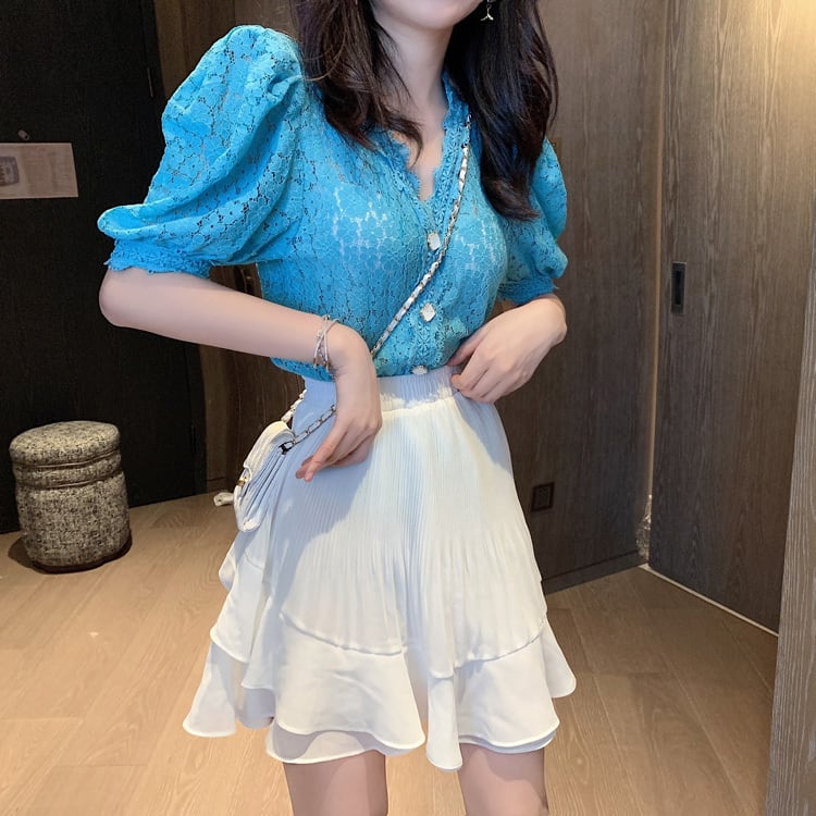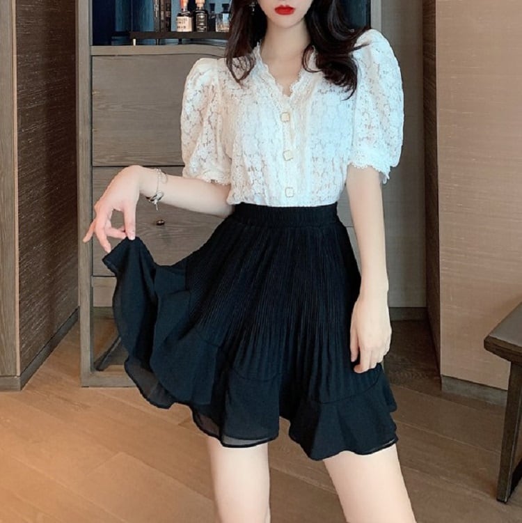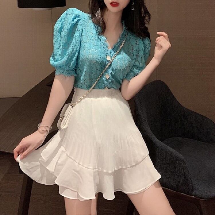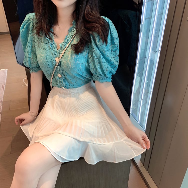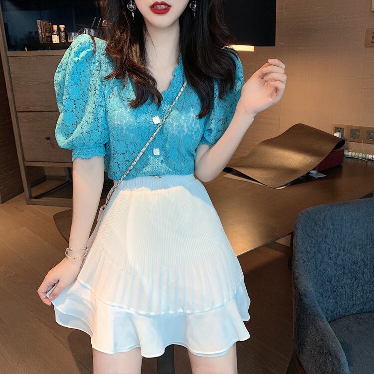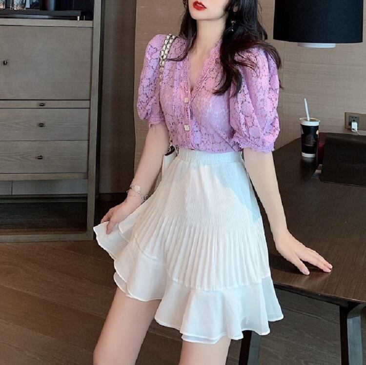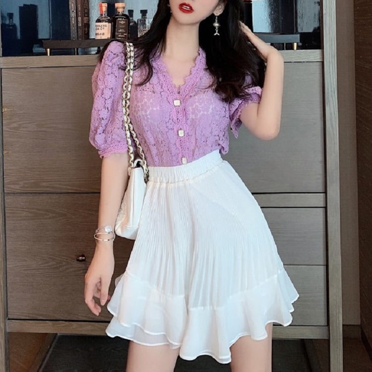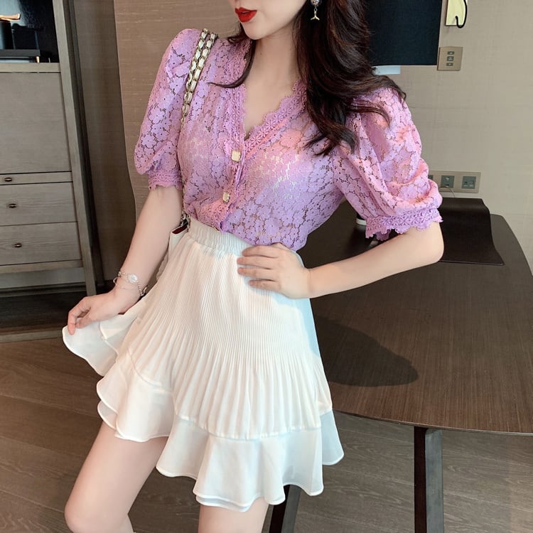 全3色 セットアップ 上下セット レースブラウス 半袖 パフスリーブ Vネック ミニスカート フレアスカート プリーツ きれいめ フェミニン お出かけ デート パーティ 夏 ホワイト ブラック パープル グリーン