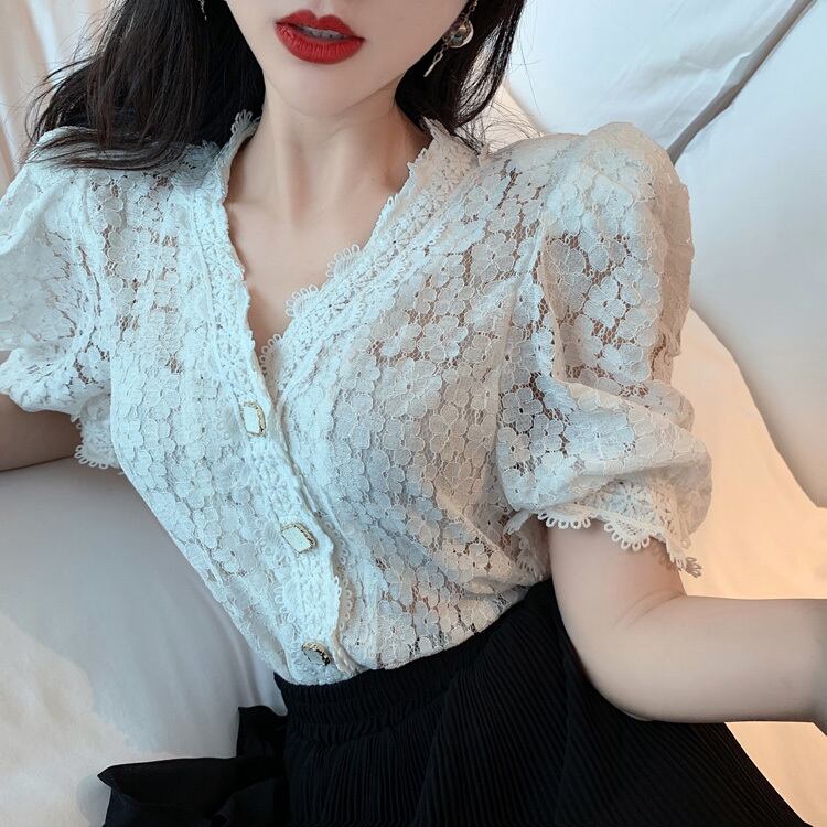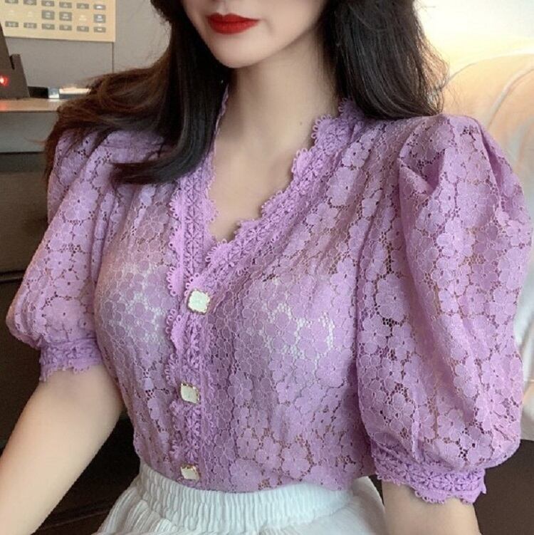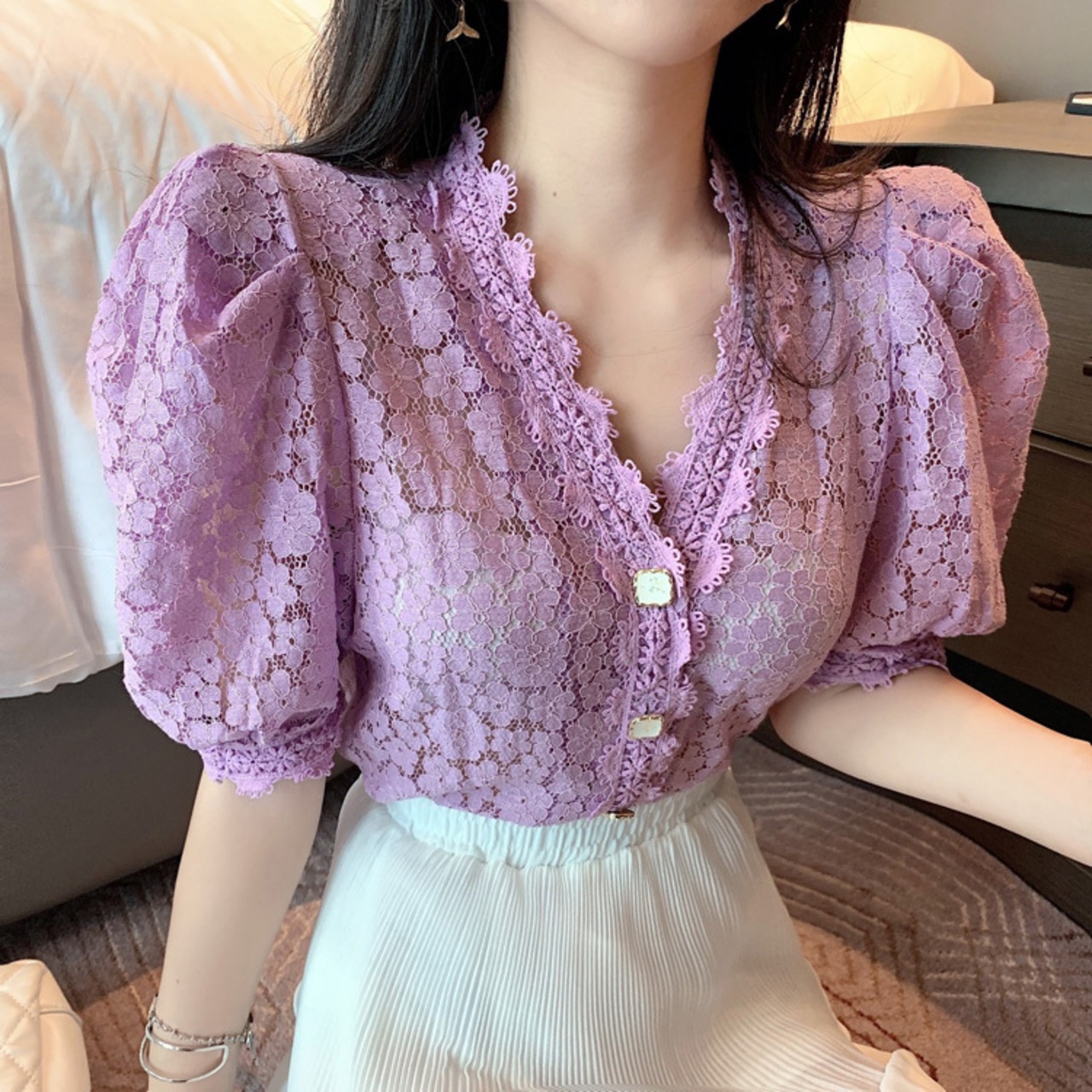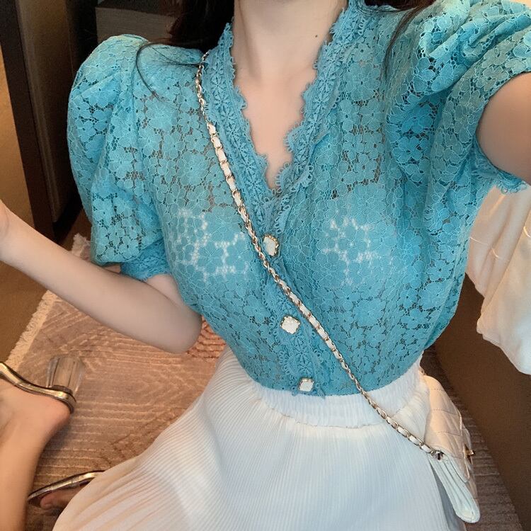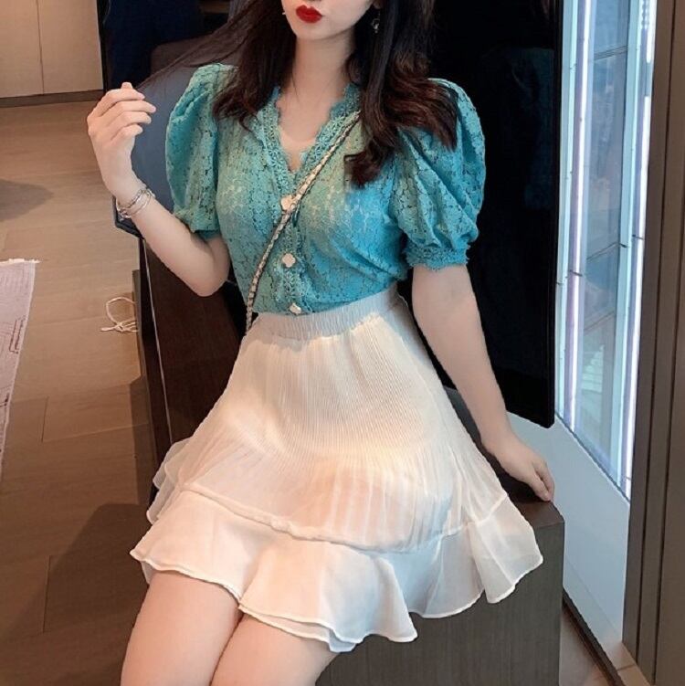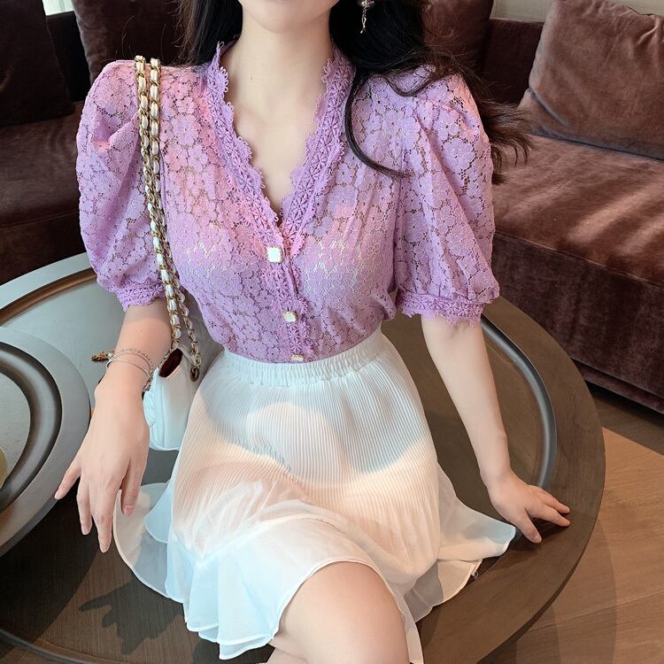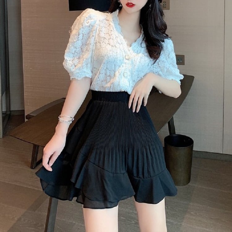 全3色 セットアップ 上下セット レースブラウス 半袖 パフスリーブ Vネック ミニスカート フレアスカート プリーツ きれいめ フェミニン お出かけ デート パーティ 夏 ホワイト ブラック パープル グリーン
