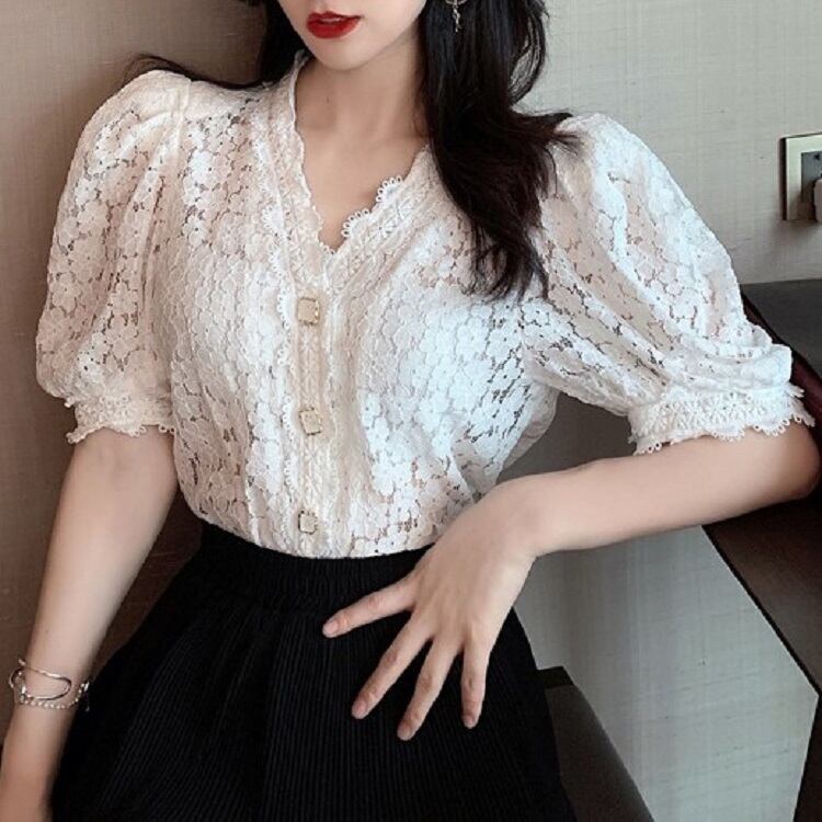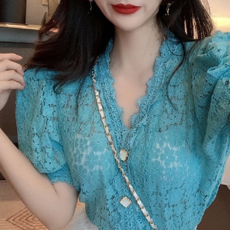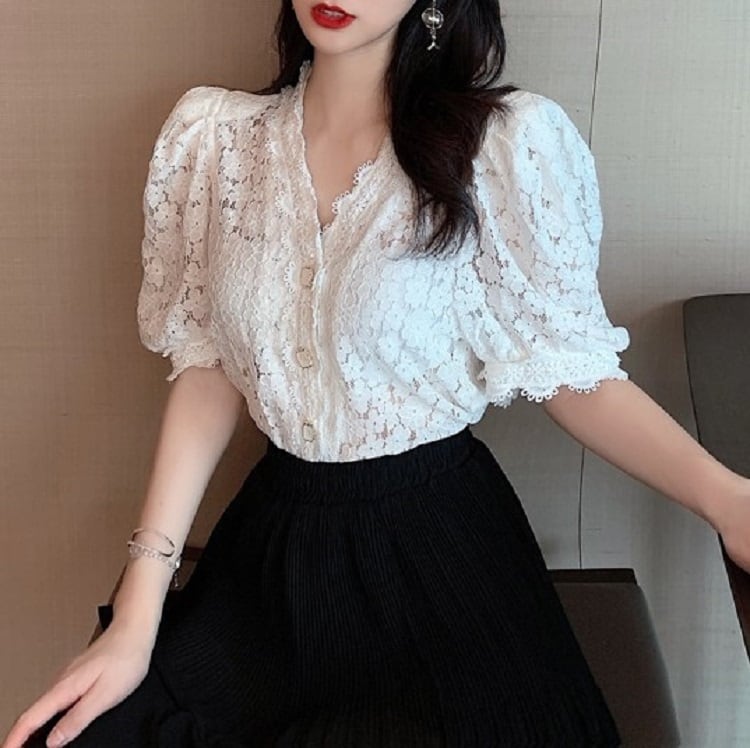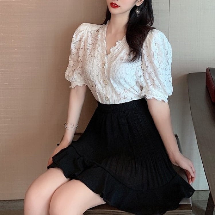 透け感のあるレースブラウスとミニスカートのセットアップです。