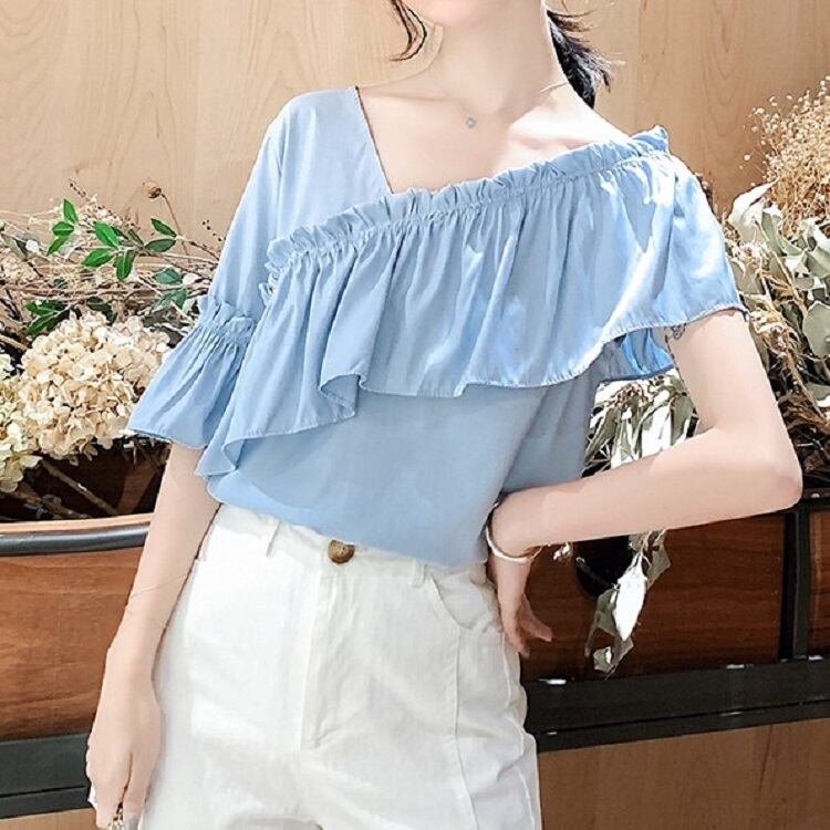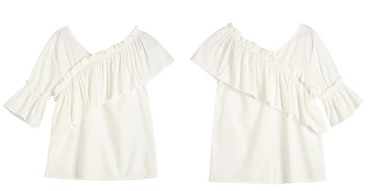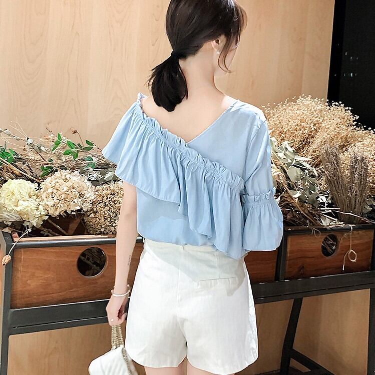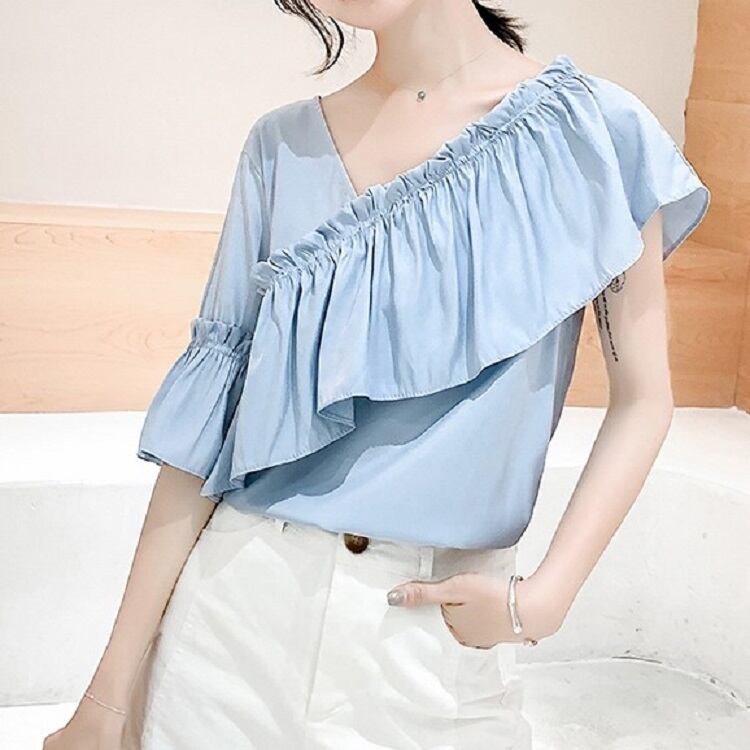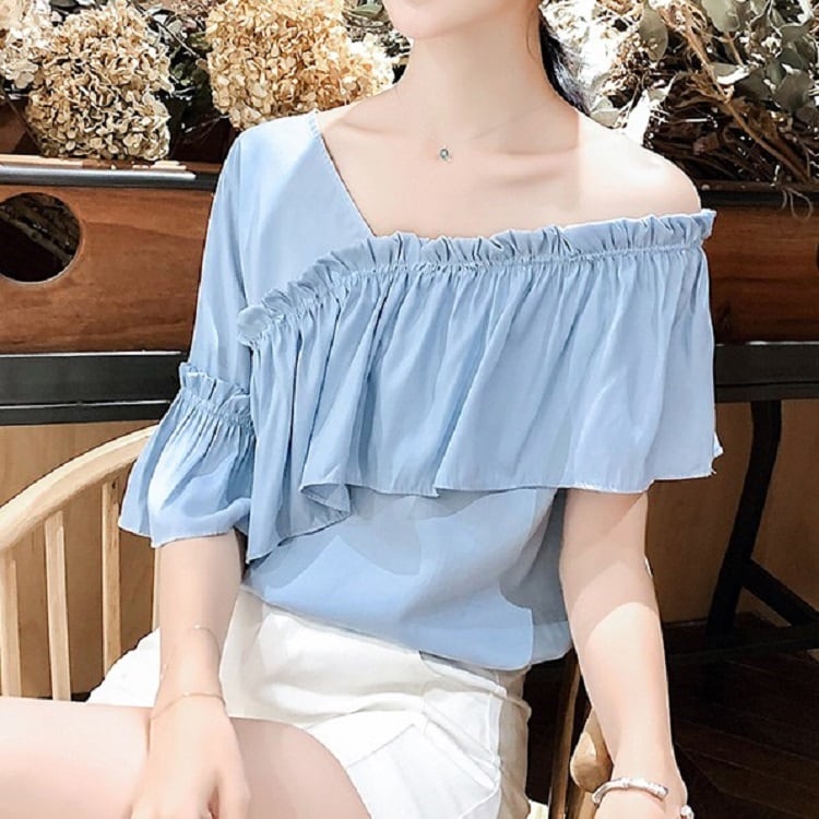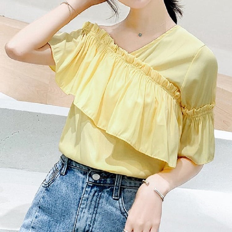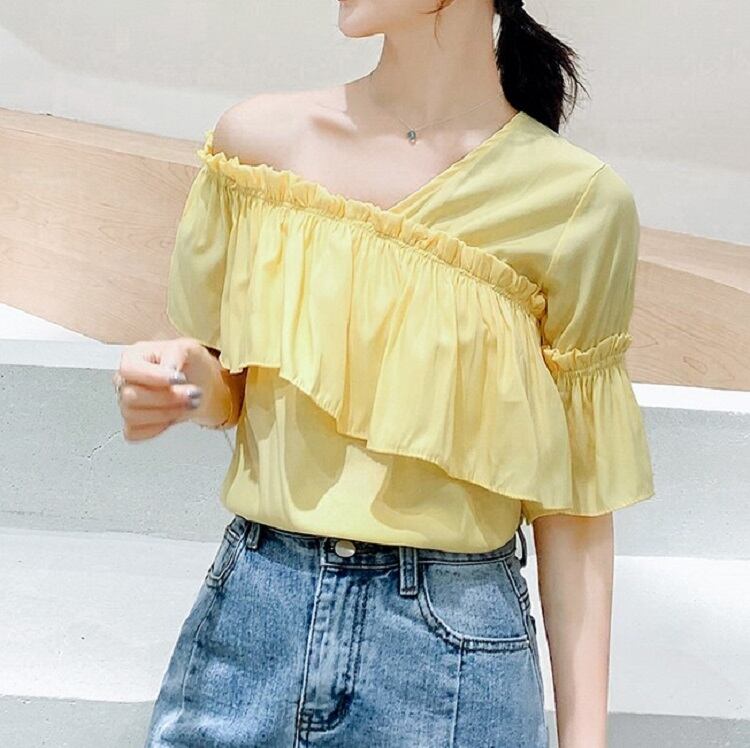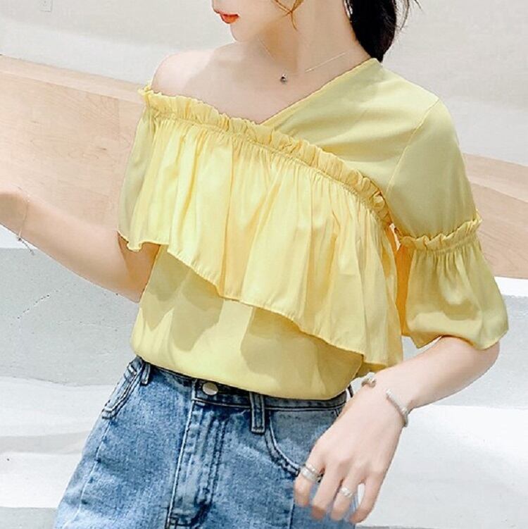 全3色 トップス ブラウス オフショル 鎖骨見せ フリル Vネック 半袖 アシンメトリー かわいい きれいめ セクシー カジュアル お出かけ デート 夏 リゾート デイリー ホワイト ブルー イエロー