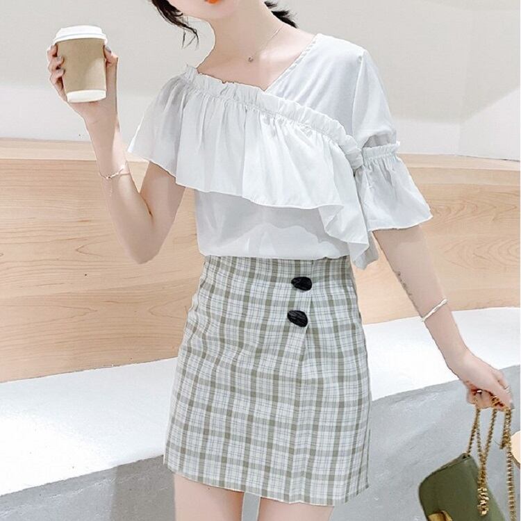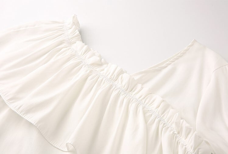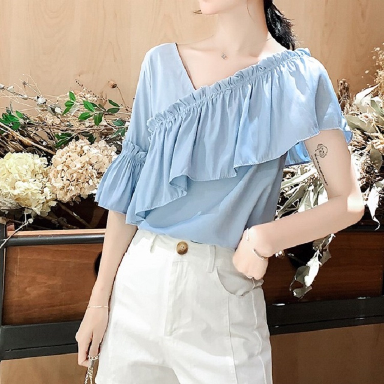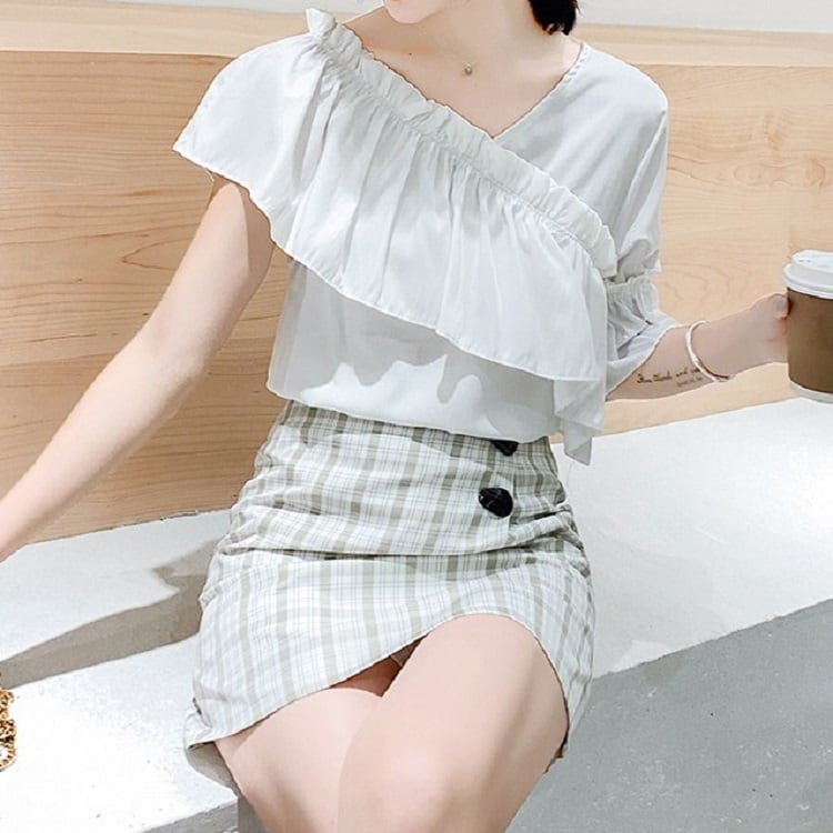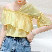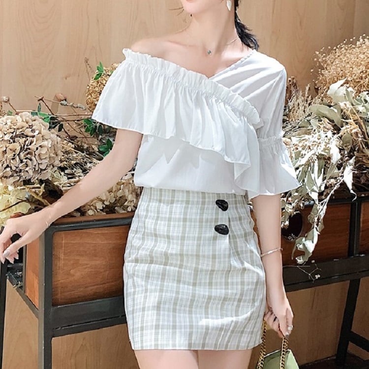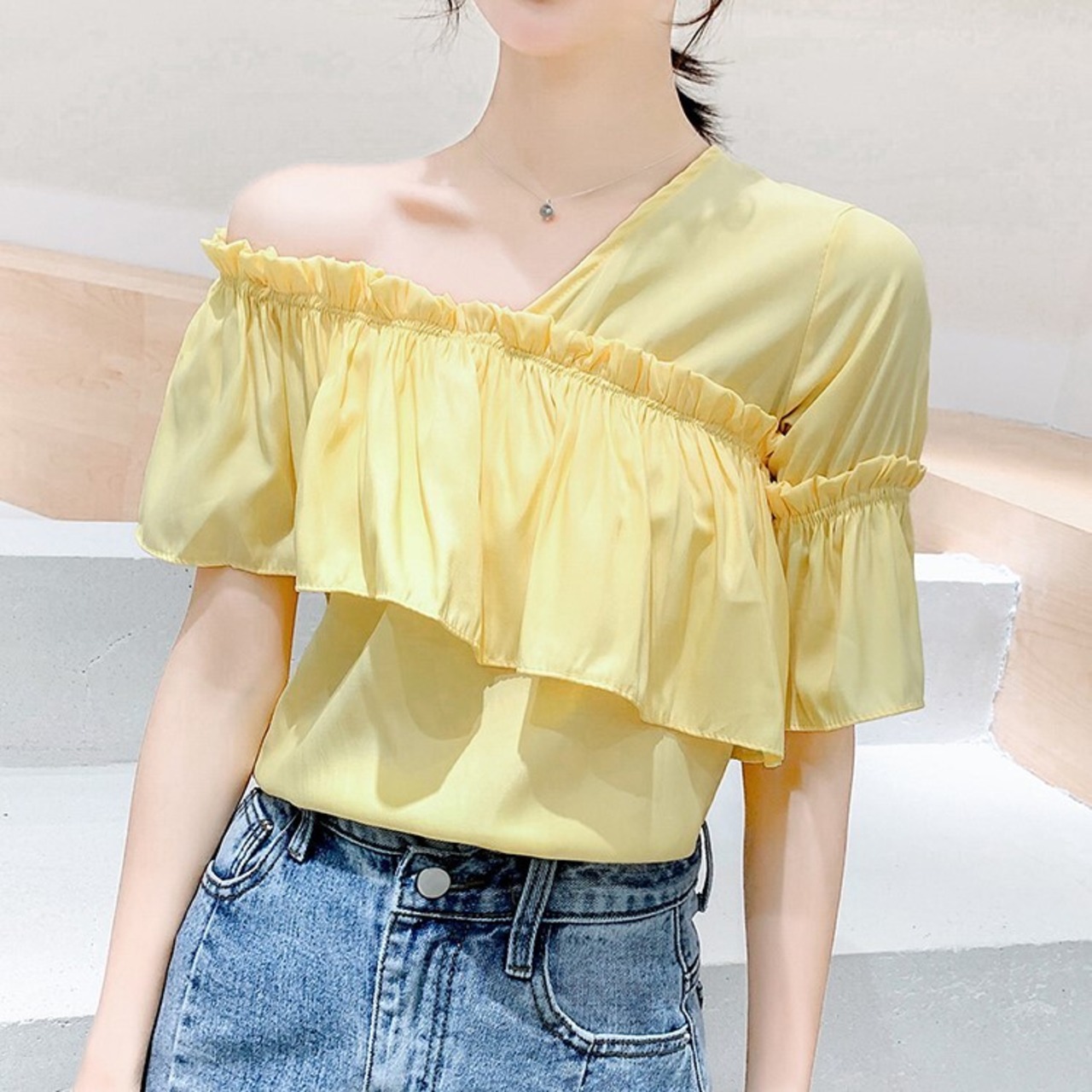 全3色 トップス ブラウス オフショル 鎖骨見せ フリル Vネック 半袖 アシンメトリー かわいい きれいめ セクシー カジュアル お出かけ デート 夏 リゾート デイリー ホワイト ブルー イエロー