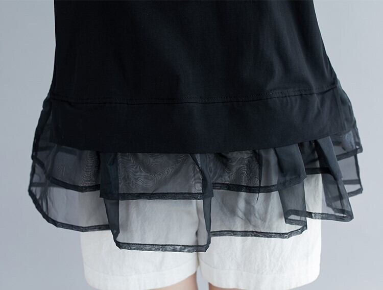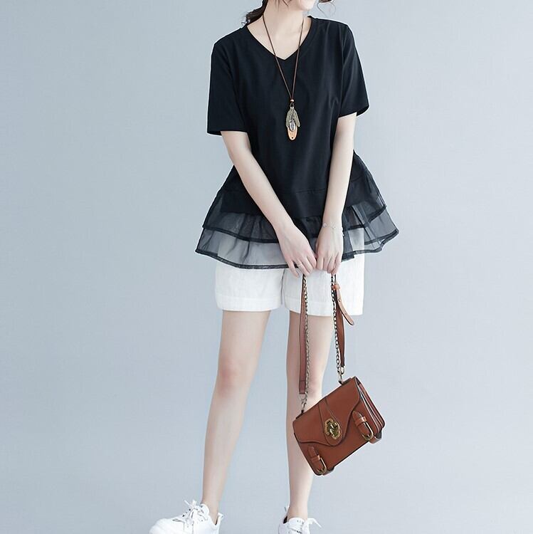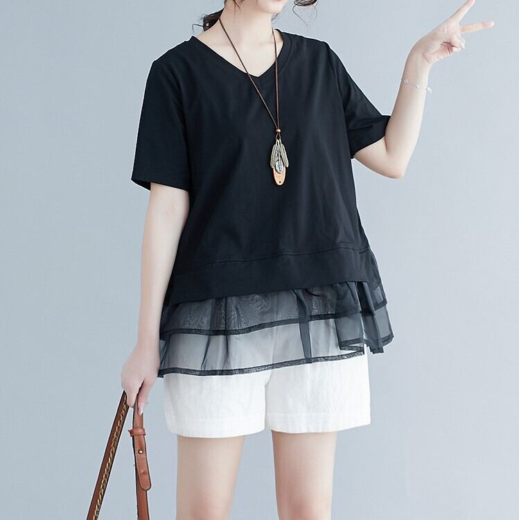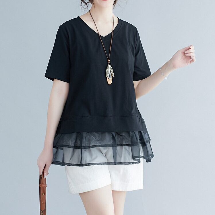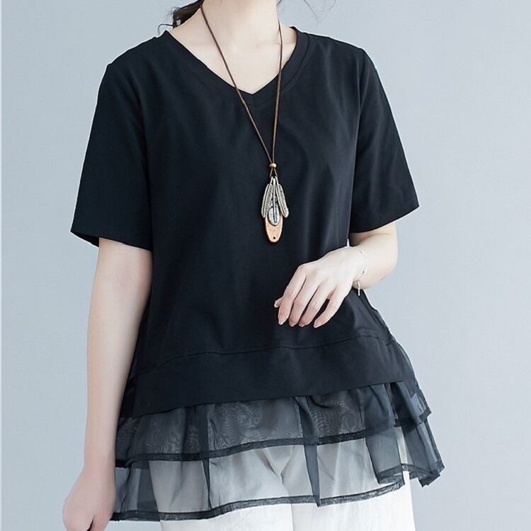 トップス ブラウス Vネック 半袖 プルオーバー フリル レース 透け感 かわいい きれいめ カジュアル お出かけ デート 夏 リゾート デイリー ブラック
