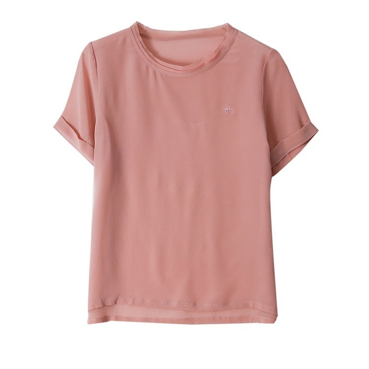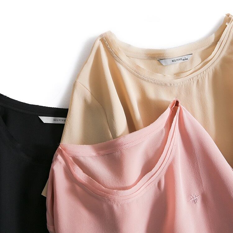 全4色 大きいサイズ シルクTシャツ トップス 半袖 ラウンドネック プルオーバー 無地 インナー かわいい きれいめ カジュアル 夏 リゾート デイリー ピンク グリーン ブラック ベージュ