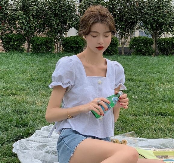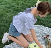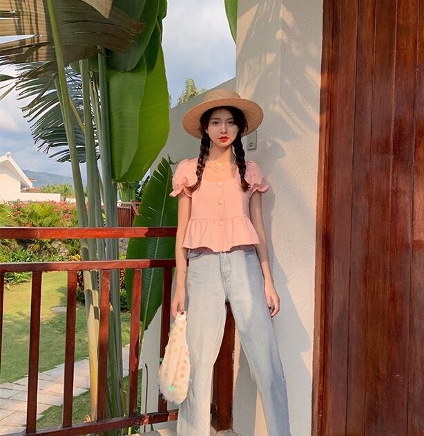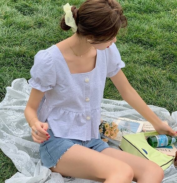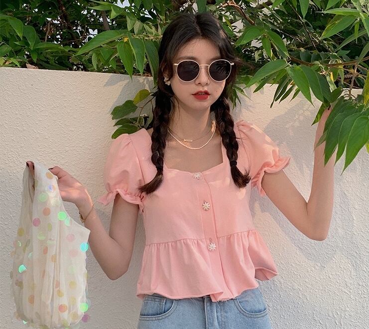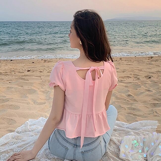 全2色トップス ペプラム Tシャツ ブラウス バックリボン バックコンシャス ショート丈 フリル 半袖 パフスリーブ フリル スクエアネック フロントボタン カジュアル ガーリー リゾート 可愛い デート 春 夏