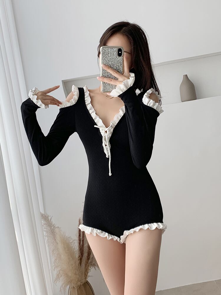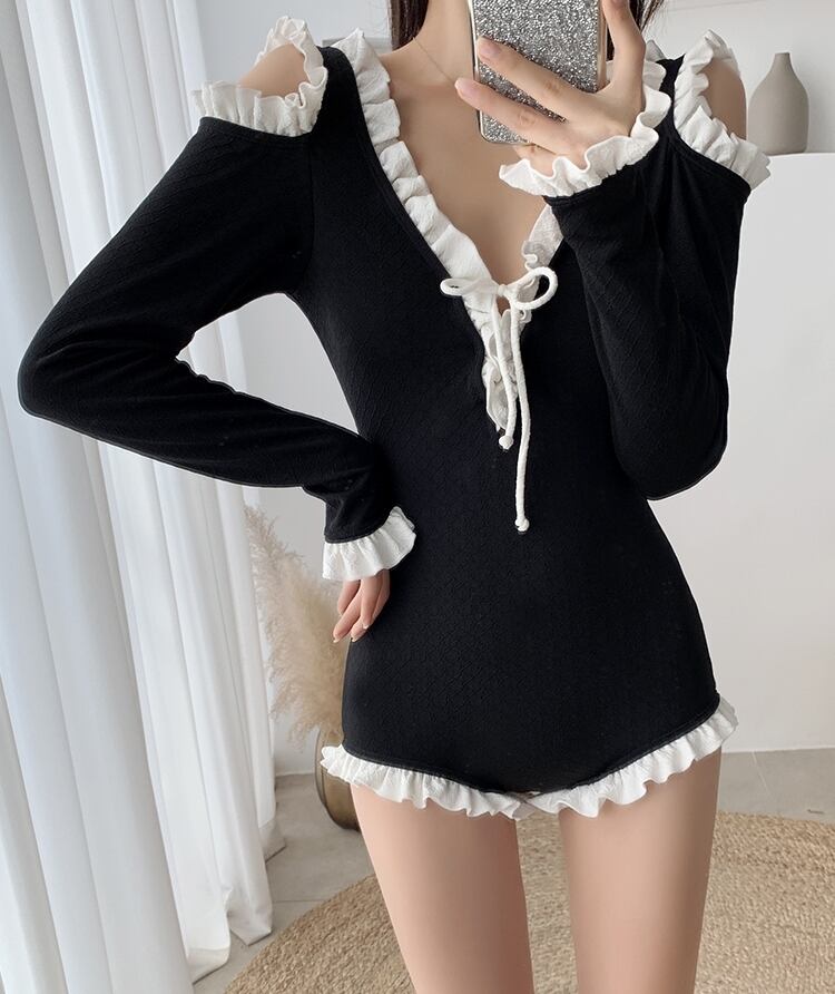 ワンピース水着 ビキニ 長袖水着 ワイヤーなし フリル レースアップ オープンショルダー バイカラー 可愛い ガーリー ビーチ 海 バカンス プール モノトーン リゾート 大人 上品 韓国ファッション 夏