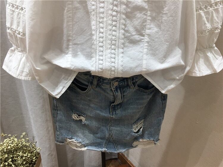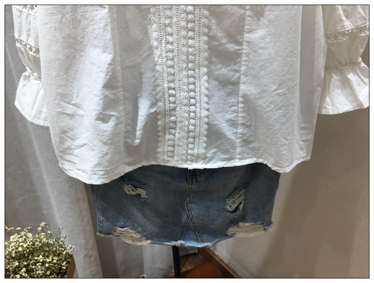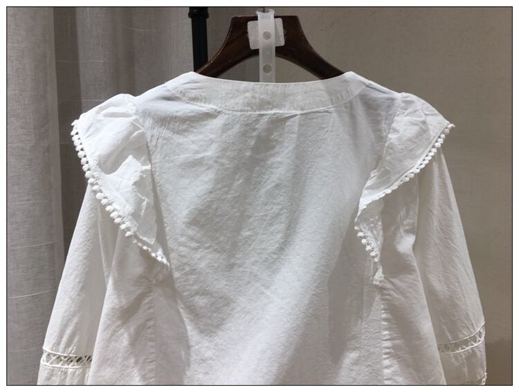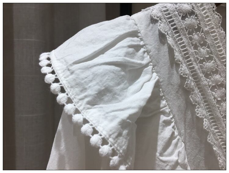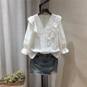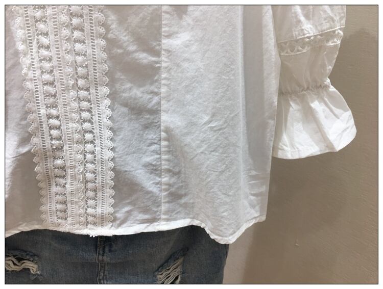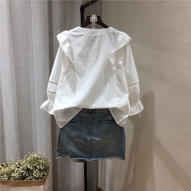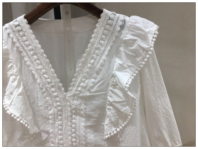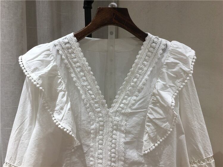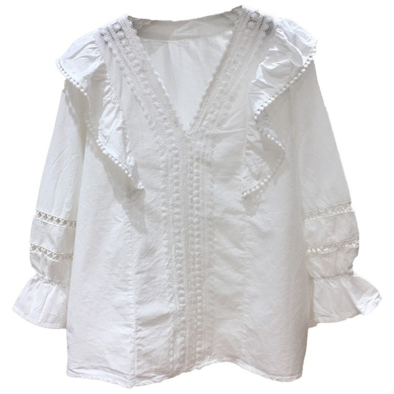 ブラウス トップス Vネック 七分袖 パフスリーブ コットンレース フリル きれいめ カジュアル ガーリー 可愛い フェミニン 上品 お出かけ デート 女子会 ゆったり 体型カバー 夏 ホワイト