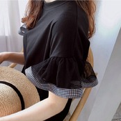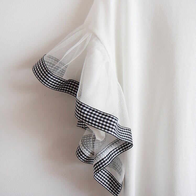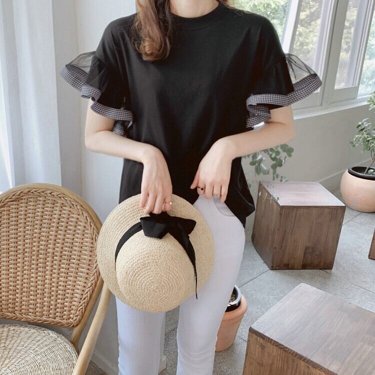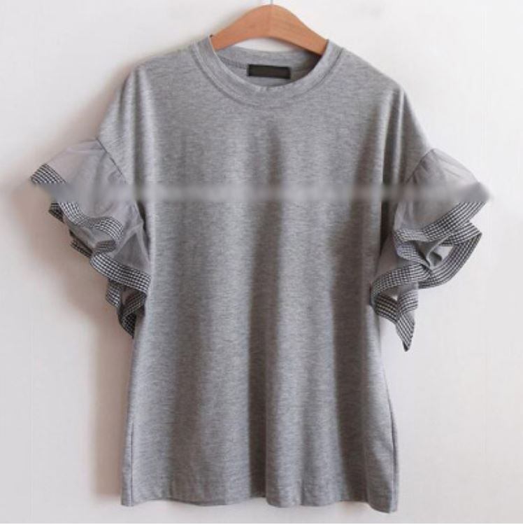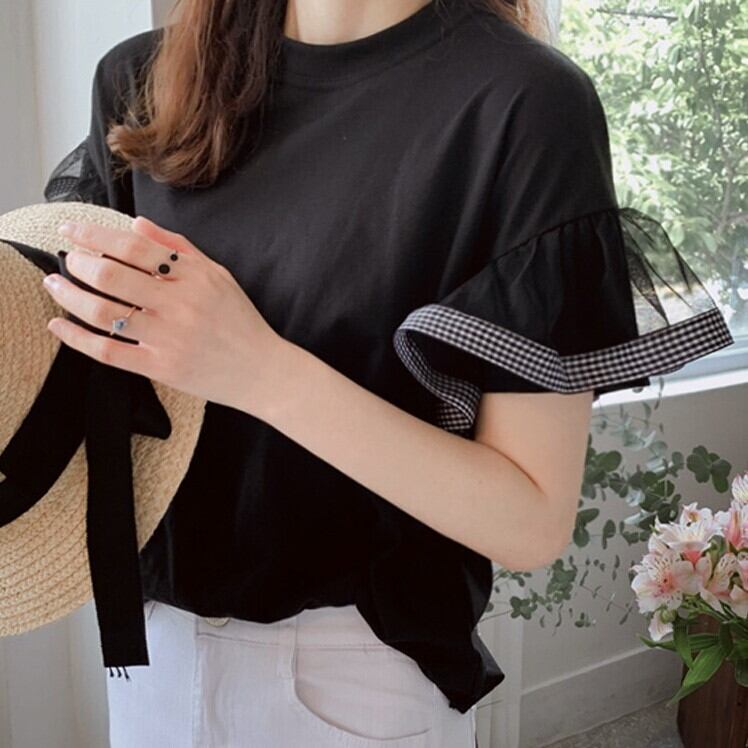 全3色 Tシャツ カットソー トップス ラウンドネック フリル袖 レース きれいめ カジュアル 可愛い フェミニン 上品 お出かけ デイリー 夏 グレー ブラック ホワイト