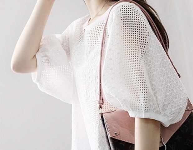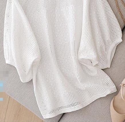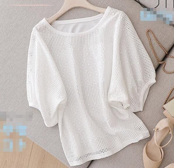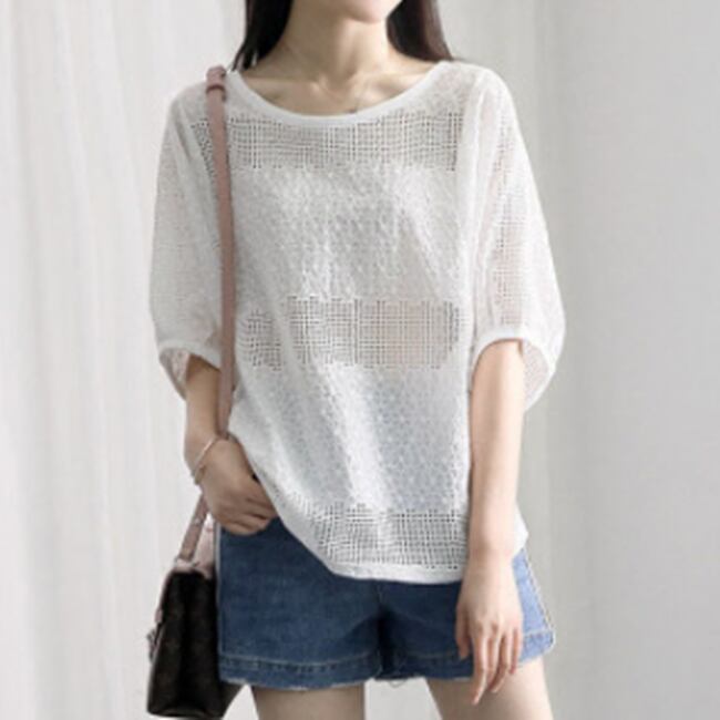 トップス ブラウス レース アイレットレース ラウンドネック 5分袖 ゆったり シースルー カジュアル 大人 リゾート お出かけ 花柄 大人可愛い 夏