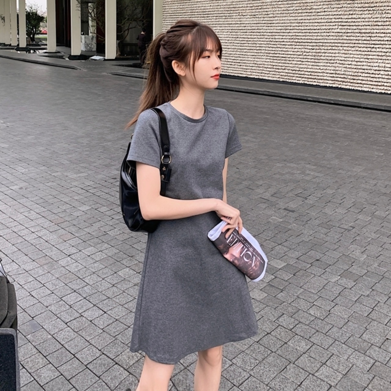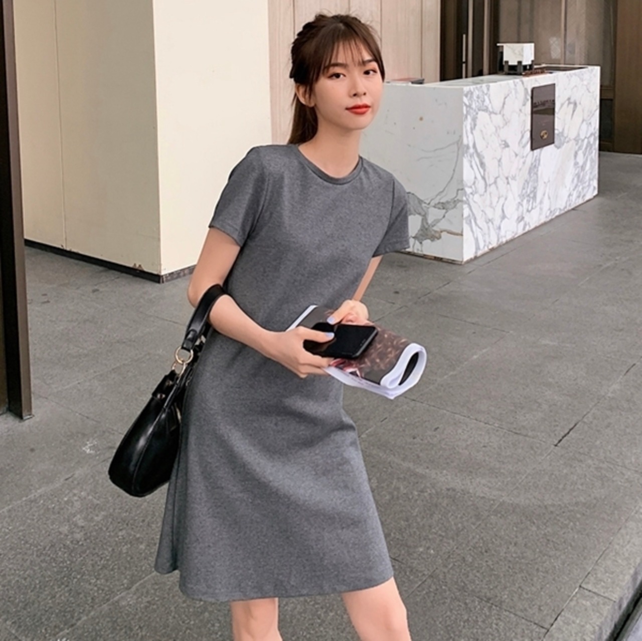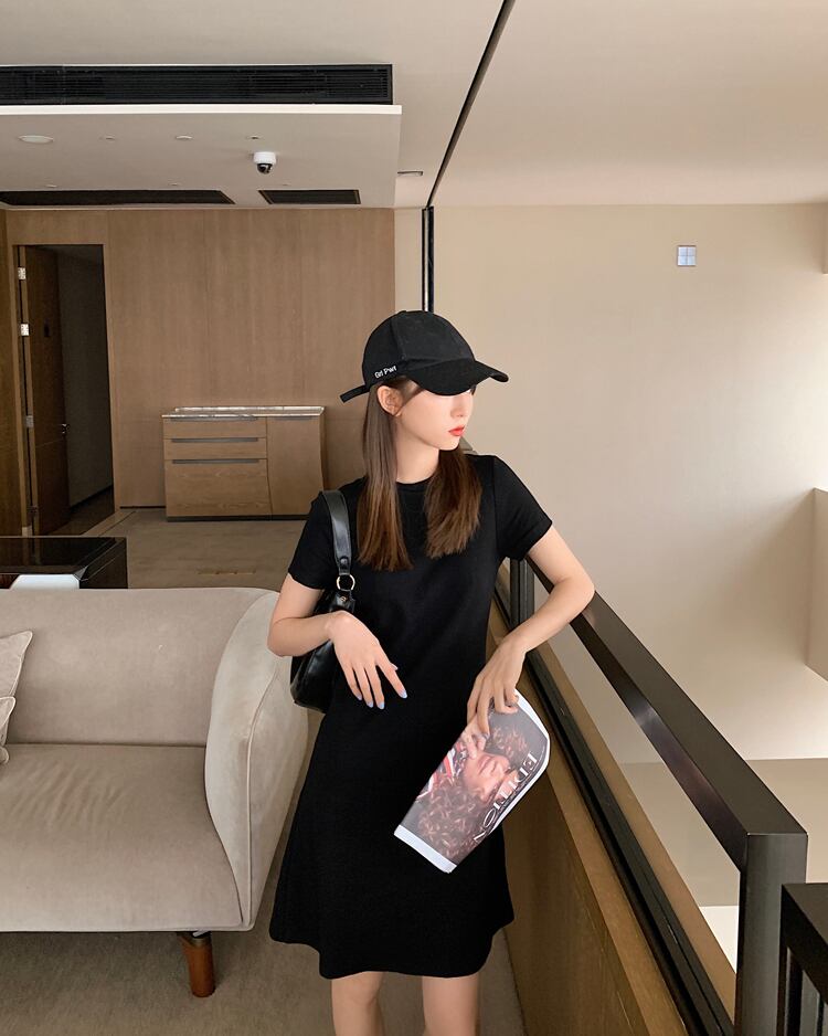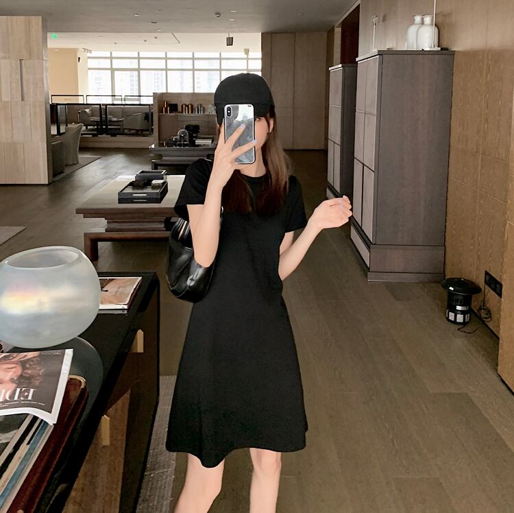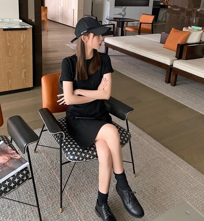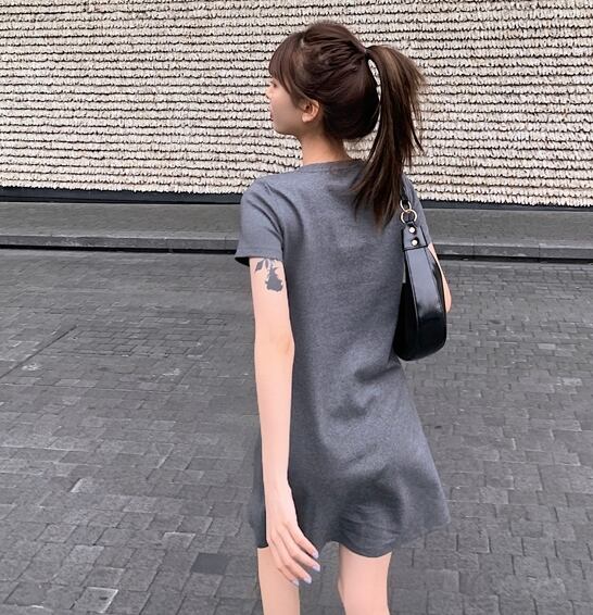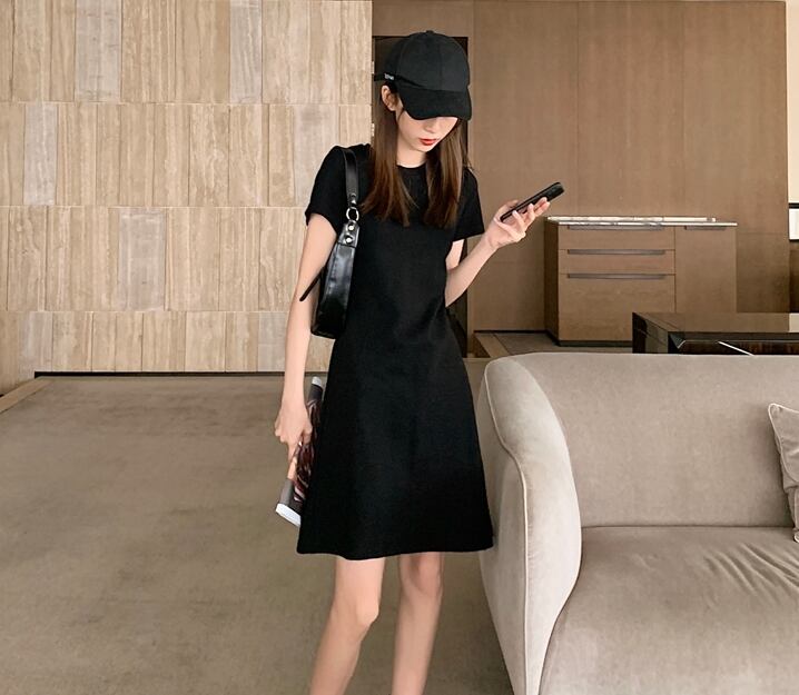 全2色 Tシャツワンピース ワンピース ロングTシャツ 半袖 無地 ゆったり ワンピース ショート丈 シンプル ベーシック カジュアル デイリー クルーネック 夏
