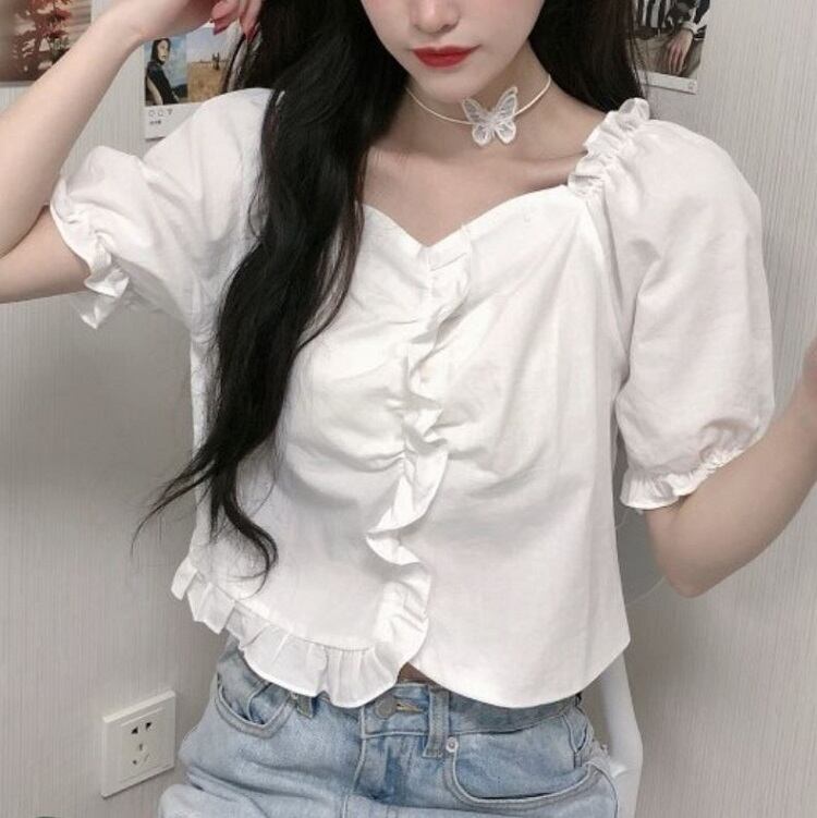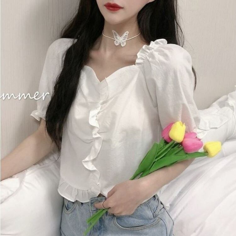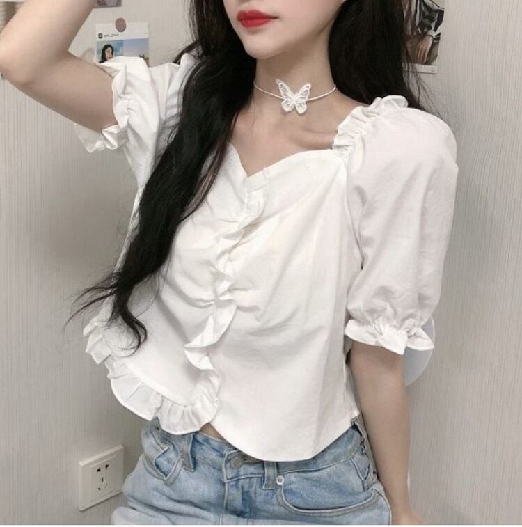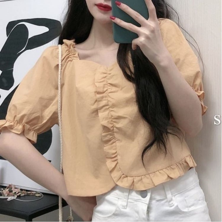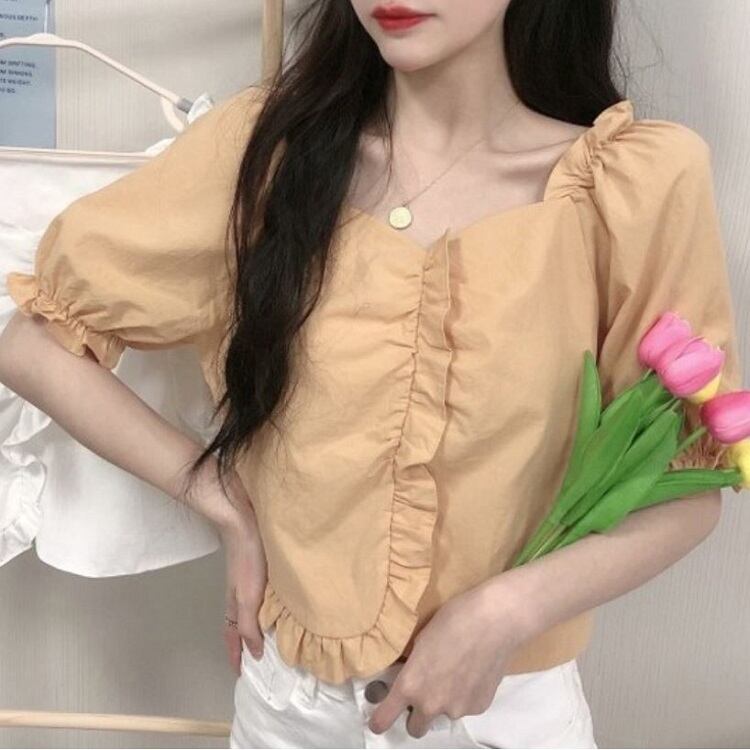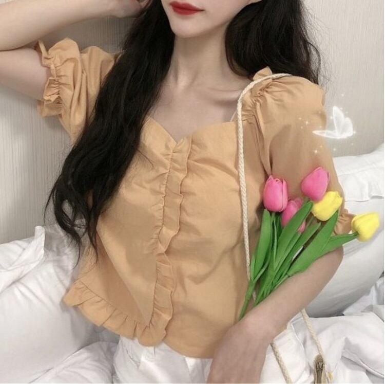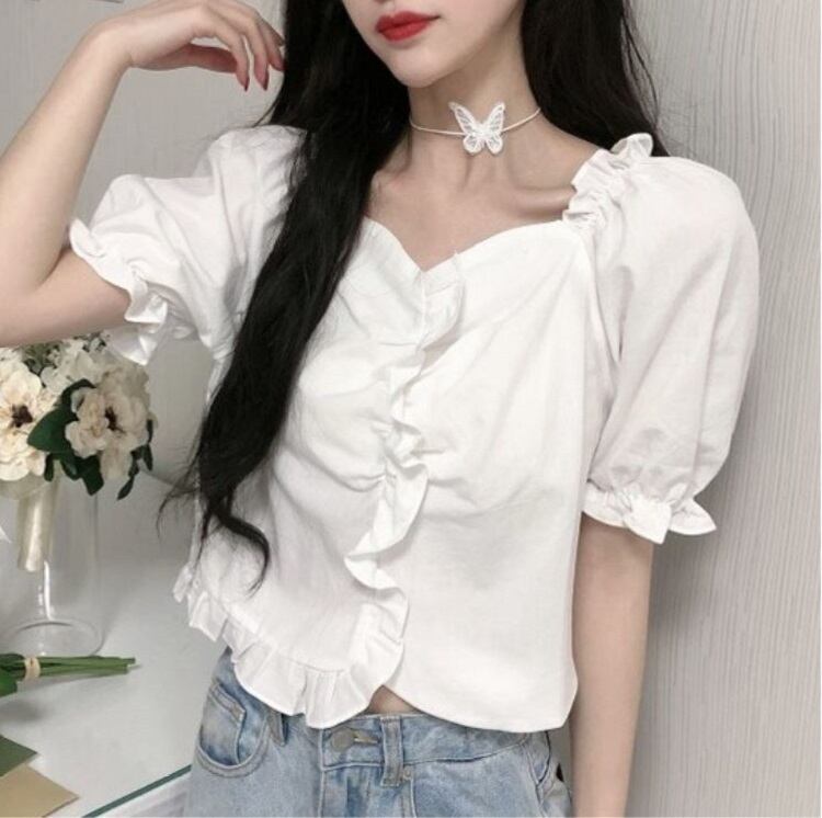 全2色 ショートトップス ブラウス カットソー パフスリーブ 半袖 フリル きれいめ カジュアル 可愛い フェミニン ガーリー お出かけ デイリー 夏 ホワイト イエロー