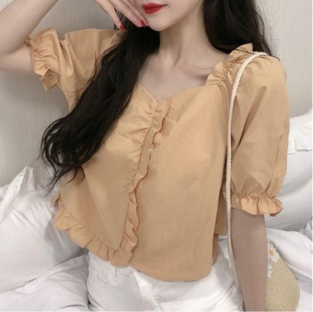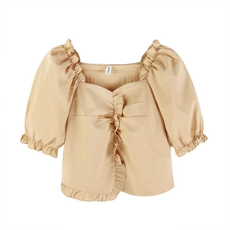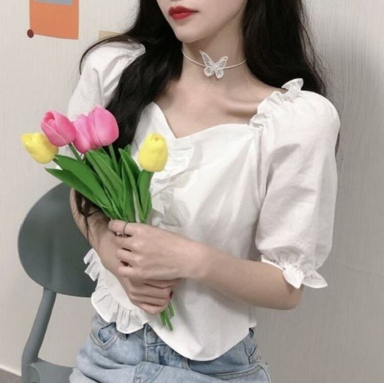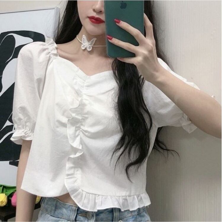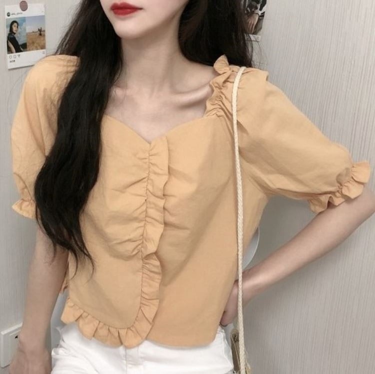 全2色 ショートトップス ブラウス カットソー パフスリーブ 半袖 フリル きれいめ カジュアル 可愛い フェミニン ガーリー お出かけ デイリー 夏 ホワイト イエロー