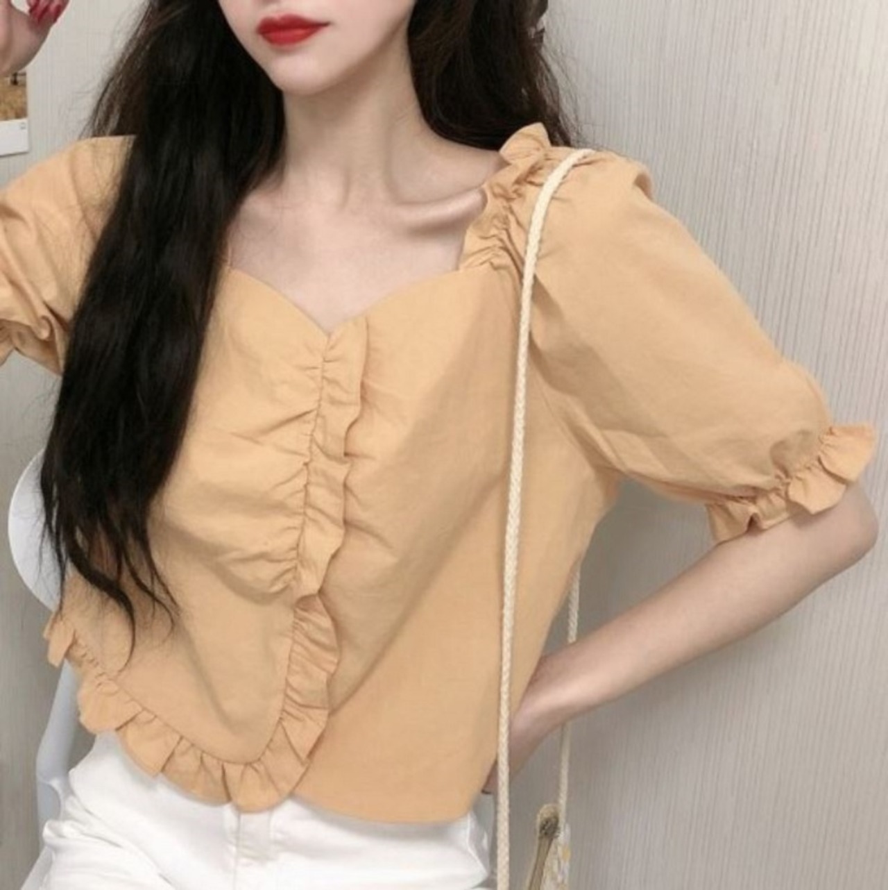 フリル使いが可愛らしいショートトップス。