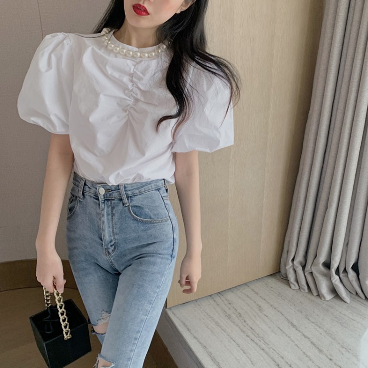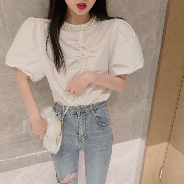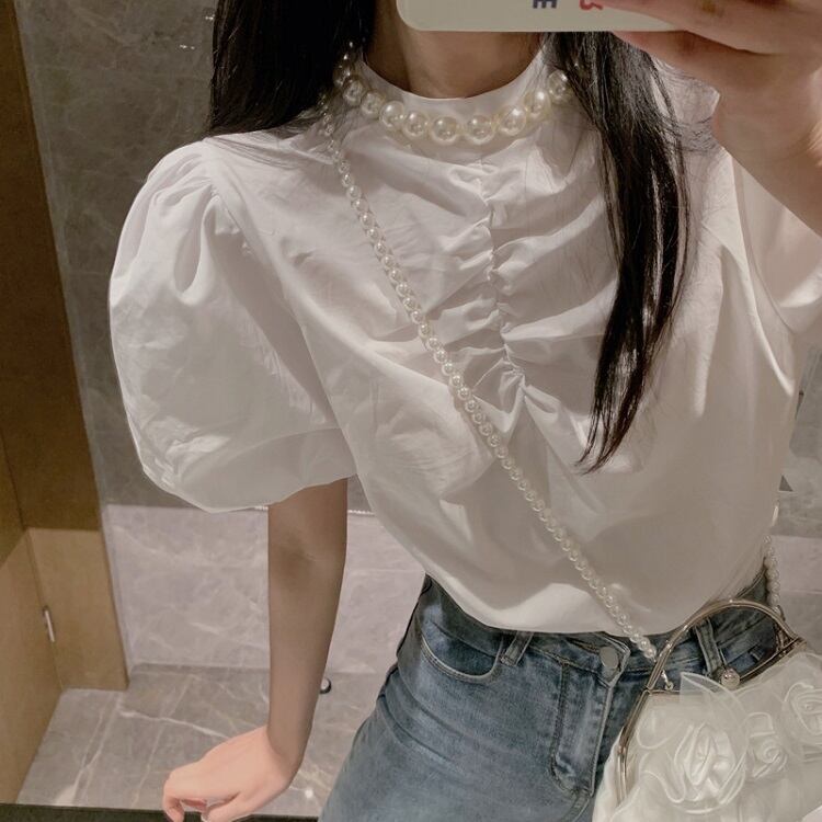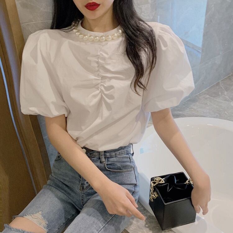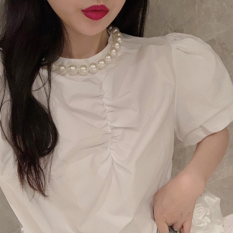ブラウス トップス ラウンドネック 半袖 パフスリーブ パール付き レトロ きれいめ 上品 カジュアル フェミニン お出かけ デイリー デート 女子会 夏 ホワイト